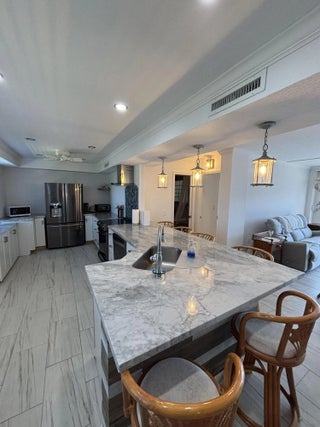 FULLY-FURNISHED PENTHOUSE WITH INTRACOASTAL VIEW! This charmingly updated, two-bedroom, two-bathroom waterfront property boasts 1250 square feet and is move-in ready. This unit features a beautiful marble kitchen island/breakfast bar and stainless steel appliances. The tile flooring throughout gives this freshly-painted home a cool feel against the warm South Florida summers. The balcony is the unit's showstopper, offering stunning views of the intracoastal, the vibrant rising sun, and glowing sunsets. Inlet Harbor Club is a secured gate-accessed complex that provides a heated pool, outdoor grills, a pavilion, and a clubhouse, including a gym and library.