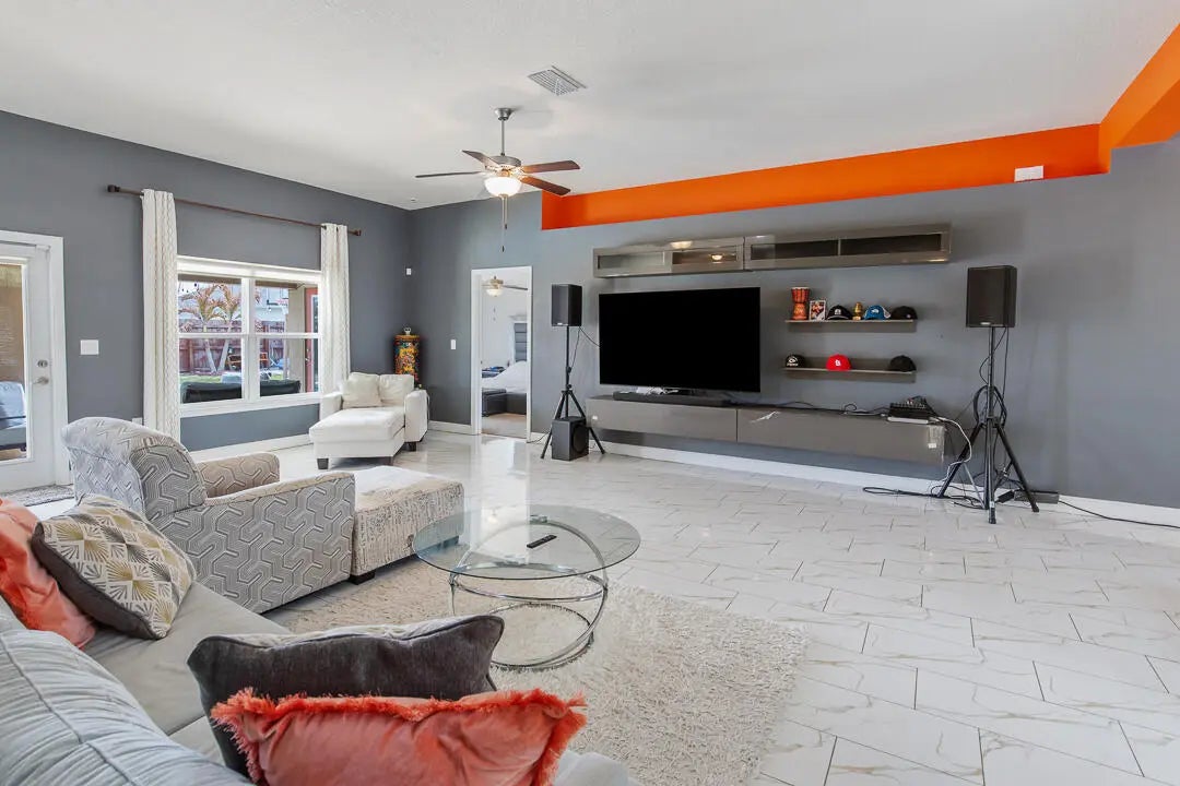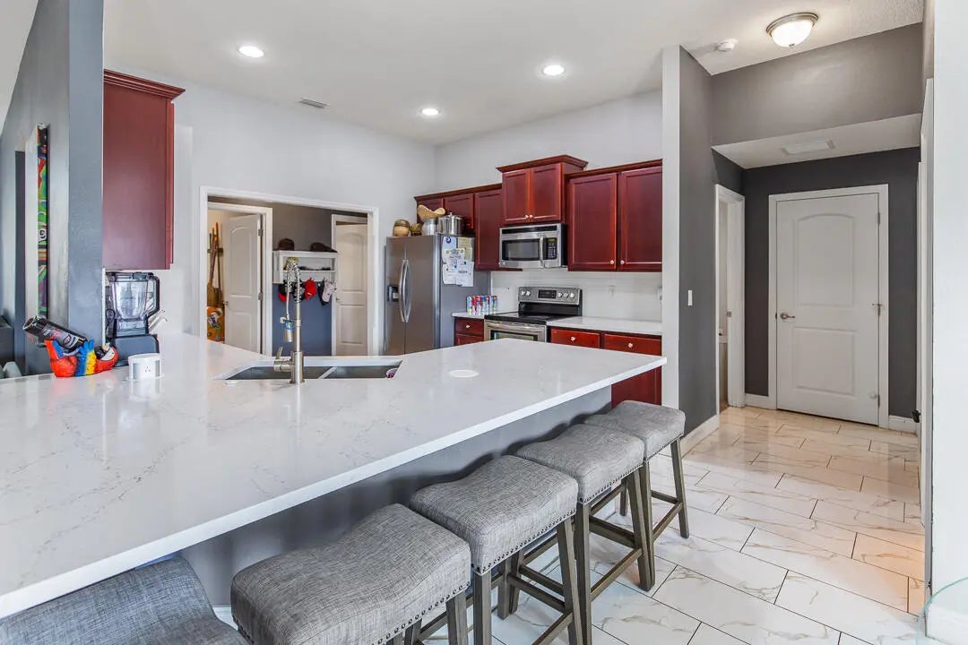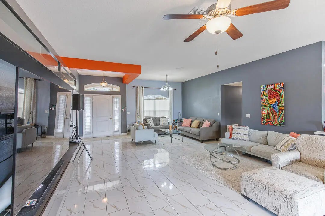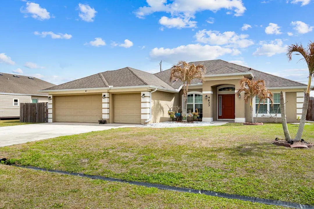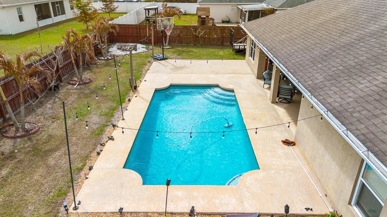 Set on an expansive 0.26-acre homesite, this well-kept 4-bedroom residence with a versatile den offers generous living space and a backyard designed for Florida living. The private fenced yard features a sparkling swimming pool, firepit gathering area, covered lanai, and extended deck space perfect for entertaining or unwinding outdoors. Inside, an airy layout connects the main living areas to the kitchen, which is equipped with stainless steel appliances and ample cabinetry. The primary suite provides a spacious retreat with dual vanities, a soaking tub, separate shower, and direct access to the covered patio. Additional highlights include a 3-car garage, oversized driveway for guest parking, and a covered side area ideal for boat or recreational storage. No HOA restrictions.