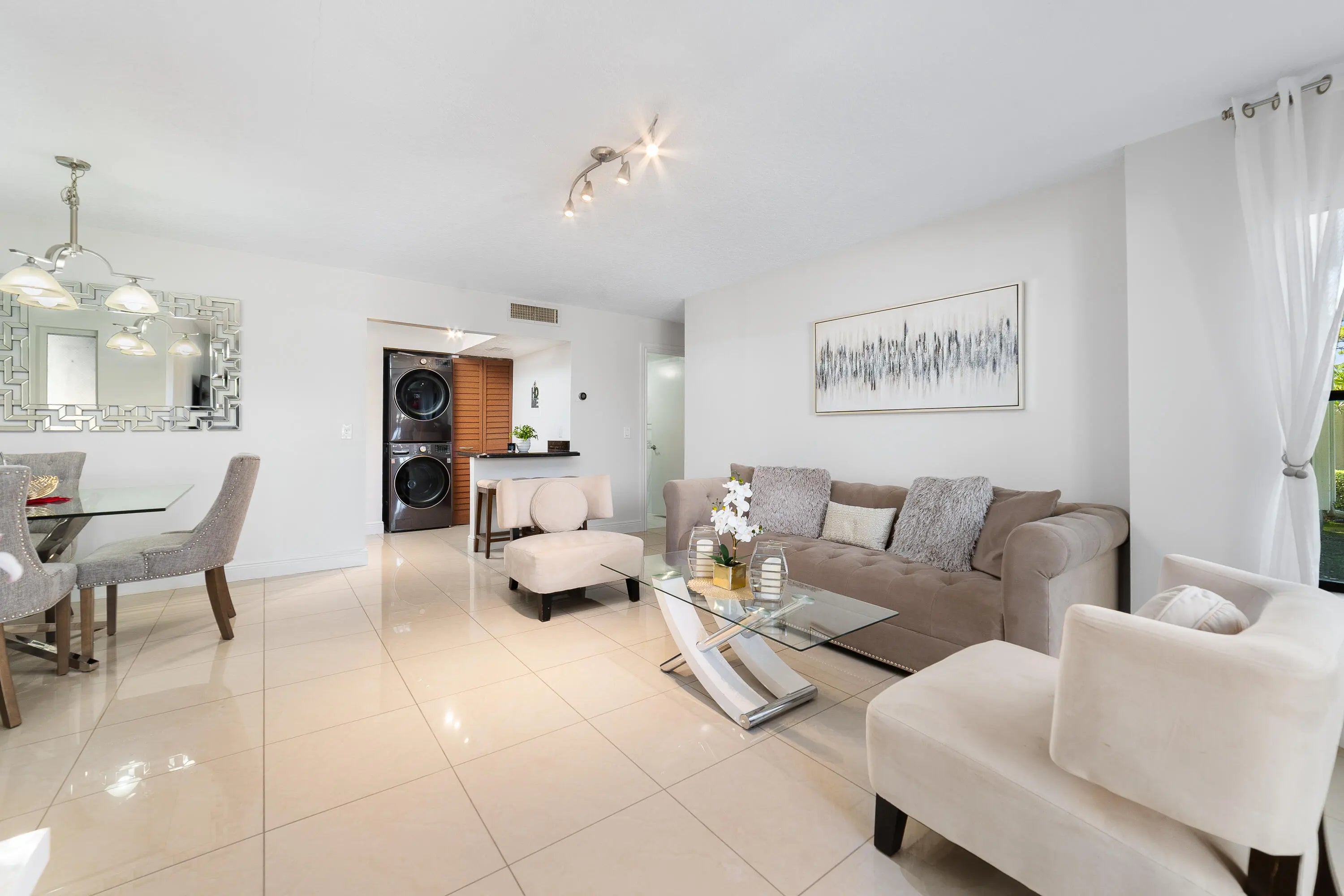 Exceptionally maintained first-floor corner unit offering 3 bedrooms and 2 full baths. This bright residence features porcelain flooring throughout, extra windows that enhance natural light, and accordion shutters for added protection. The kitchen is appointed with granite countertops and stainless steel appliances, while the home also includes a new LG washer and dryer, a newer water heater, and in-unit laundry for convenience. Knockdown ceilings and abundant closet space add to the home's appeal. The well-designed layout creates a comfortable, welcoming atmosphere that is ideal for both everyday living and entertaining. A private screened patio provides a peaceful space to enjoy the Florida weather. Ideally located with easy access to I-95 and the Florida Turnpike, and just minutes from Wellington Mall, Publix, restaurants, shops, banks, beaches, and the vibrant downtown area.