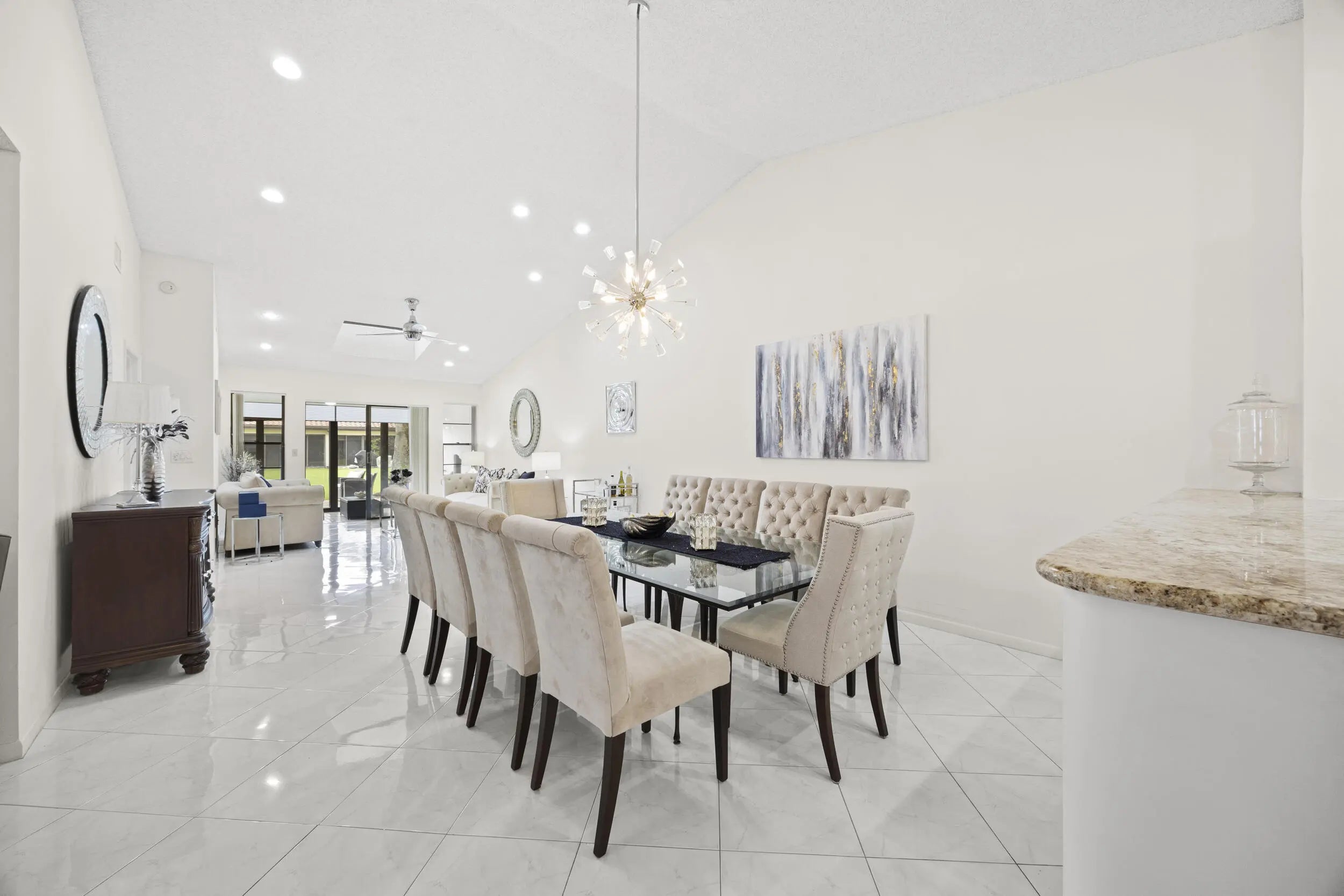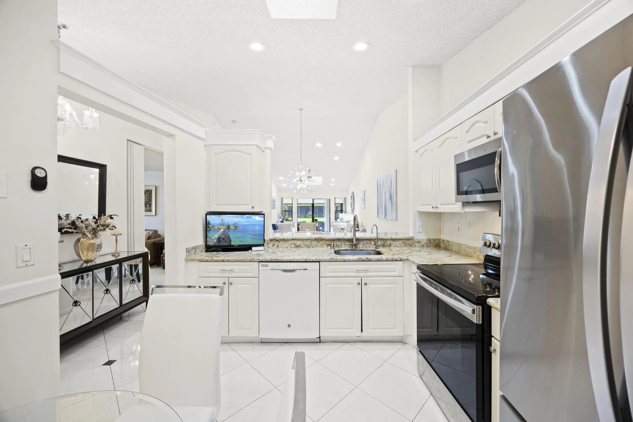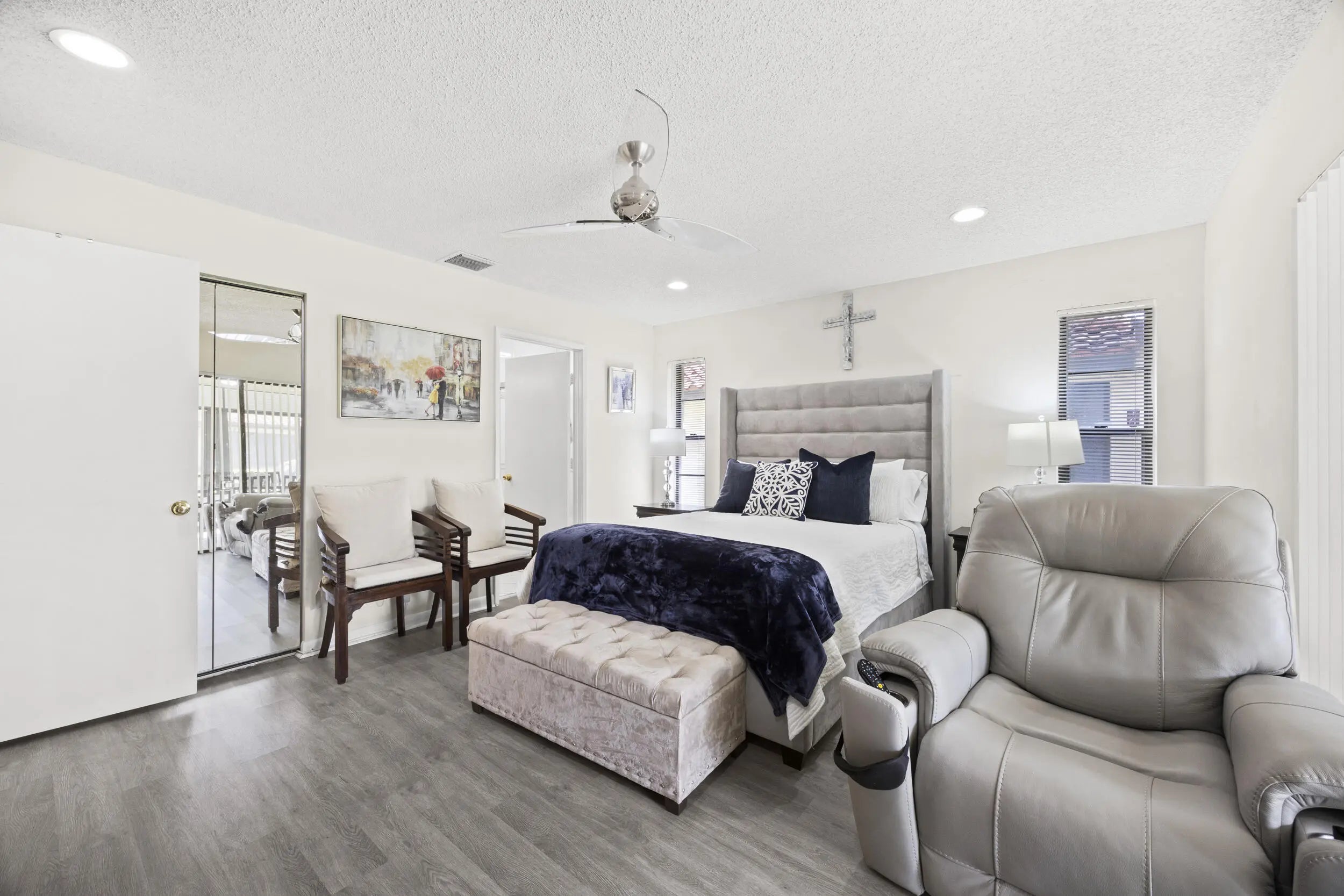 Beautifully updated bright and airy villa featuring high vaulted ceilings and located on a quiet cul-de-sac in the highly desirable Palm Chase Lakes community. This spacious home offers a renovated kitchen with updated cabinetry, granite countertops, and stainless steel appliances. Enjoy an open layout with tile flooring and updated luxury vinyl flooring throughout. The bright glass-enclosed, air-conditioned Florida room provides additional living space perfect for relaxing or entertaining. The primary suite features sliding glass doors, abundant natural light, and a beautifully updated bathroom. Step outside to an extended paver patio—one of the only ones in the community—ideal for outdoor entertaining. Palm Chase Lakes offers a gated entrance, resort-style amenities & much more!