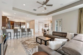 Enjoy breathtaking, expansive lake views from nearly every room in this exceptional luxury residence located in the gated community of The Preserve at Bay Hill Estates. This impressive Cypress Grand model offers 4 bedrooms, 4.5 baths, a den that can serve as a possible fifth bedroom, a dedicated office, and a spacious three-car garage. Built in 2014 with solid CBS construction, the home offers a total of 5,290 square feet, including 4,130 square feet of beautifully designed living space. A large covered exterior foyer with elegant double-door entry welcomes you into a grand interior foyer highlighted by a custom chandelier. The home features tile flooring throughout the main living areas and kitchen, recessed lighting, ceiling fans, and crown molding that enhance the refined interior sophistication throughout. Additional features include two A/C units, indoor and outdoor surround sound, a paver driveway, and a fully fenced backyard with a private pool—perfect for relaxing or entertaining while enjoying the tranquil lakefront setting.