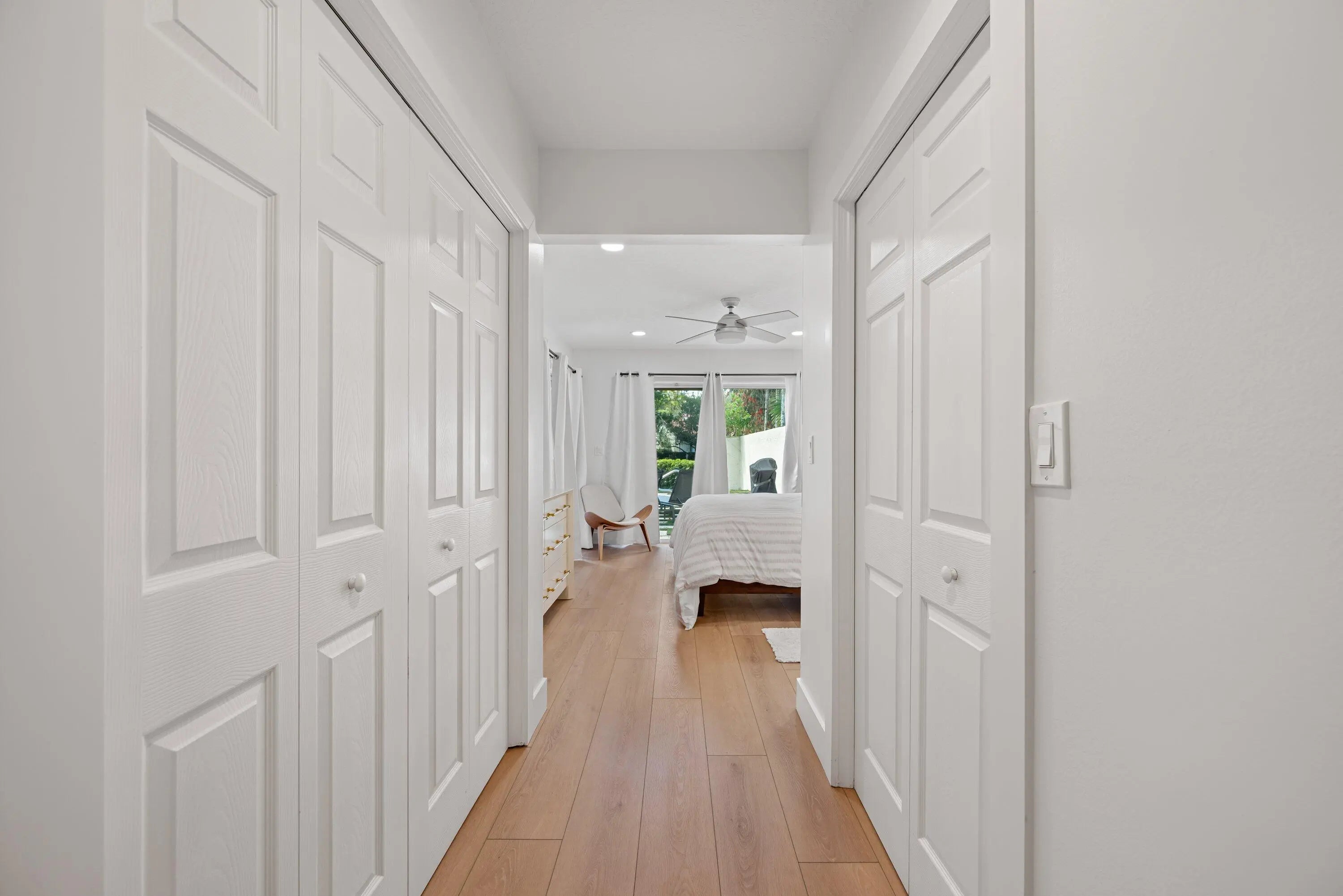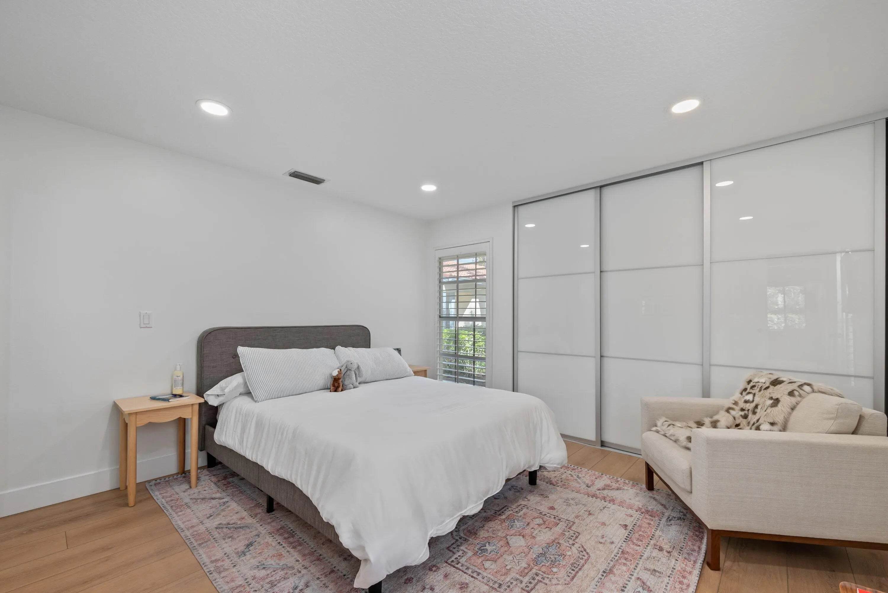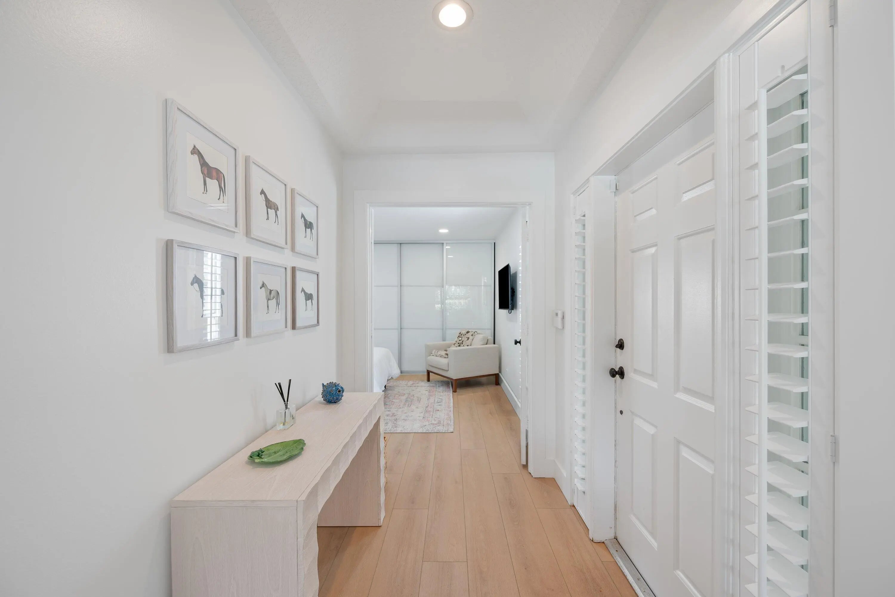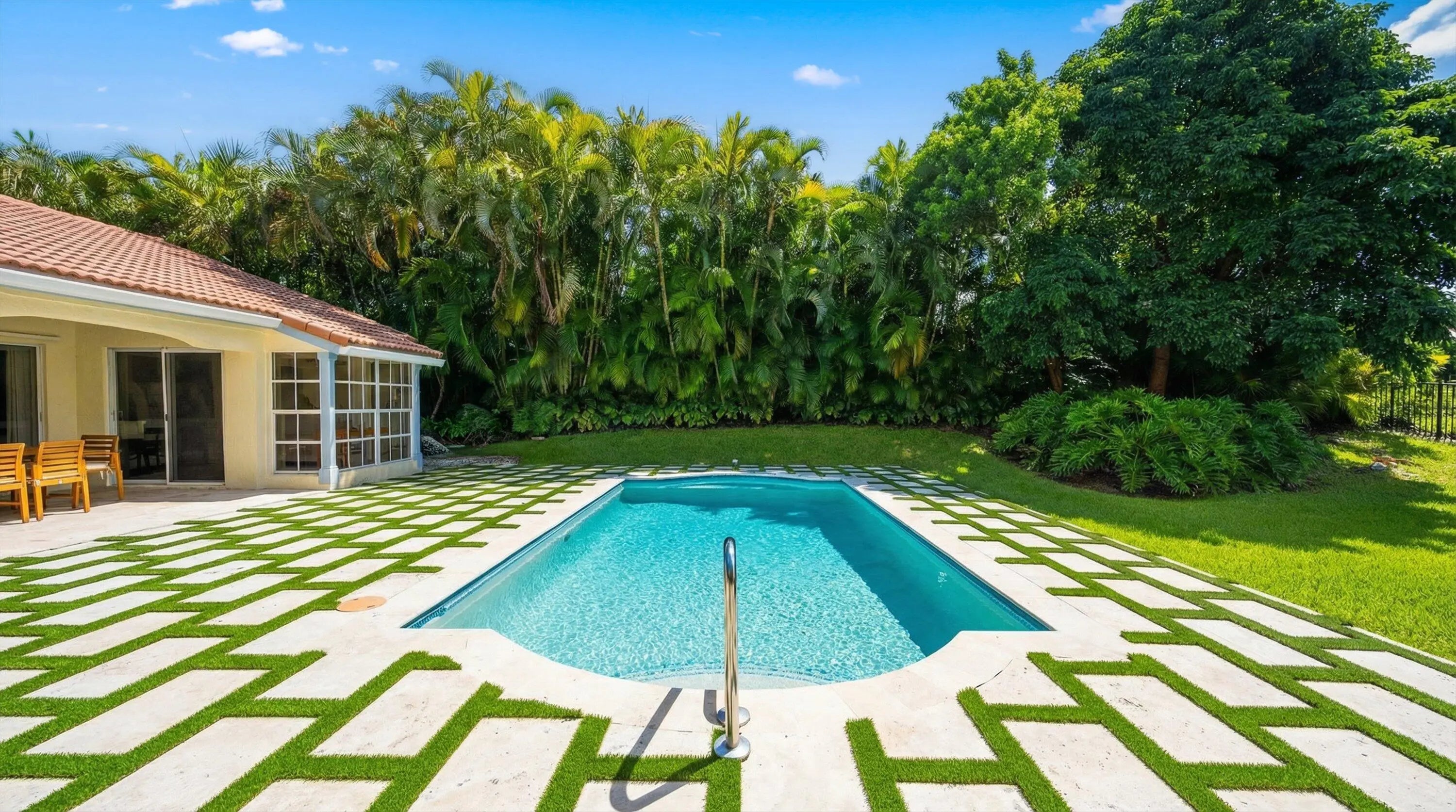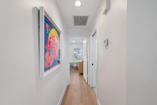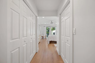 Palm Beach-chic villa bungalow — a clean, sophisticated turn-key gem. Step through the front door and immediately notice thoughtful details that add charm and warmth: crisp white wood-plank ceilings, plantation shutters, and curated pops of color that keep the palette fresh and inviting. An open-concept layout maximizes natural light and effortless flow between living, dining, and entertaining spaces. The serene, fully fenced outdoor oasis is the home's focal point — a heated pool and covered patio designed for year-round relaxation and seamless indoor-outdoor living. Both the main living area and the primary suite enjoy direct sightlines and easy access to the pool, creating a private retreat feel. Updates include stylish new flooring, renovated bathrooms, and tasteful decor throughout, so you can move in with confidence. Situated on an end lot for maximum privacy, the generous fenced yard provides space for entertaining guests, play and pets. This bungalow blends elegant Palm Beach style with modern convenience — a rare, ready-to-enjoy find.