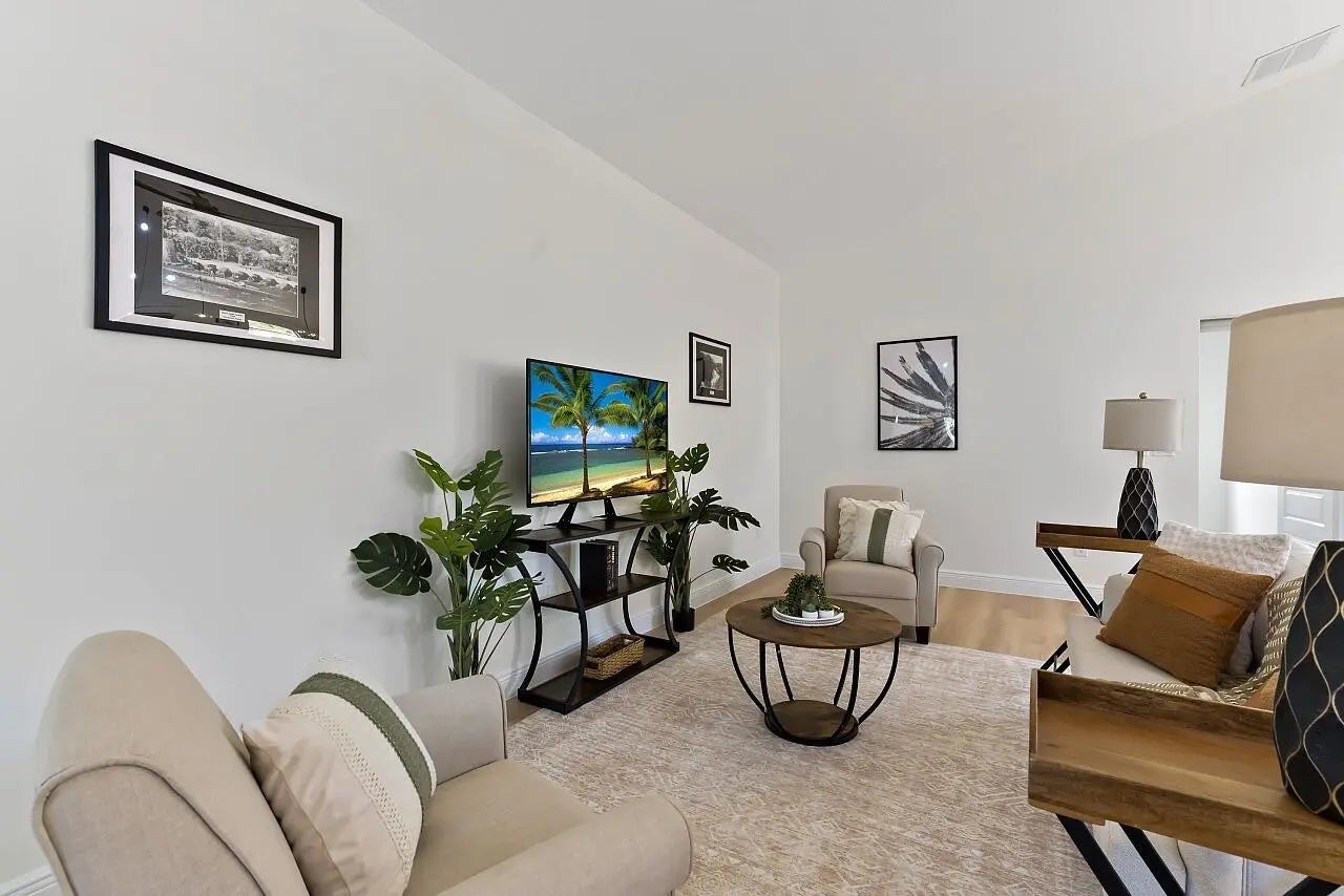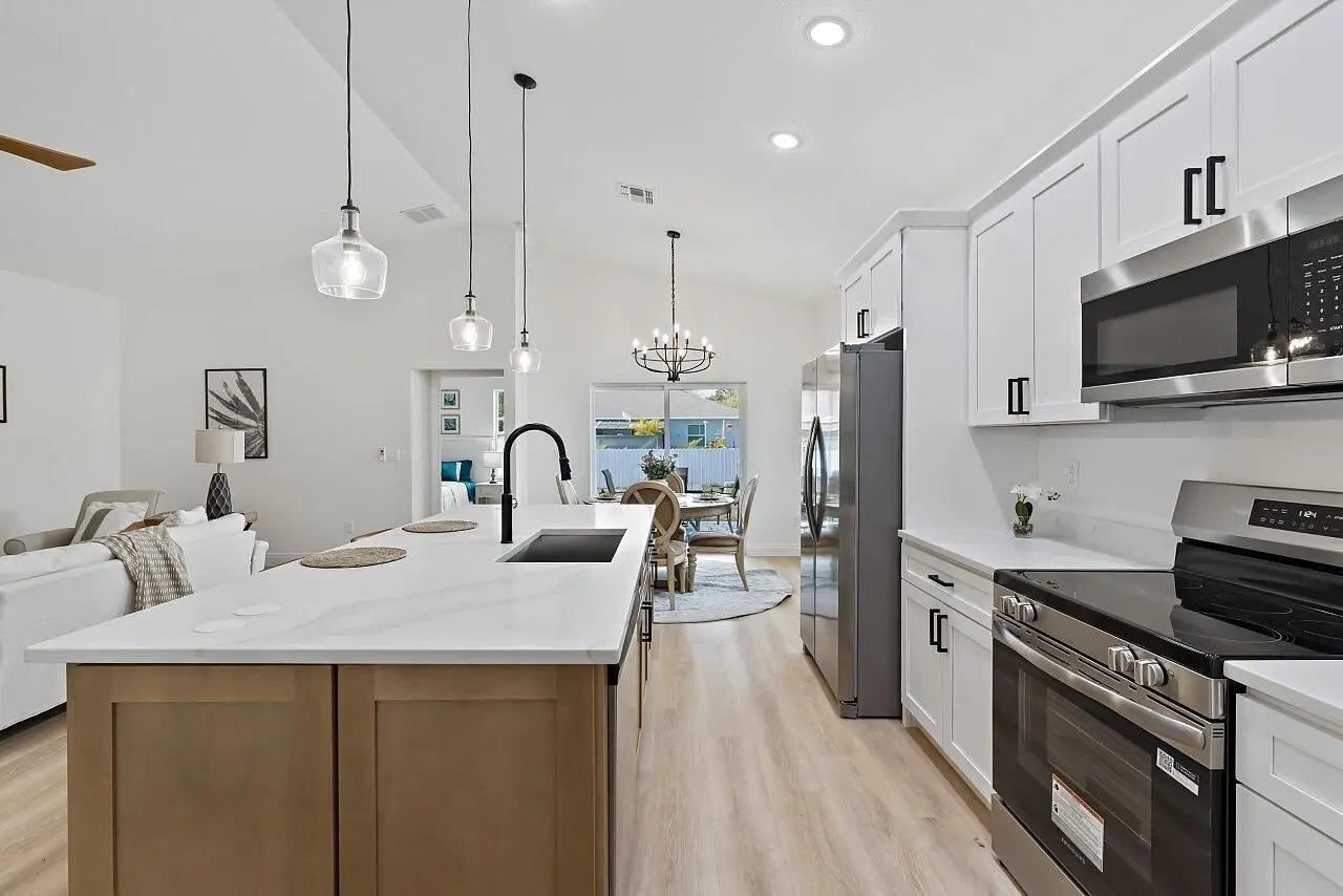 HDZ Homes presents the Acacia Model a refined blend of modern design, architectural flow, and everyday luxury. Set in Vero Lake Estates with NO HOA, this brand-new CBS-constructed 3-bedroom, 2-bath, 2-car garage home offers 1,539 sq ft of living space with 2,284 total sq ft including a covered porch and covered entry. The open-concept Great Room (15'5'' x 19'4'') with vaulted ceilings creates a bright, expansive feel that flows seamlessly into the designer kitchen and dining area. The kitchen features quartz countertops, soft-close craftsman cabinetry, matte black hardware, a full stainless appliance package, pendant lighting, recessed lighting, and a large island with built-in pop-up fast-charging outlets perfect for entertaining, working from home, or busy modern life. The primary suite (15' x 13') is a true retreat, offering a walk-in closet and spa-inspired bath with custom tile shower, sleek black fixtures, and dual anti-fog backlit LED mirrors with adjustable lighting for both mood and function. Two additional bedrooms are thoughtfully placed for privacy and comfort, ideal for guests, family, or office use. Step outside to your 11'4" x 11'8" covered porch, perfect for outdoor dining, grilling, or relaxing in the Florida breeze. With no HOA, enjoy true freedom bring your pets, keep chickens, park your toys, and live the lifestyle you want. Beautifully built. Smartly designed. Ready to be lived in. Buy NEW.