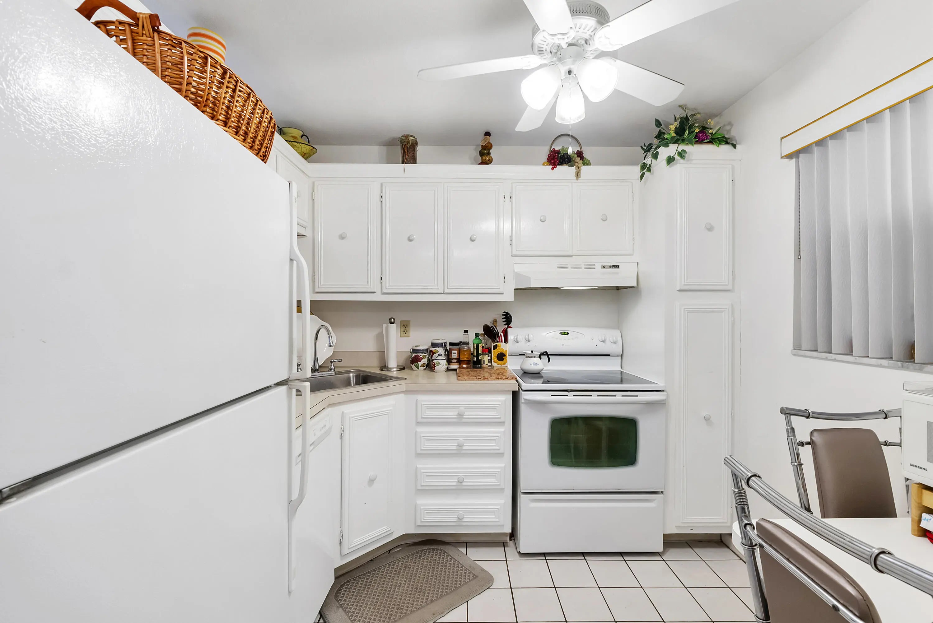 Former model corner unit in a desirable 55+ community w/ beautiful golf course views! This spacious condo offers larger bedrooms than most units, including a large primary suite w/ a walk-in closet and generous storage throughout. Enjoy plantation shutters, a bright layout, and a screened patio with roll-down shutters which are perfect for relaxing and taking in the view. The second bathroom features floor-to-ceiling tile, a new vanity, and new toilet. A/C replaced in 2021 for added peace of mind. The unit is being sold fully furnished for convenience. Step outside and enjoy the unique ability to plant your own garden just beyond the patio. Community laundry facilities available. Fannie Mae & Freddie Mac approved w/ full reserves. Great opportunity to make this well-located condo your own!