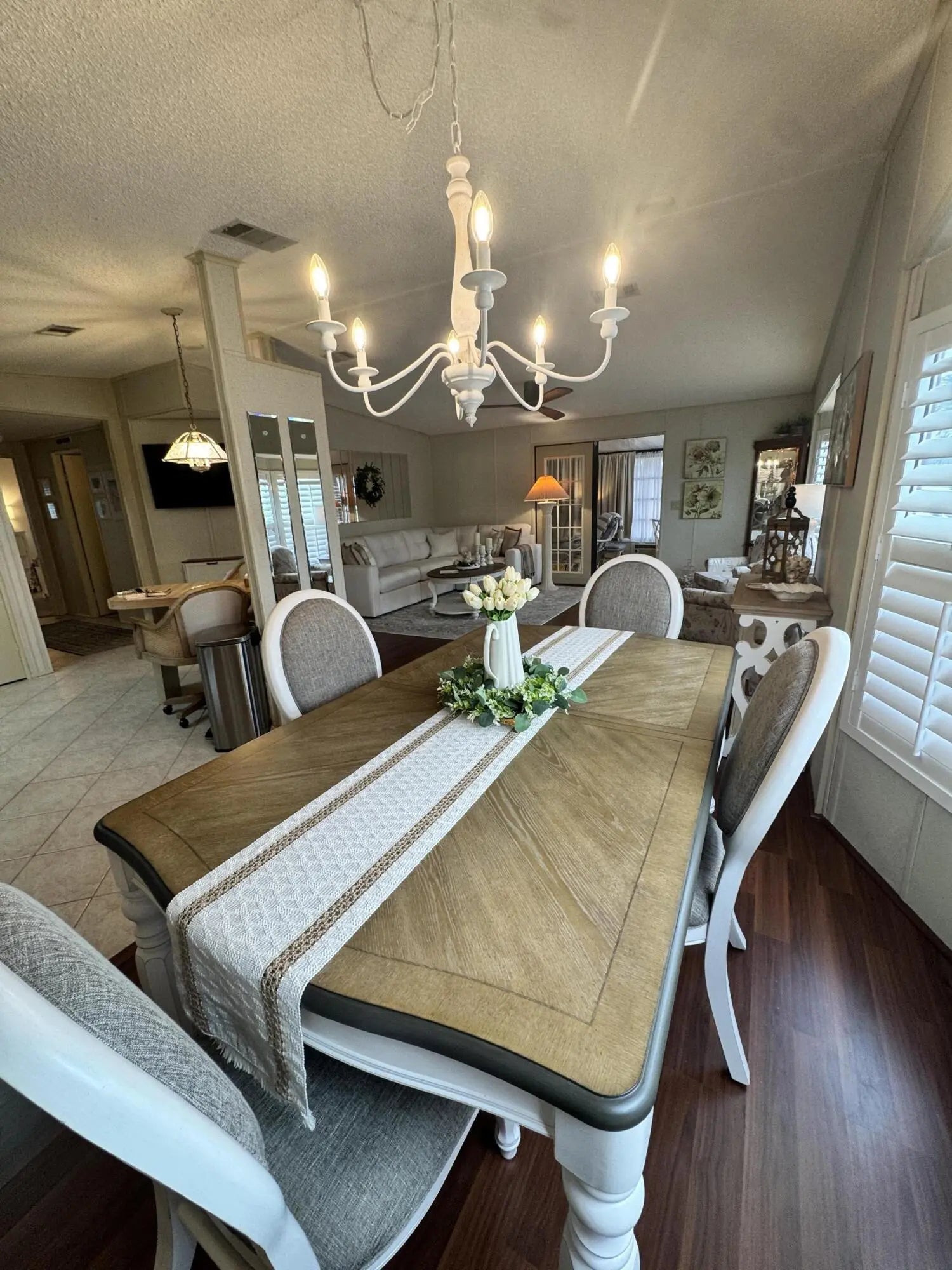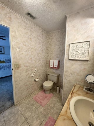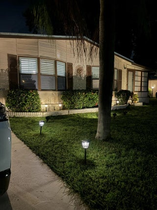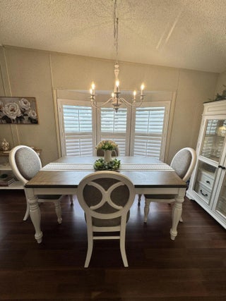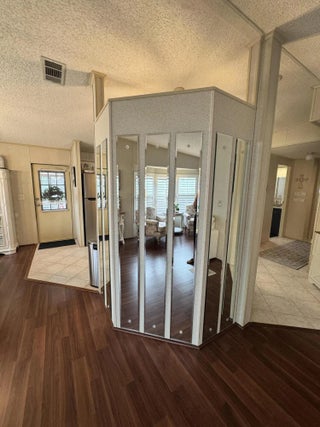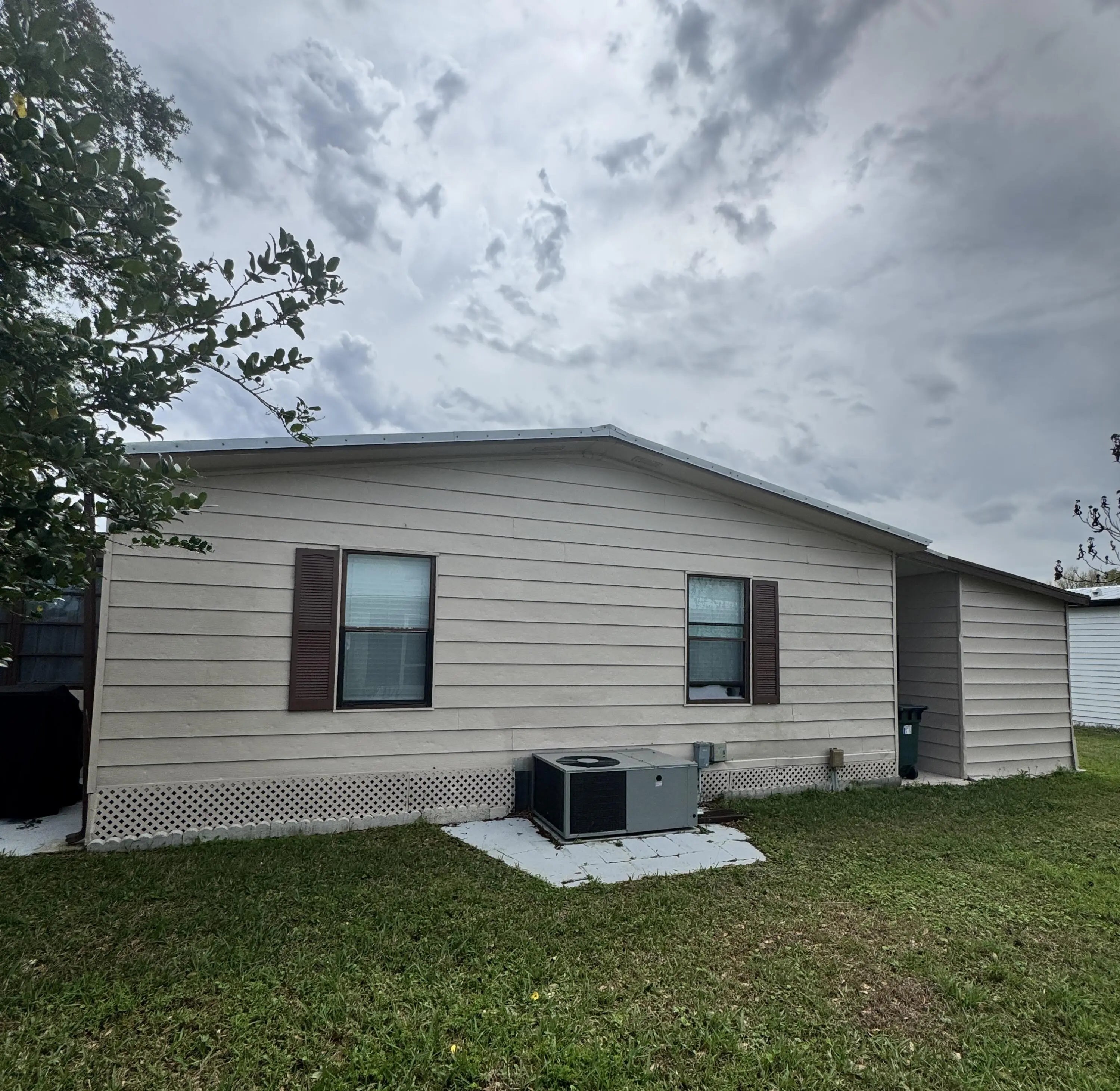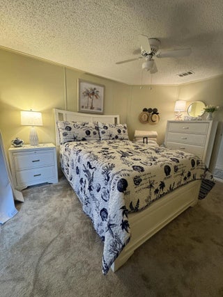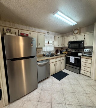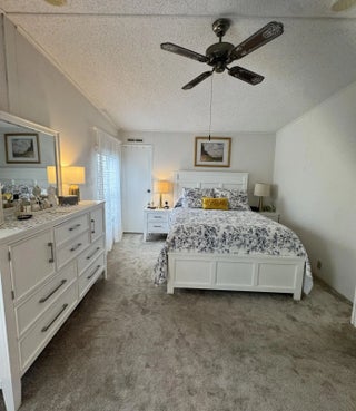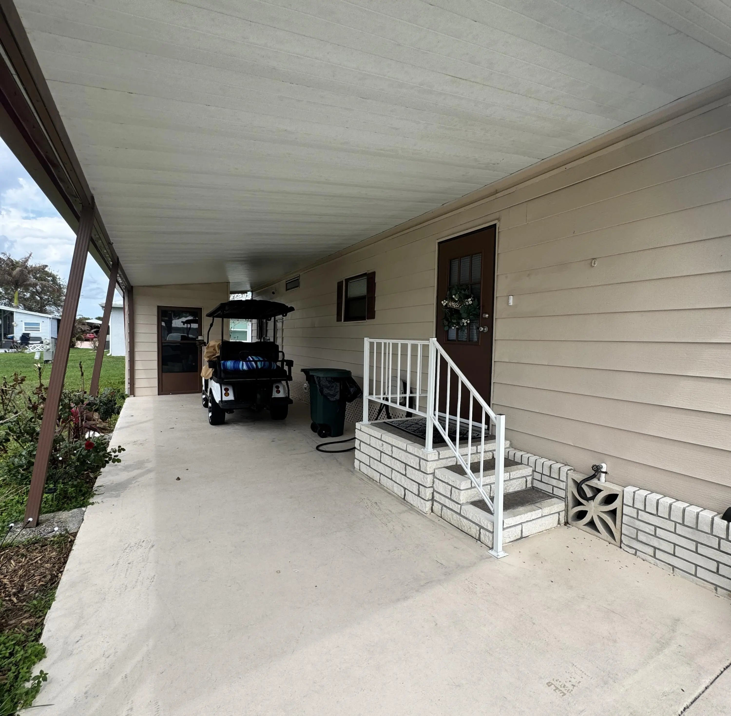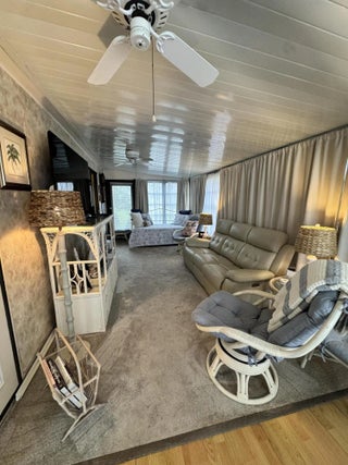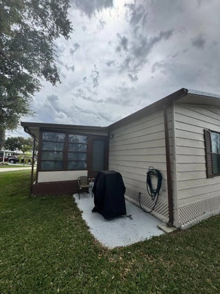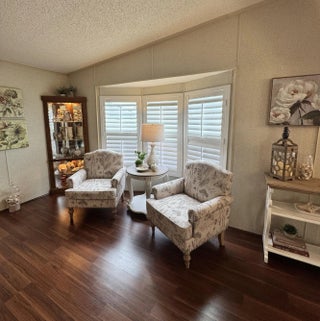 Lovely 2-bedroom 2-bath home in the 55+Spanish Lakes Fairways community. Home sits on a very quiet cal da sac street located at the beginning of the park. The home has carpet, tile, and laminate floors. Metal roof installed in 2025 with new gutters. A/C installed in 2021. The kitchen is open, with a bar/kitchenette. Refrigerator and Dishwasher are 2025. The laundry room is inside the home. The home has plantation shutters throughout. Lovely lania with windows and an A/C unit for enjoying morning coffee or evening cocktails. The land lease includes lawn maintenance, trash removal, and golf. The community features two pools, tennis, pickleball, bocce ball, shuffleboard, groups, social activities, billiards, cards, and a longevity center for working out. Motivated Seller! Bring us an offer.