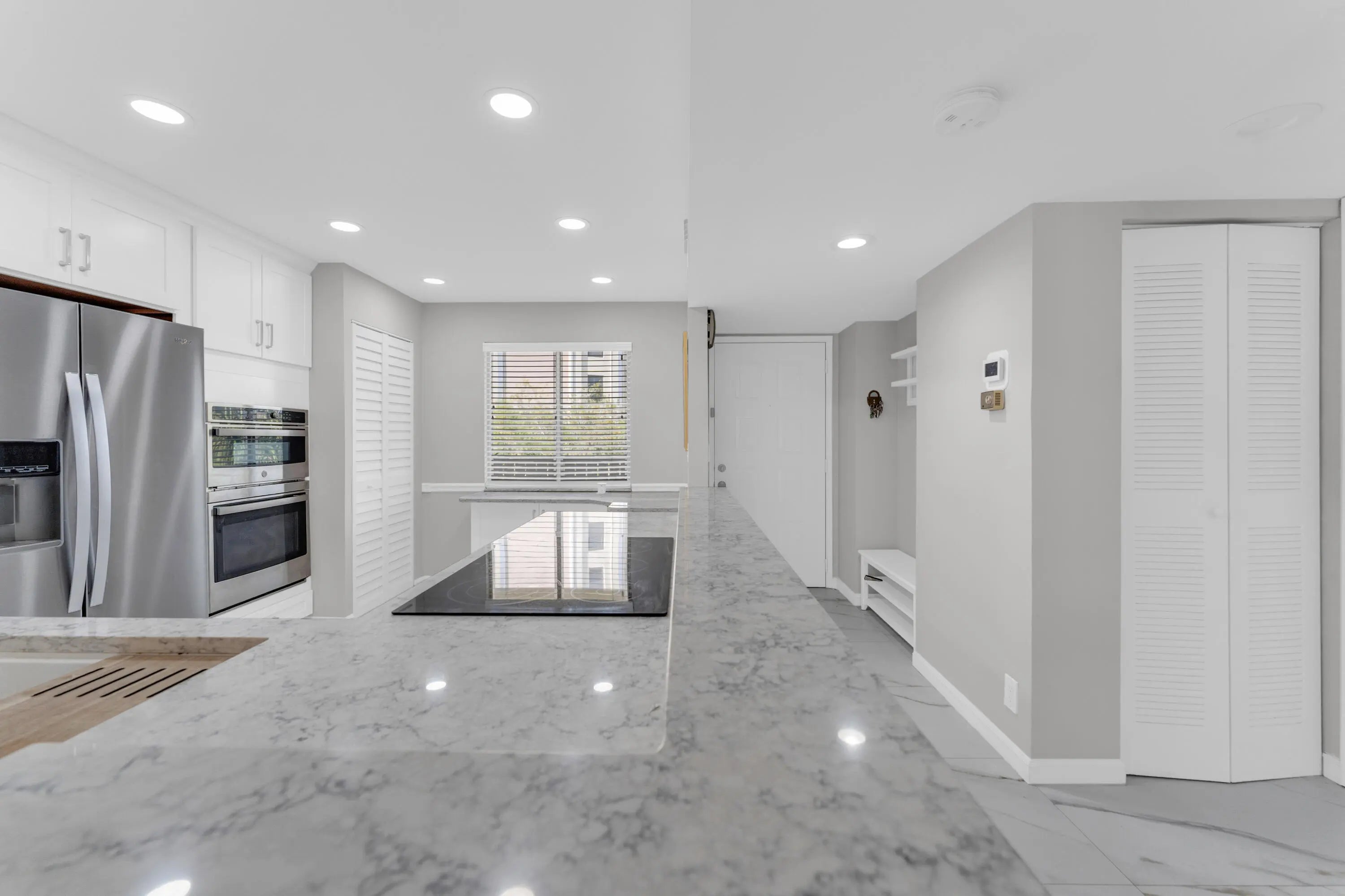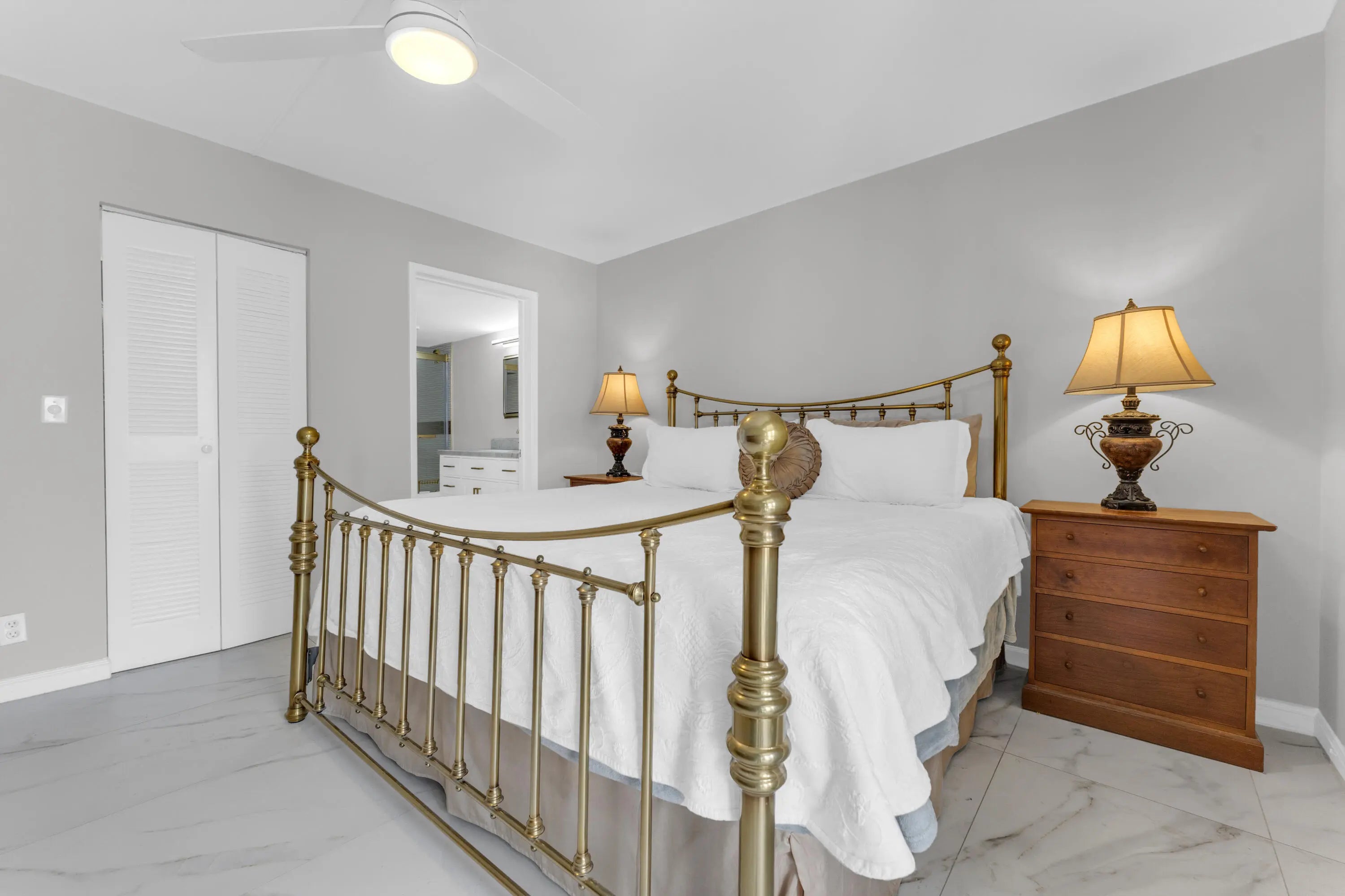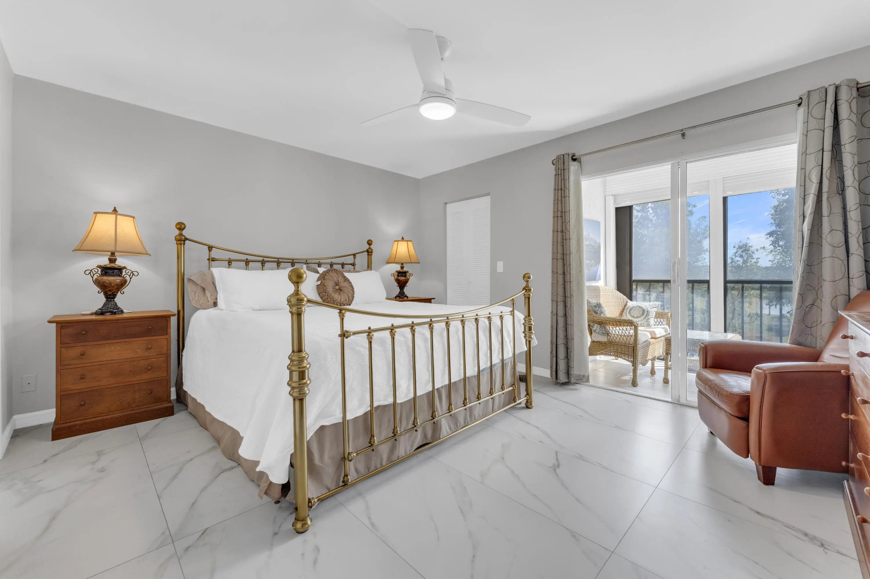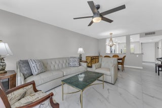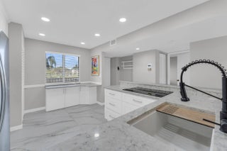 Welcome to this condo w/ stunning pond and lake views. Upon entering, you are greeted by a gorgeous, custom-designed open kitchen that is truly a chef's dream. It features an abundance of new cabinets with pullout drawers, beautiful quartz countertops, and newer appliances, including a built-in wall oven and microwave with convection features and a cooktop range.The interior boasts beautiful oversized porcelain tiles throughout and was recently updated with fresh paint, new baseboards, and new ceiling fans. The popcorn ceilings have also been removed. Both bathrooms have been completely remodeled with new showers, flooring, vanities, toilets, and accessories. Additionally, both bedrooms include closet organizers for your convenience. Gorgeous long lanai w/ serene pond and lake view.