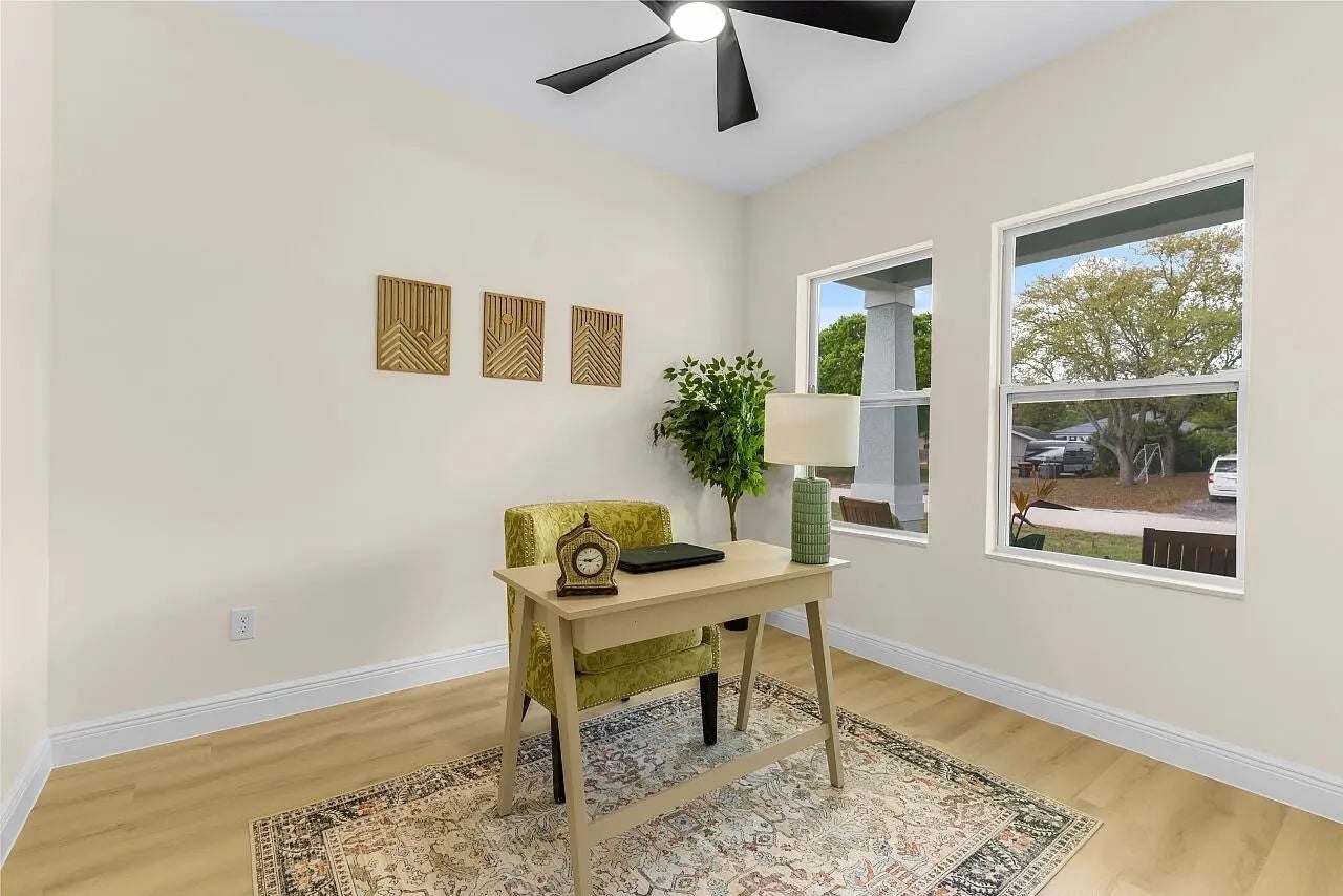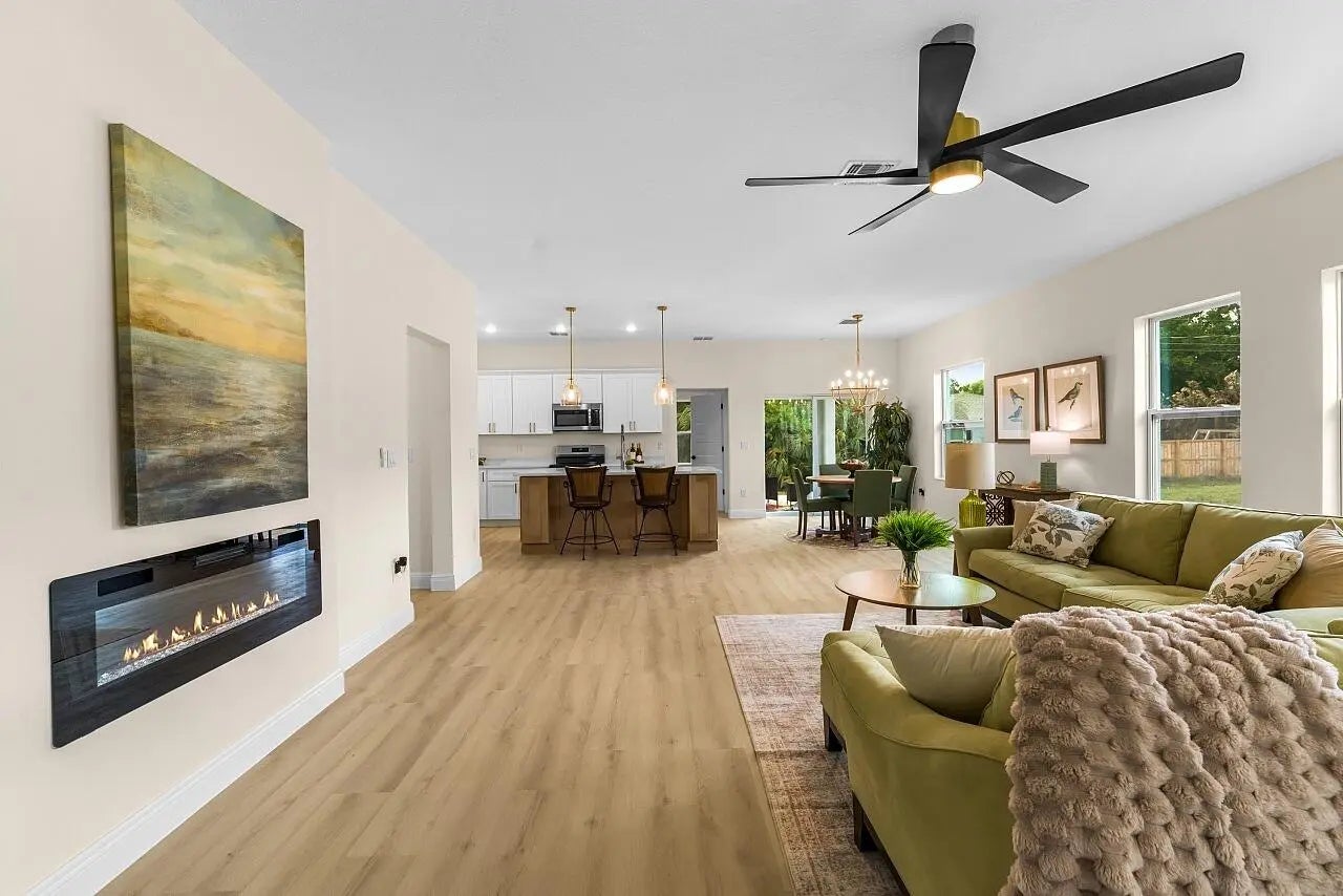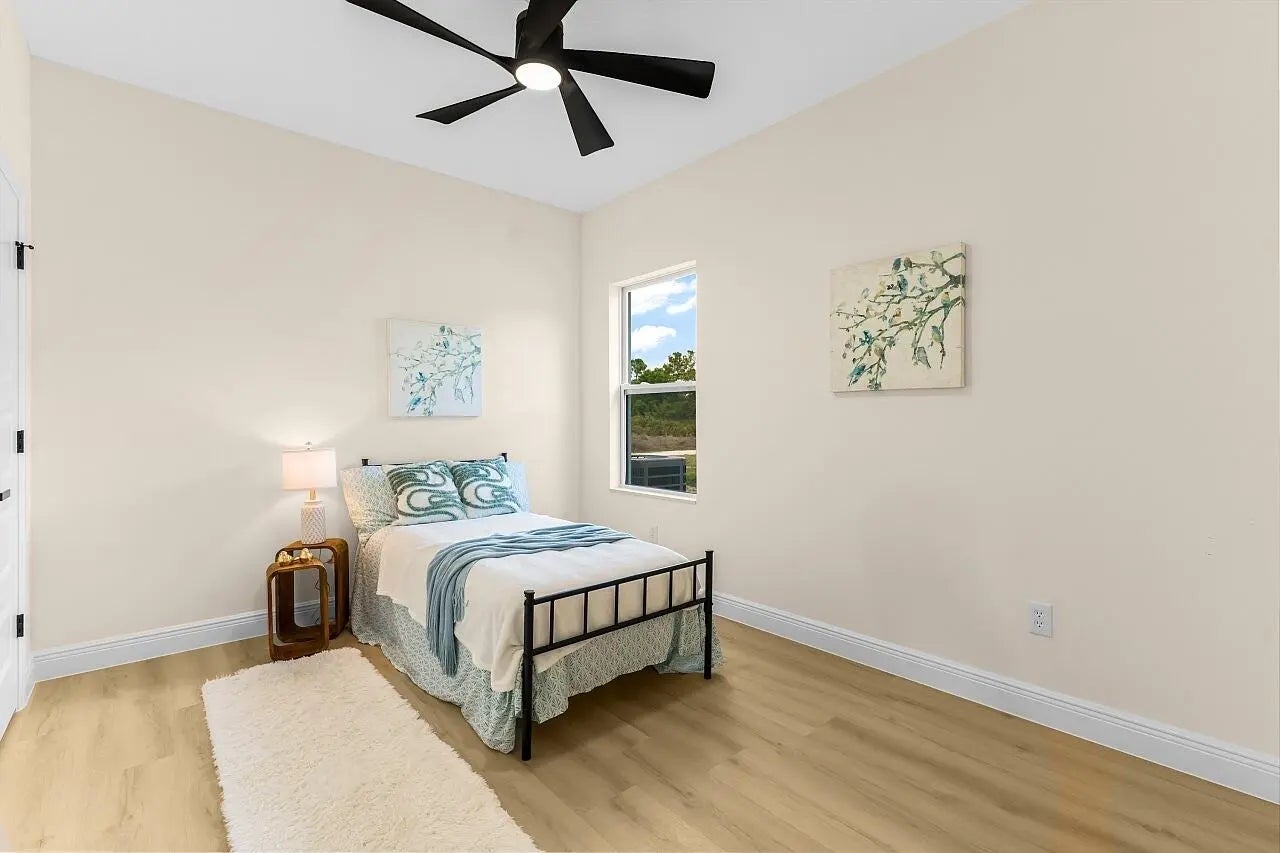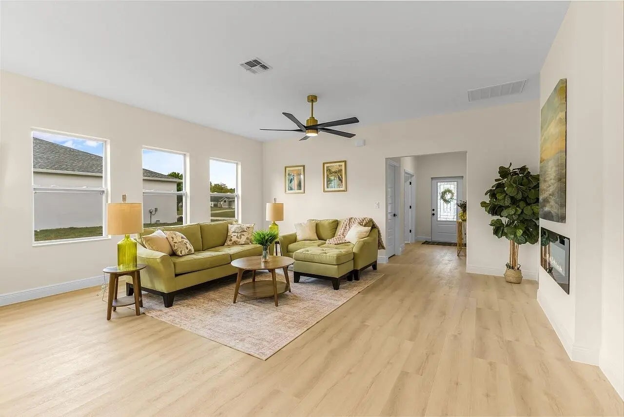 Brand-new 2026 Blackwood Plan by HDZ Homes located in popular Vero Lake Estates with NO HOA. This thoughtfully designed CBS home sits on a spacious .22-acre lot, offering room to spread out and enjoy the relaxed Florida lifestyle. Inside you'll find 3 bedrooms plus a flex/den with French doors, perfect for a home office, guest space, or hobby room. The open-concept living area features beautiful oak-tone luxury vinyl plank flooring, custom designer paint, and 9-ft ceilings that create a bright, welcoming atmosphere. The kitchen showcases quartz countertops, modern cabinetry, and a full appliance suite, ideal for everyday living and entertaining. One of the standout features is the huge laundry room, large enough for a side-by-side washer and dryer and complete with a granite-topped utility sink cabinet for added convenience. Additional highlights include impact windows, designer lighting, ceiling fans, and energy-efficient construction. Enjoy the freedom of no HOA living while being just minutes from Sebastian, Vero Beach, shopping, dining, and the Treasure Coast beaches.