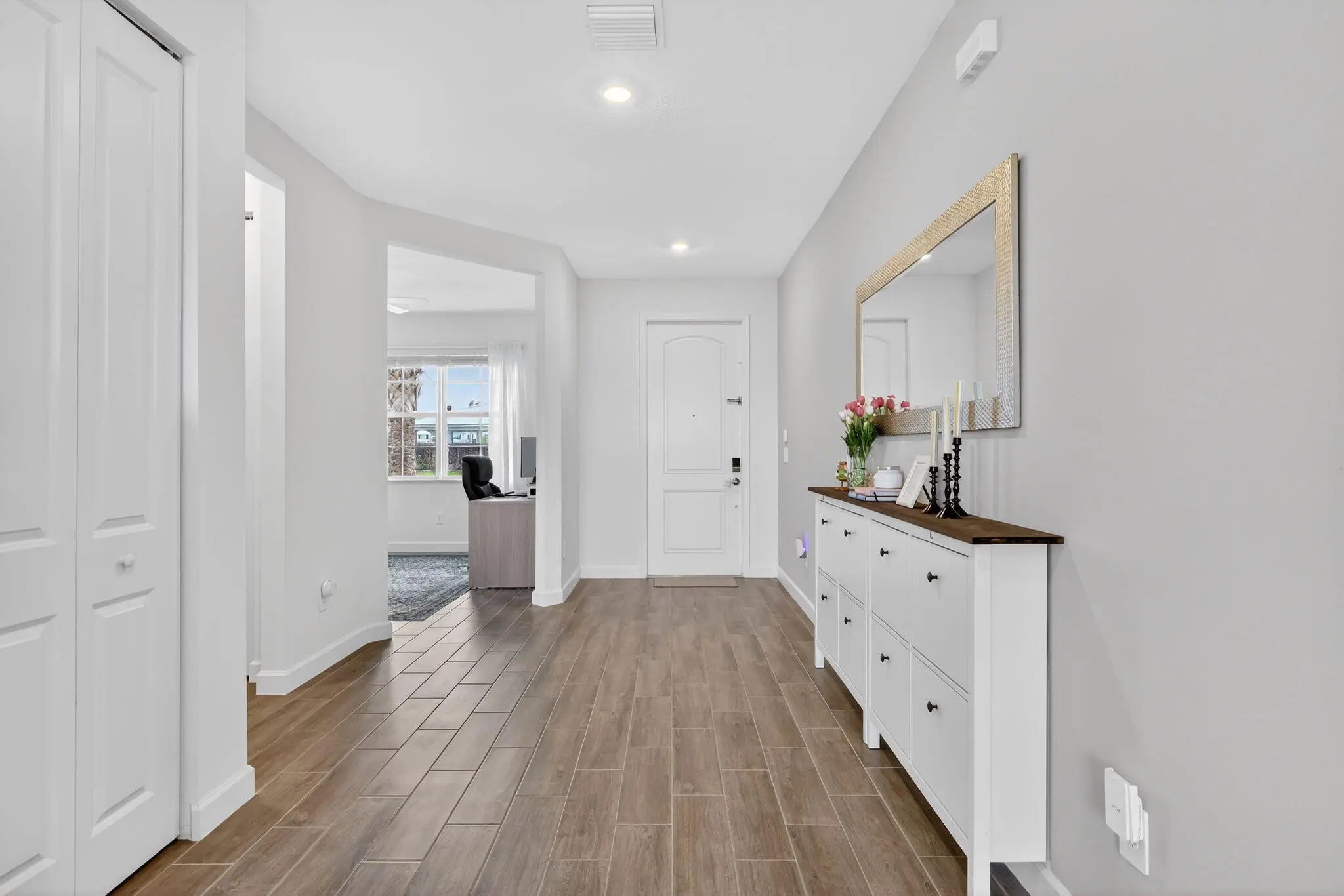 Move-in ready 2024 new construction home in Port St. Lucie's Central Park community. This residence features hurricane impact doors/ windows , a 3-car garage, and a bright open-concept design. The floor plan includes 4 spacious bedrooms, 2.5 bathrooms, a dedicated home office, and a versatile upstairs loft ideal for a second living area or media room. Modern finishes and natural light flow throughout the seamless living and dining spaces. The exterior is enhanced with a screened-in patio and a fully fenced backyard with ample room for a custom pool. Enjoy access to the 10-acre Inspiration Park amenity center, featuring a resort-style pool, basket, pickle & tennis courts, splash pad, and more. Take advantage of new construction without the wait. Schedule your private tour today!