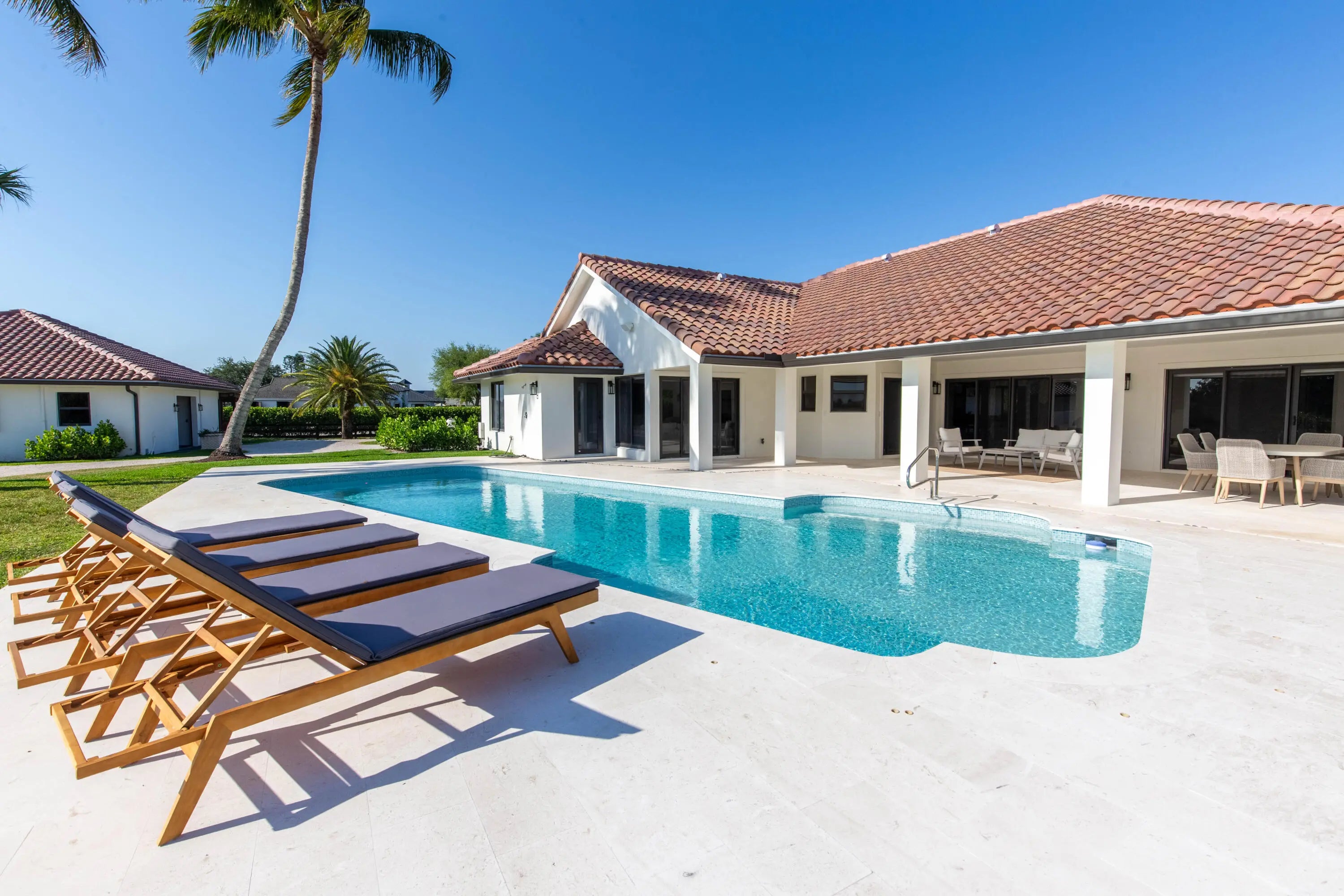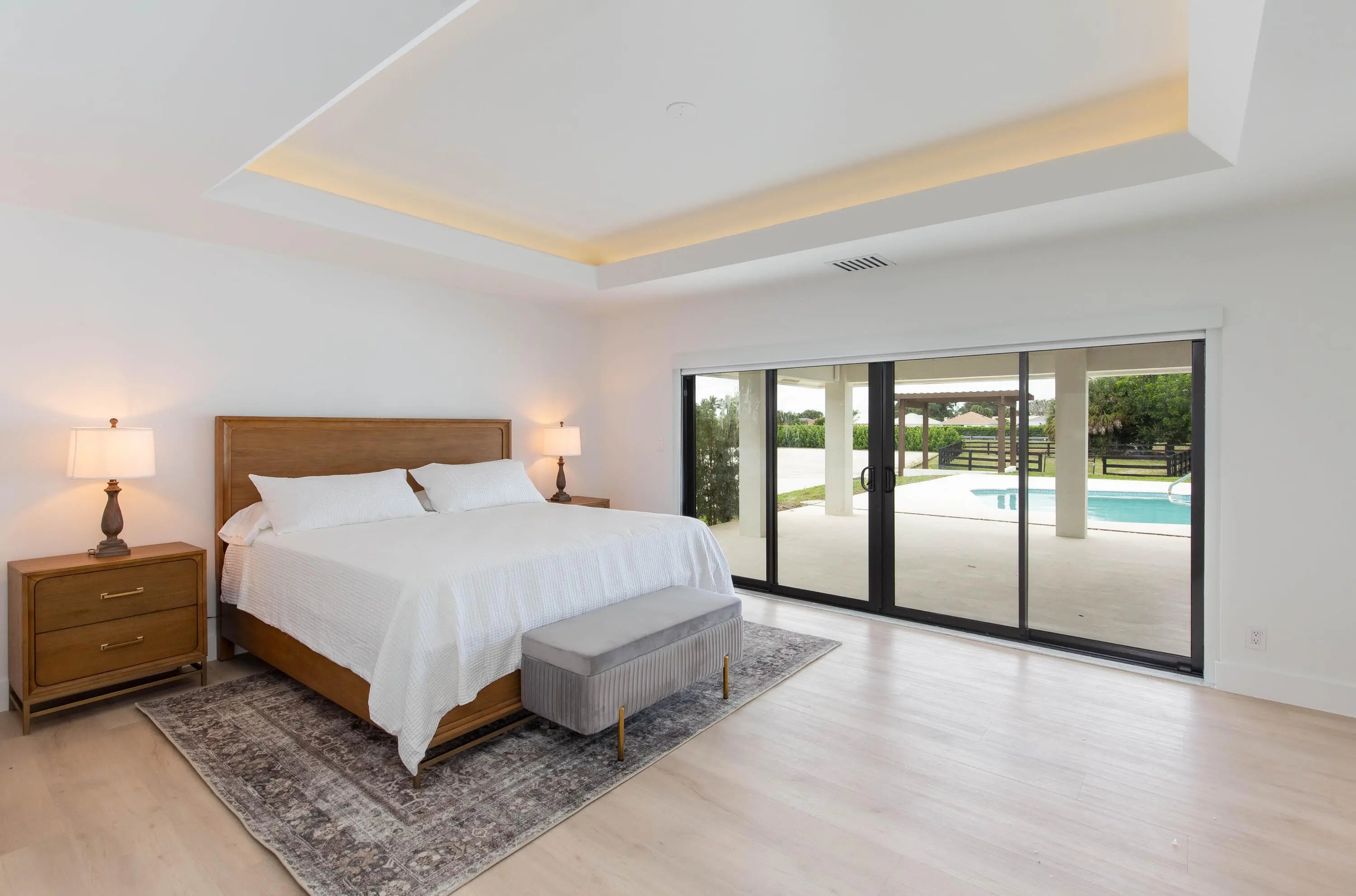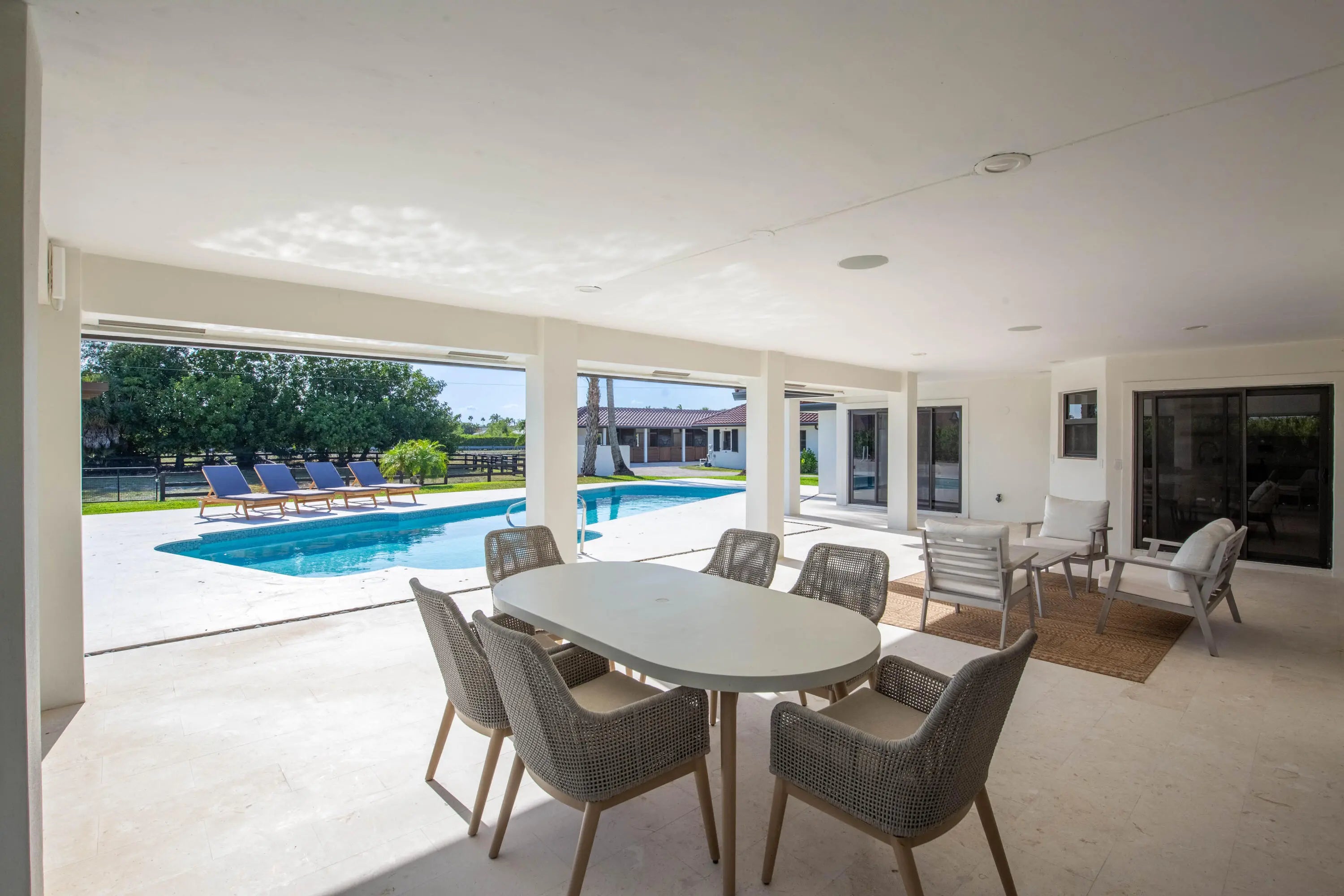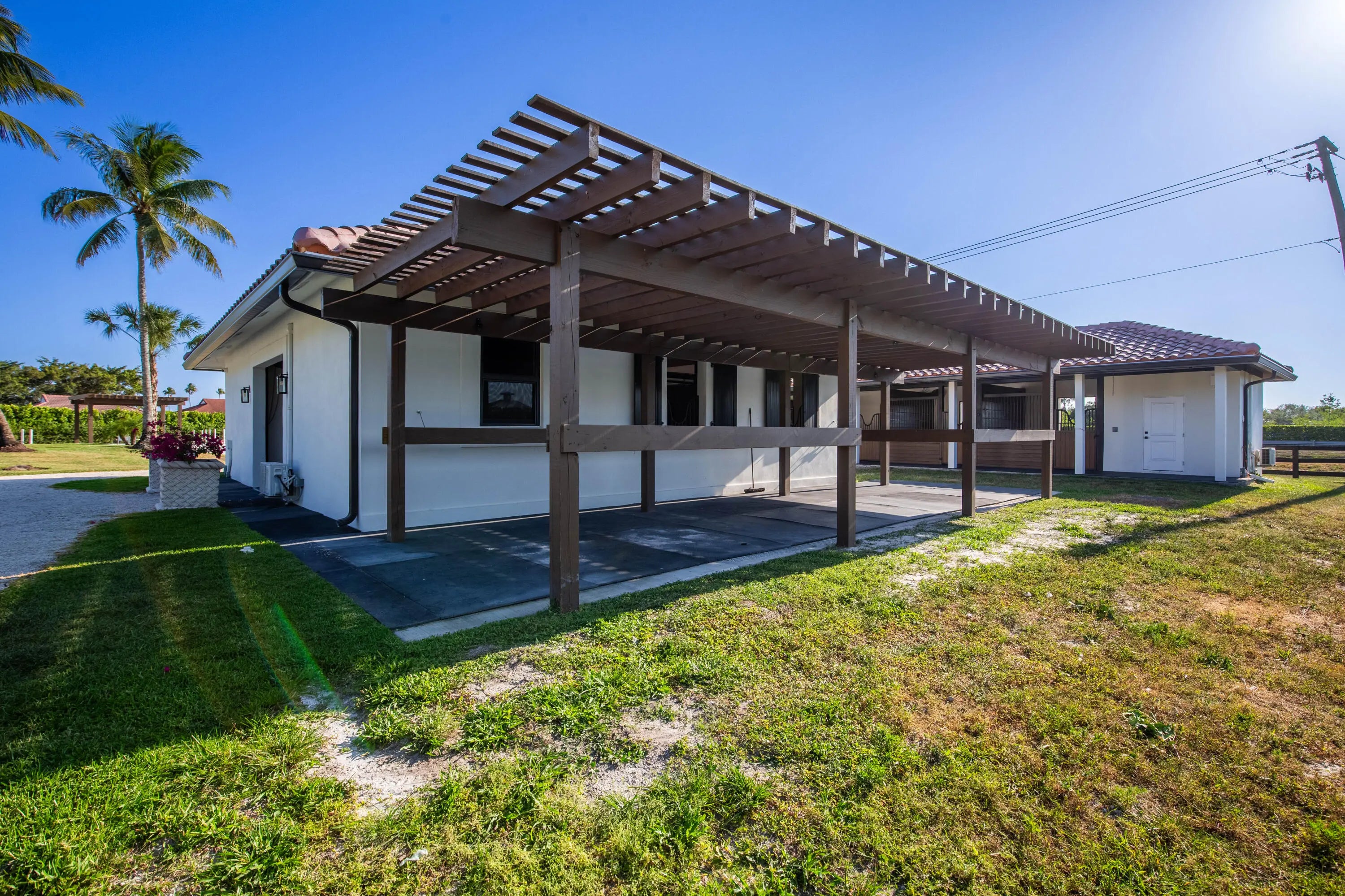 9 stall barn and 4 bedroom house walking distance to the horse show available for off season or annual! Off season pricing: $1,400 per month per stall and $15,000 per month for the 4 bedroom house. Perfectly positioned just a 7-minute hack to the showgrounds the thoughtfully designed equestrian amenities include two immaculate barns housing 9 stalls, new footing, a tack room, feed room, fly spray system, laundry, three wash stalls, full bathroom, office/lounge, and six irrigated paddocks-perfectly suited to meet your training and turnout needs. The newly renovated fully furnished turnkey private 4-bedroom home with a pool is also available. Don't miss this rare opportunity to lease this exquisite property in a prime location!