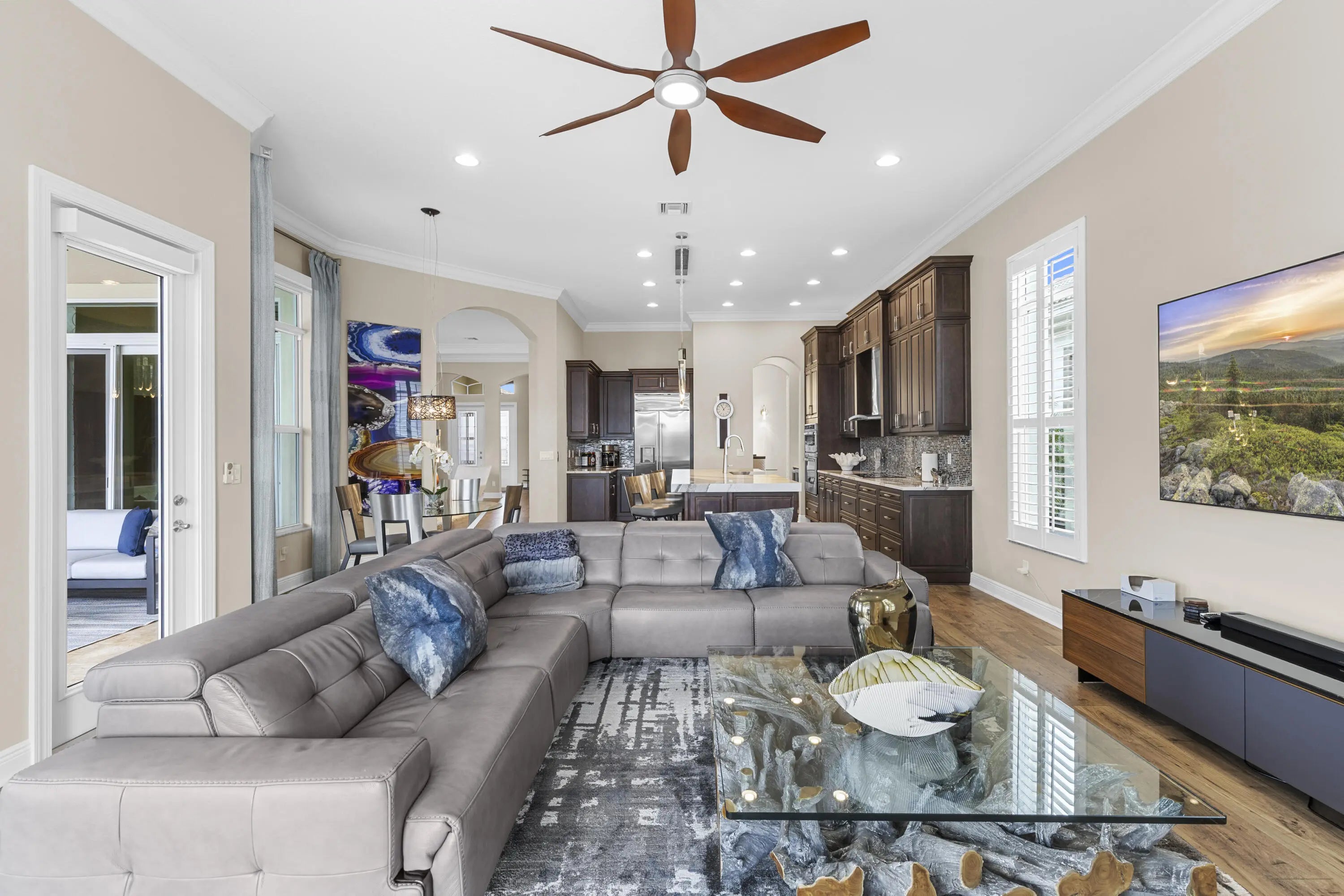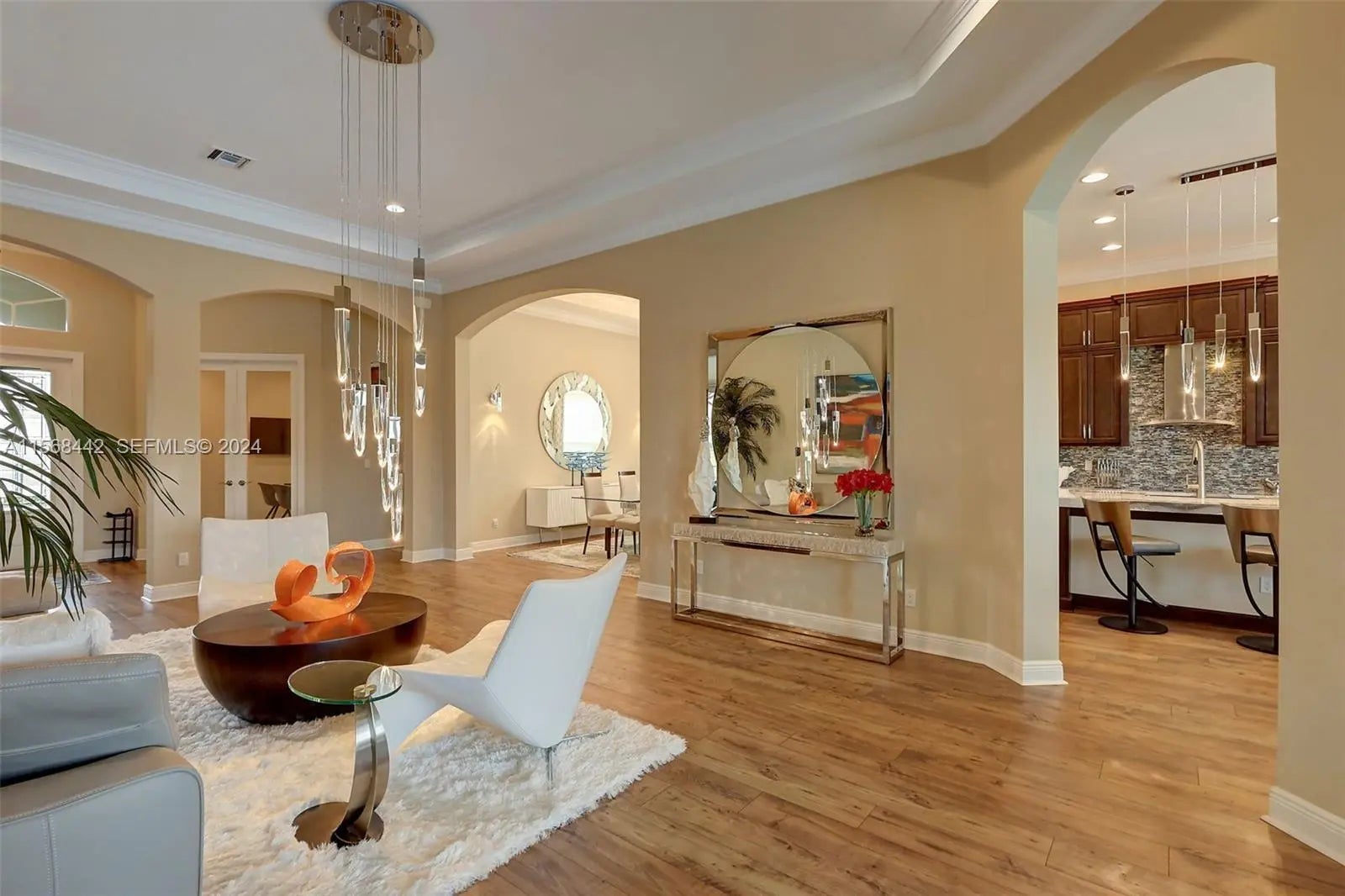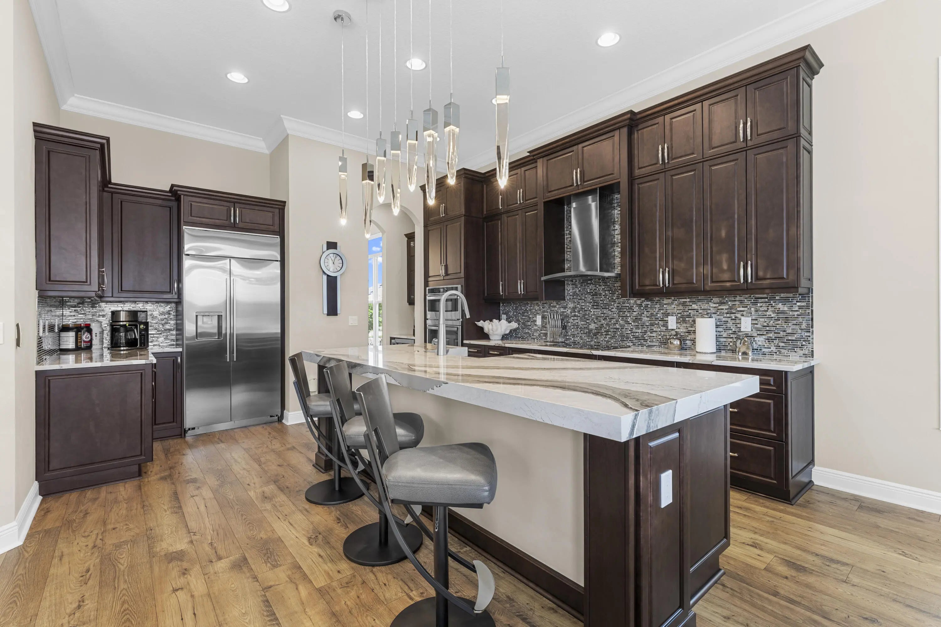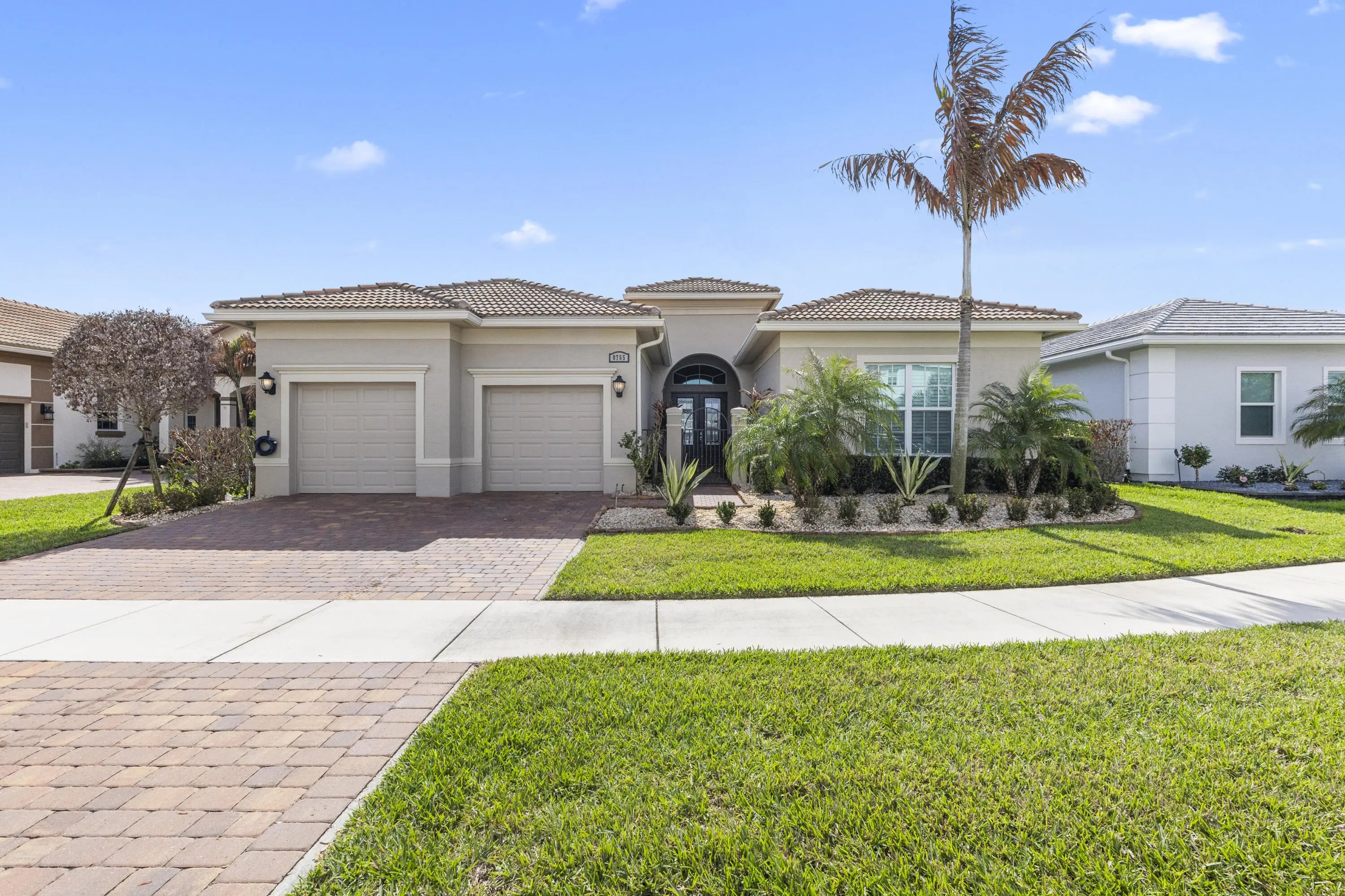 Stunning 2022 Collina Model in the gated community of PGA Verano, featuring 3 BD 4.5 BA, volume ceilings, wood flooring, gourmet kitchen with 42" cabinets, quartz counters with GE Monogram appliances. Decorative double entry doors, double glass office doors, recessed lighting, designer chandeliers, custom electric shades, plantation shutters, and private wet bar. Enjoy a custom heated infinity pool with jacuzzi, lights, water bowls, travertine deck, mirror screen enclosure, and cabana bath. Hurricane impact windows and doors. Tastefully decorated—furniture negotiable. Also offers Guard gated, resort style community, Massive amenity campus, (indoor and outdoor) strong pickleball and active adult lifestyle appeal. Close to Tradition Square, Cleveland Clinic, Turnpike and I95