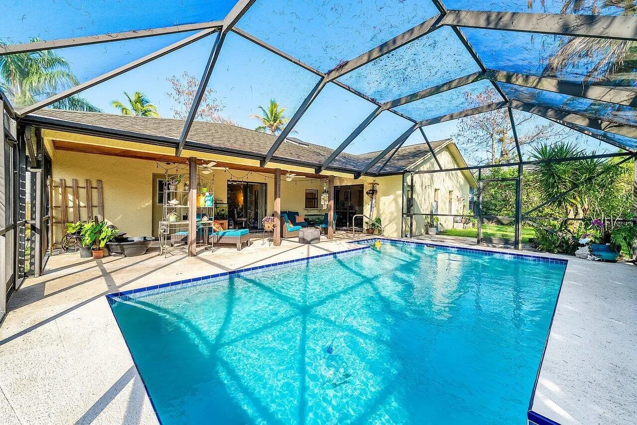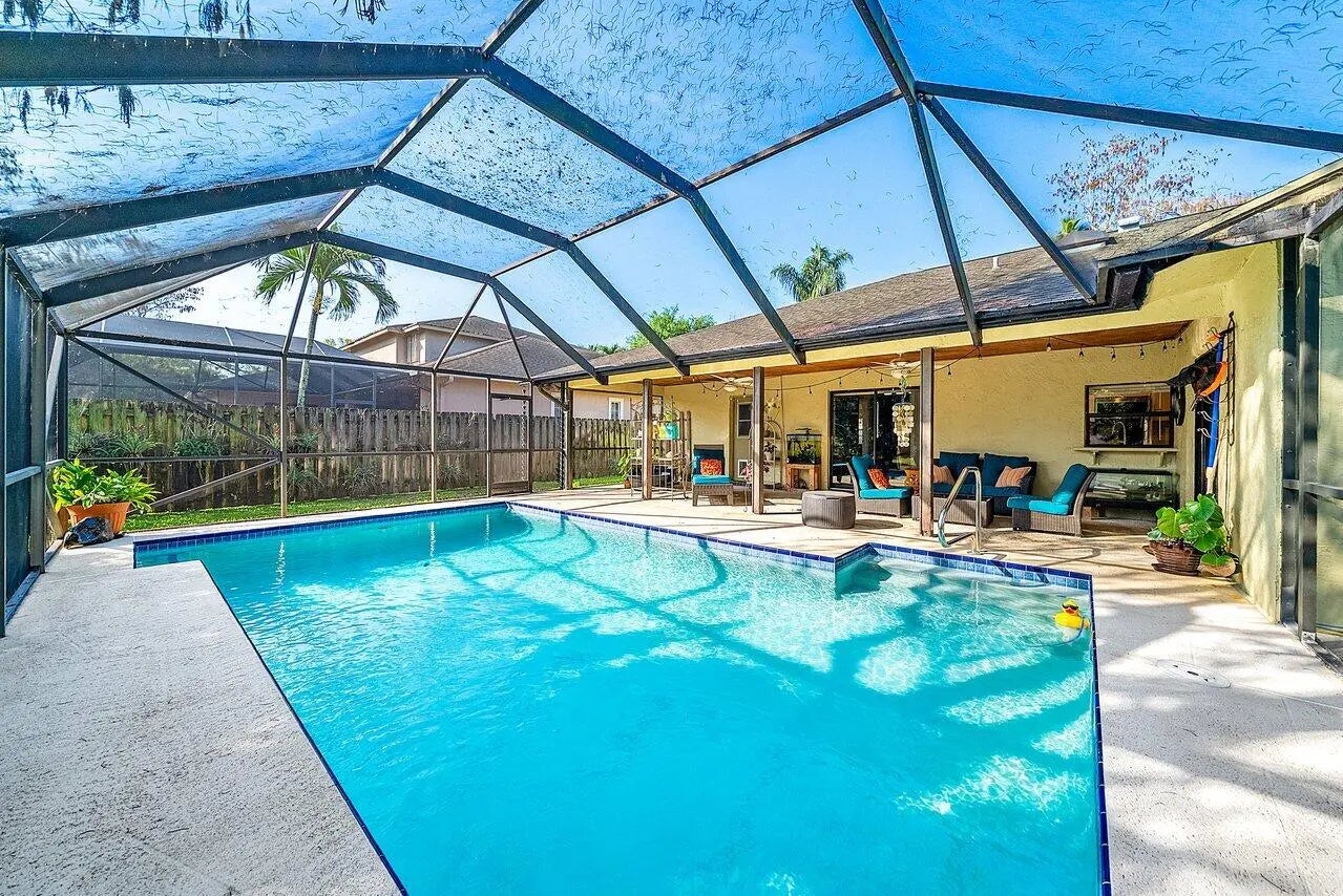 Charming and "cute as a button," this 3-bedroom, 2-bath single-story home is nestled in one of the most desirable sections of Sugar Pond—offering the perfect blend of location, layout, and opportunity. Ideally situated just a short golf cart ride from the renowned Wellington Equestrian Festival show grounds and zoned for top-rated A schools, this home delivers the lifestyle buyers are looking for in the heart of Wellington. Inside, you'll find a thoughtfully designed split floor plan filled with natural light, creating a bright and inviting atmosphere. The home features tile and laminate flooring throughout and offers a solid foundation for updates and personalization. Step outside to your own private retreat—a tranquil backyard complete with a screened-in pool, perfect for relaxing or entertaining, plus an additional storage shed for added convenience. With great bones, endless potential, and an unbeatable location, this is a fantastic opportunity to renovate and create your dream home in one of Wellington's most sought-after neighborhoods.