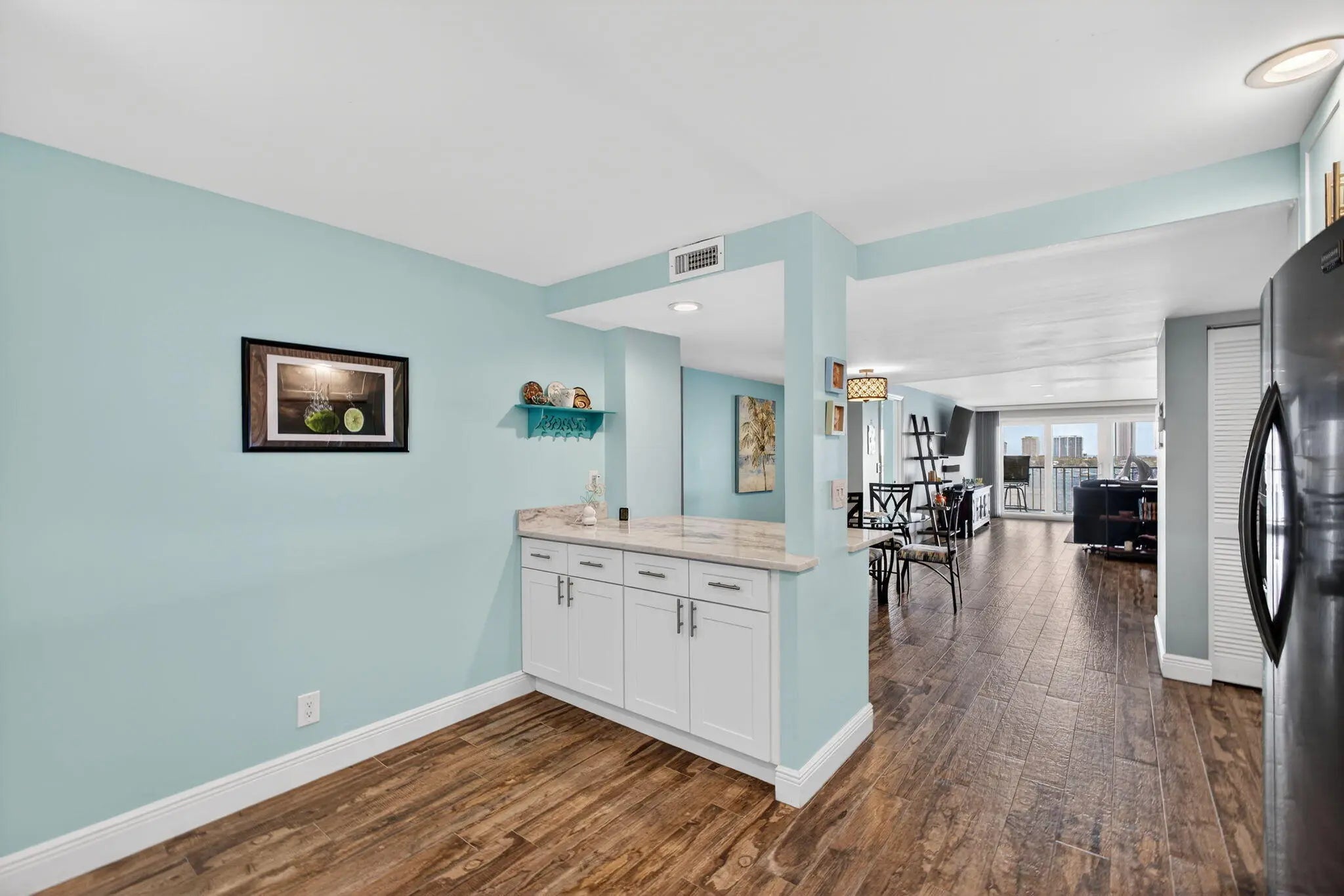 Enjoy spectacular sunrises and sweeping Intracoastal and ocean views from every room in this updated 2-bedroom, 2-bath waterfront condo, ideally located in a rapidly developing area. The split floor plan features a spacious primary suite with a large walk-in closet and renovated en-suite bath with oversized walk-in shower. A versatile second bedroom is perfect for guests or a home office. The modern kitchen offers stainless steel appliances and granite countertops, opening to bright living spaces framed by impact glass. Relax on your private balcony and take in the views. Includes in-unit washer/dryer and is just minutes to beaches, boating, golf, shopping, dining, and the airport.
