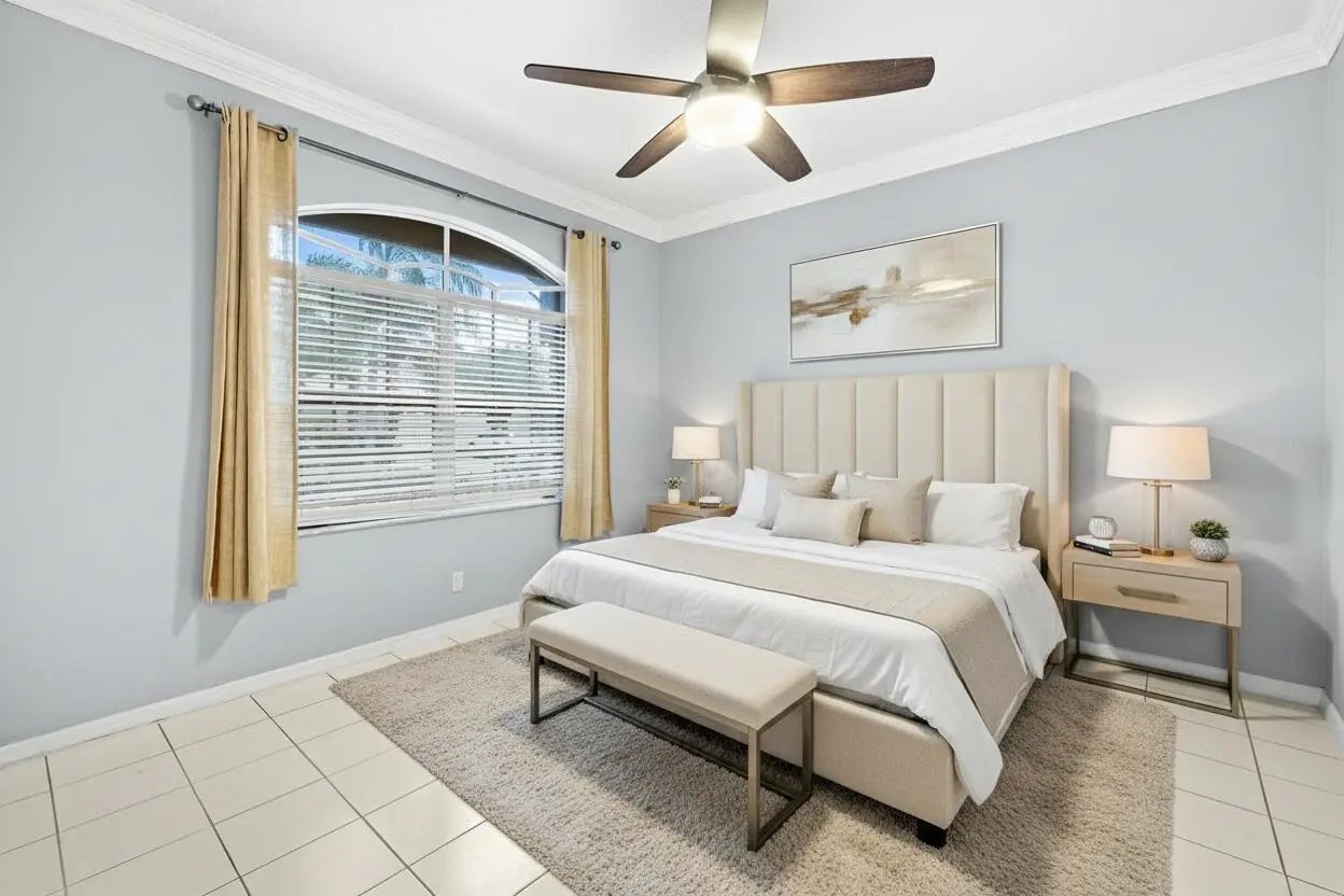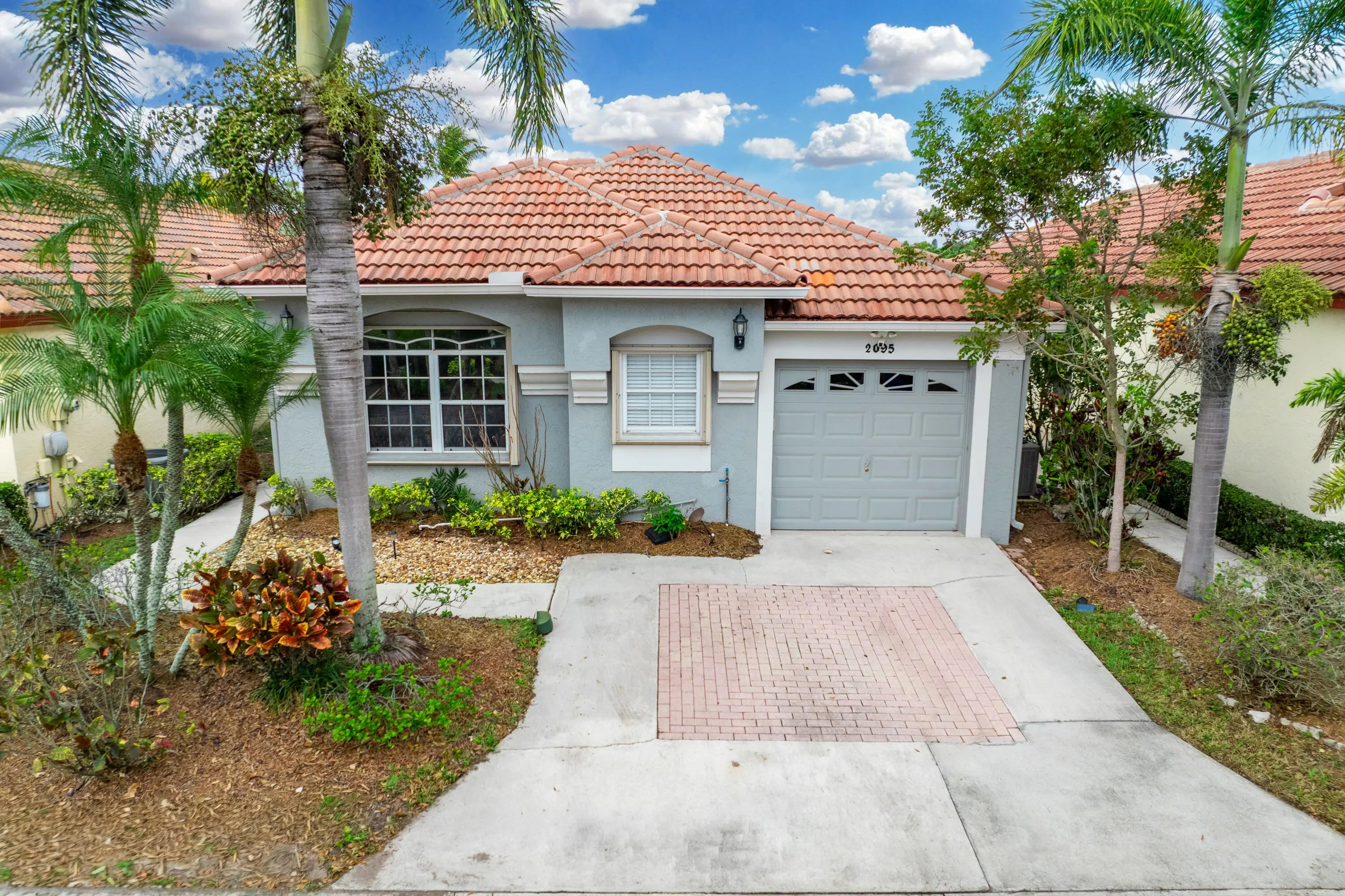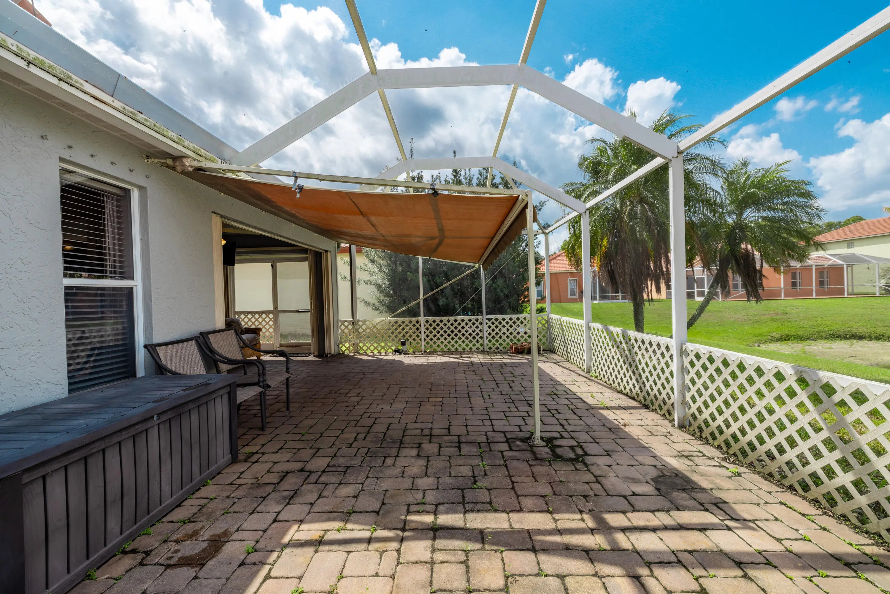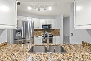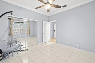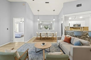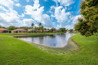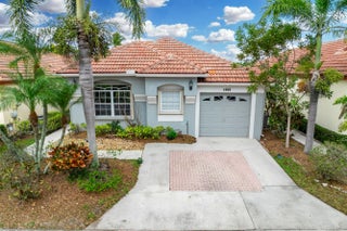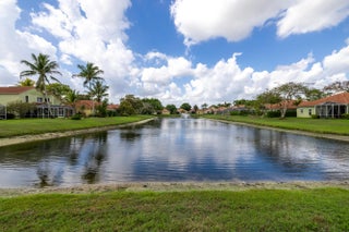 This one story, 2 bedroom, 2 bathroom home sits on a generous LAKEFRONT lot in the desirable gated community of Woodbine! Inside, you'll find vaulted ceilings, crown molding, and tile flooring throughout. The kitchen features granite countertops with a matching backsplash, stainless steel appliances, ample cabinetry, and a pantry. Relax on a screened in, paved lanai with an awning, while enjoying peaceful water views. The home is also equipped with accordion shutters. HOA fee includes basic cable and internet. Woodbine offers exceptional amenities, including three heated pools, a clubhouse, a fitness center, a playground, shuffleboard, and tennis, pickleball, and volleyball courts. Boat and RV storage is available through HOA for a fee. The community is just a short drive from Singer Island's beautiful beaches, Peanut Island, downtown and midtown Palm Beach Gardens, downtown West Palm Beach, shopping, dining, and PBI Airport. All measurements are approximate. The property may be under video and audio surveillance. Take a look at the 3D walkthrough.