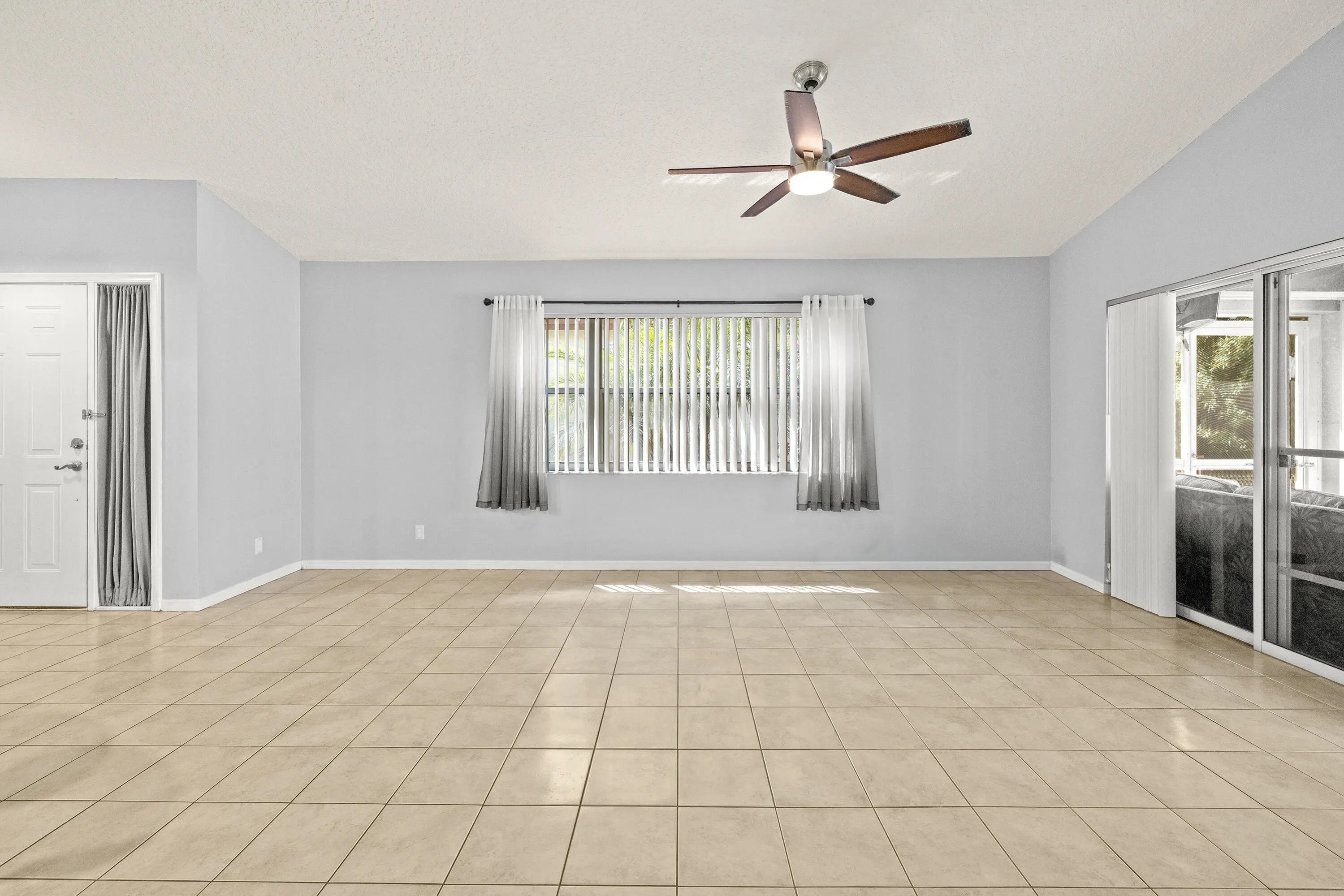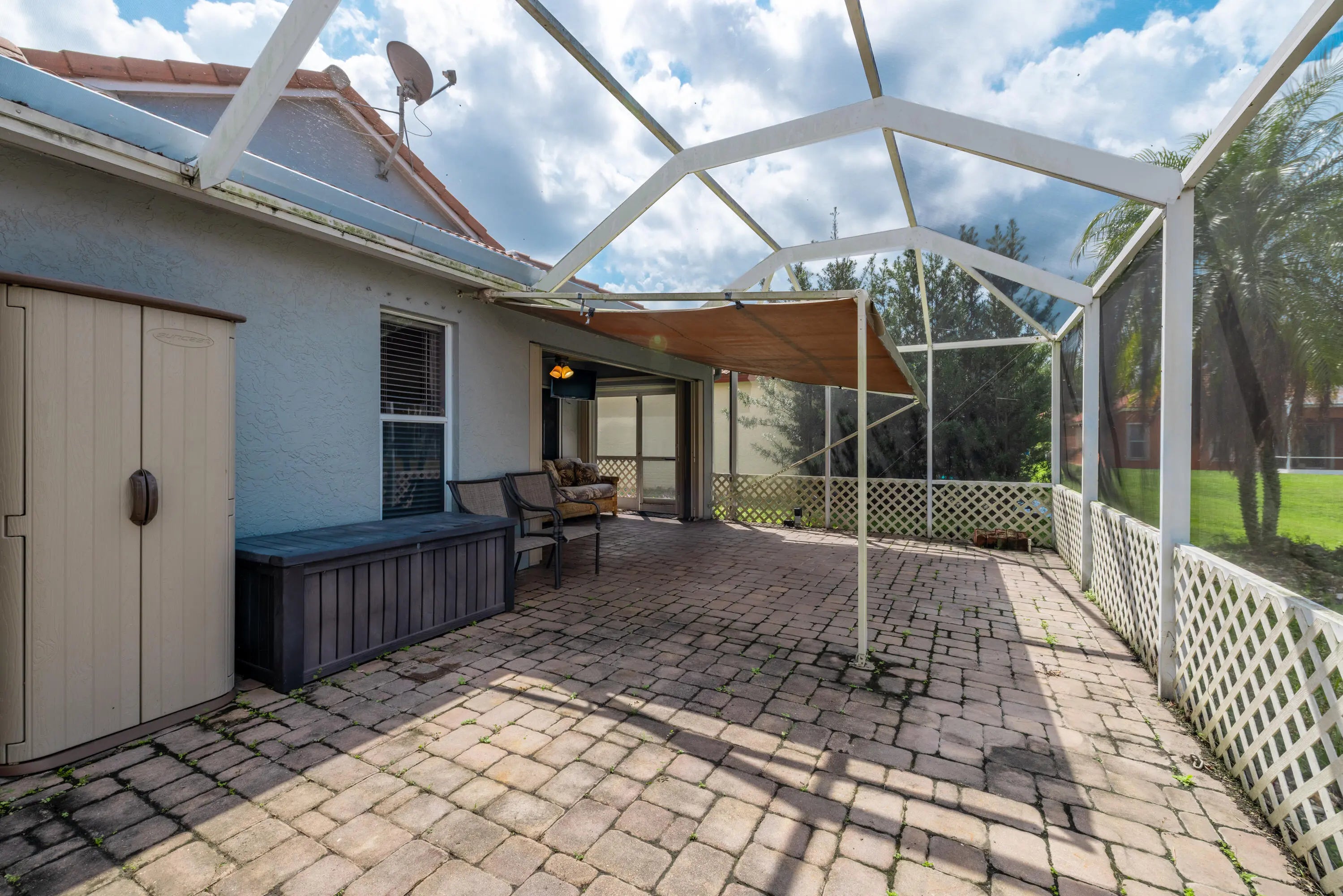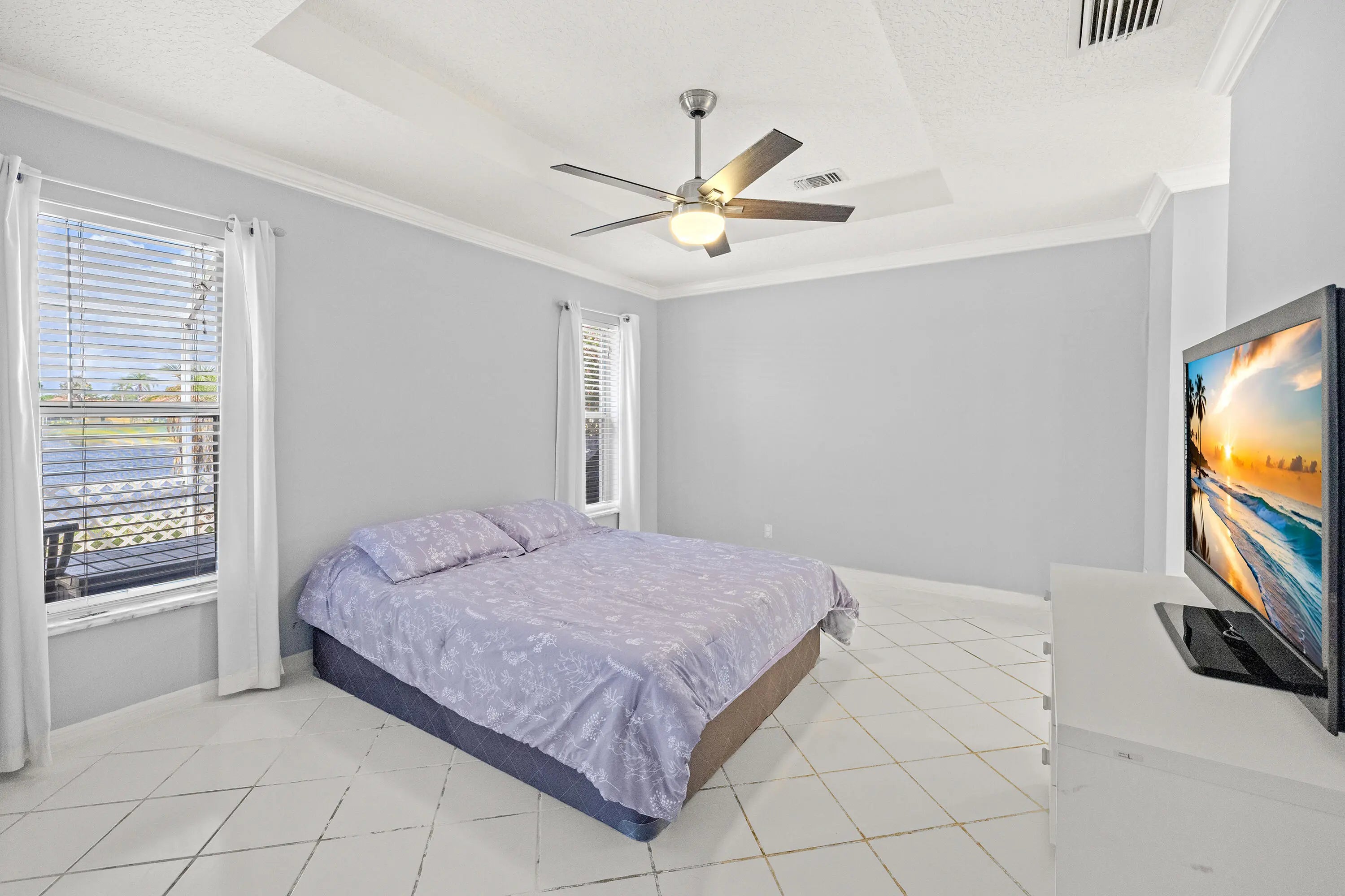 This one story, 2 bedroom, 2 bathroom home sits on a generous LAKEFRONT lot in the desirable gated community of Woodbine! Inside, you'll find vaulted ceilings, crown molding, and tile flooring throughout. The kitchen features granite countertops with a matching backsplash, stainless steel appliances, ample cabinetry, and a pantry. Relax on a screened in, paved lanai with an awning, while enjoying peaceful water views. The home is also equipped with accordion shutters. HOA fee includes basic cable and internet. Woodbine offers exceptional amenities, including three heated pools, a clubhouse, a fitness center, a playground, shuffleboard, and tennis, pickleball, and volleyball courts. Boat and RV storage is available through HOA for a fee. The community is just a short drive from Singer Island's beautiful beaches, Peanut Island, downtown and midtown Palm Beach Gardens, downtown West Palm Beach, shopping, dining, and PBI Airport. All measurements are approximate. The property may be under video and audio surveillance. Take a look at the 3D walkthrough.