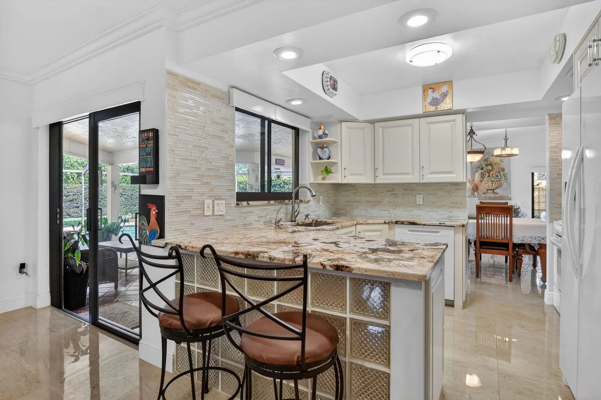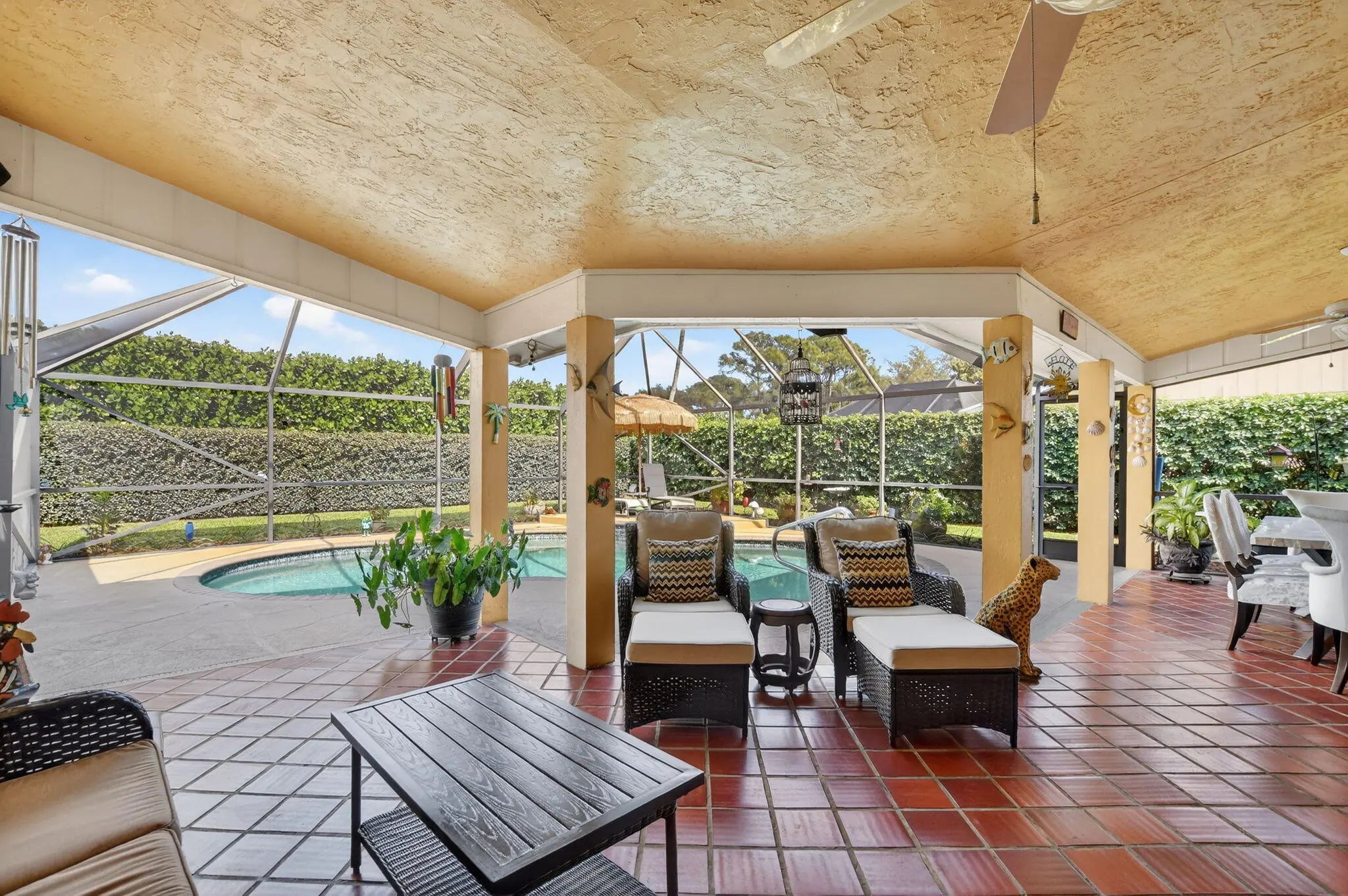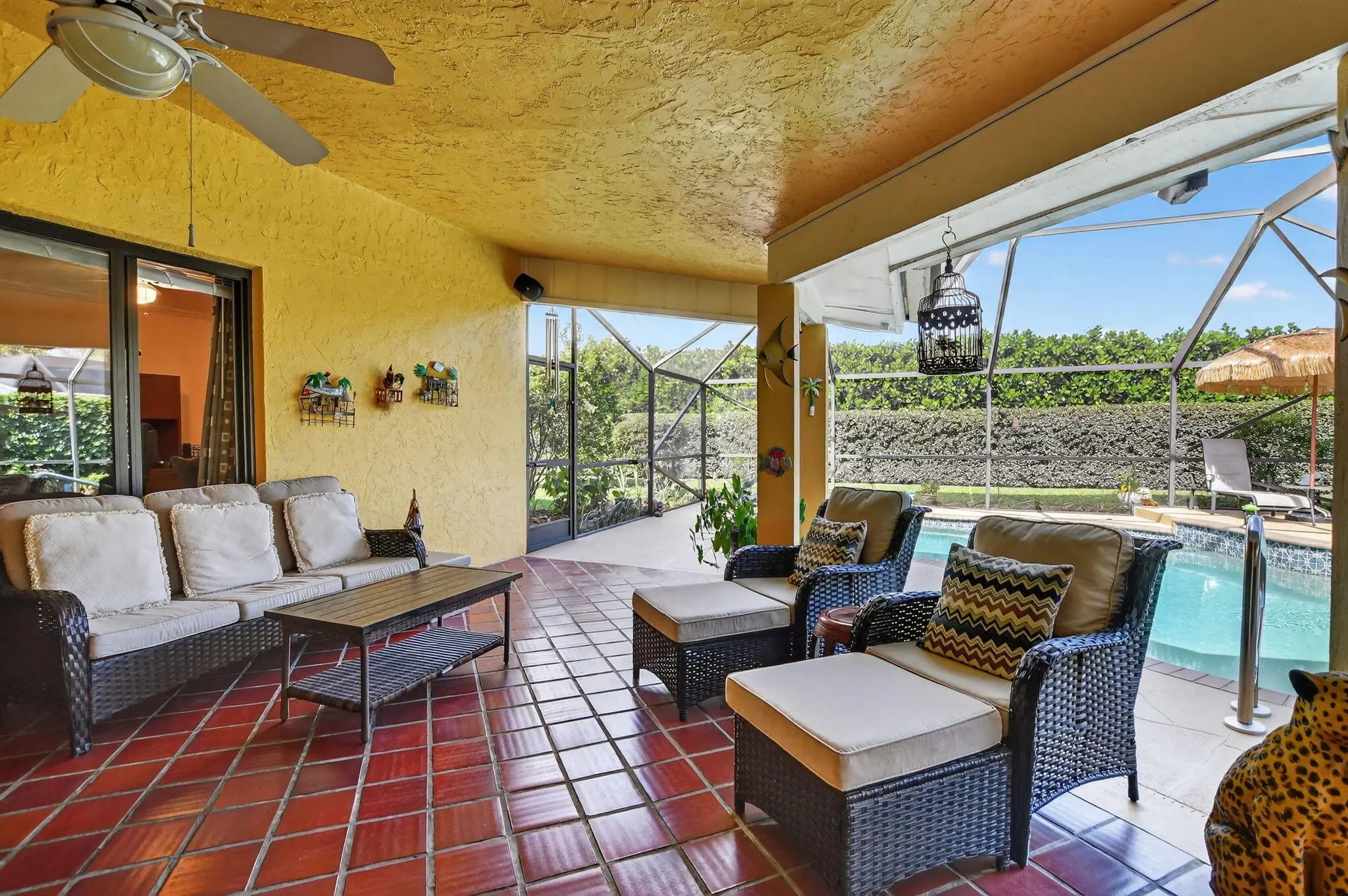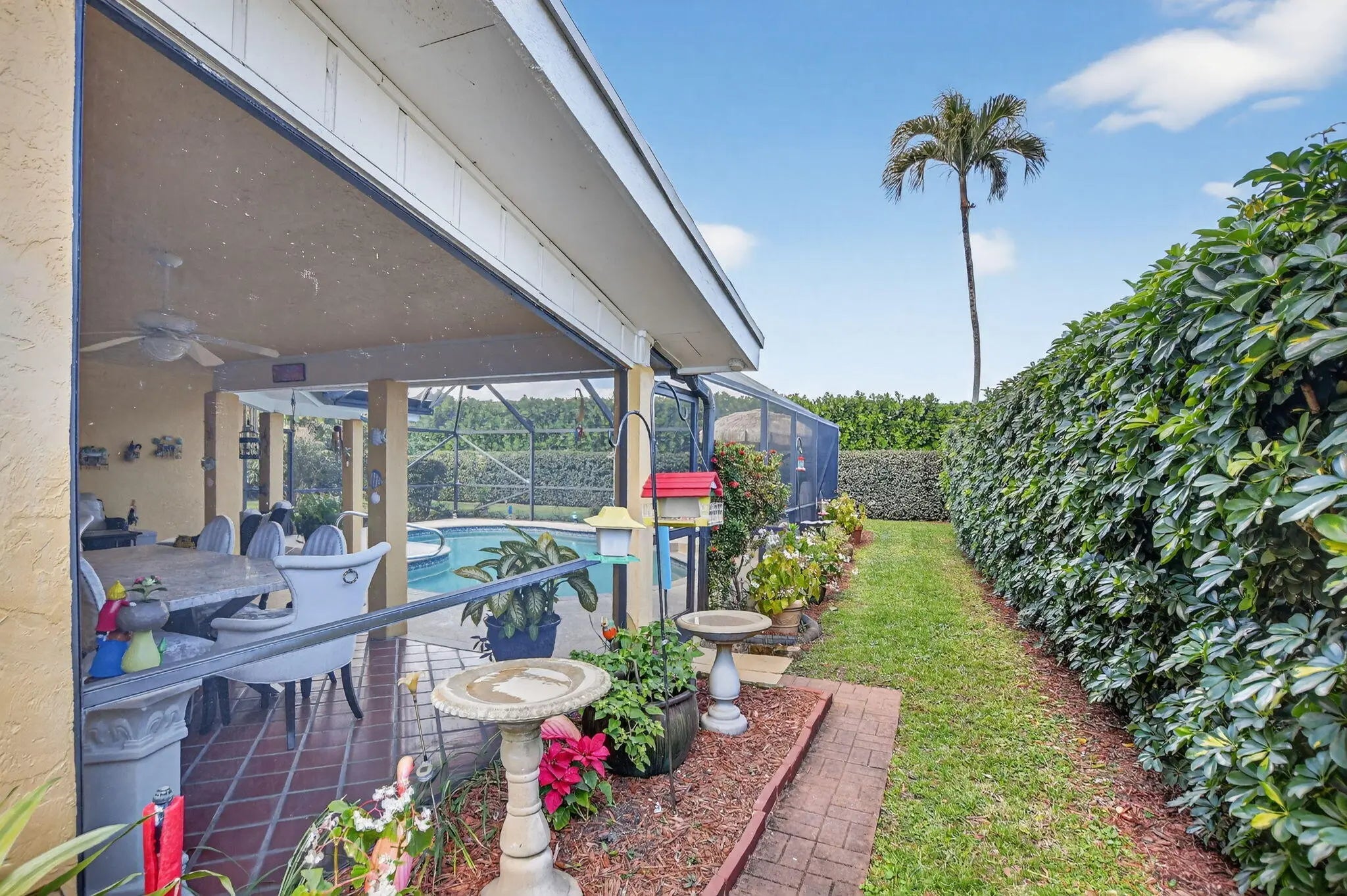 Beautifully upgraded home in Pheasant Walk, a sought-after Boca Raton community with highly regarded schools, conveniently located near shopping, dining, & just a short drive to the beach. A spacious screened-in front porch sets the tone as you enter this move-in-ready residence offering 3 bedrooms, 2.5 baths, & a split floor plan with two living areas & an open-concept kitchen at the center. The home features hurricane impact windows & sliders throughout. The kitchen has imported Brazilian granite countertops, a stylish tile backsplash, premium soft-close cabinetry, & includes a newer refrigerator & dishwasher. Sleek large-format porcelain tile flooring flows throughout the home. Additional highlights include a solar-assisted water heater & a screened, heated pool perfect for year-round enjoyment.