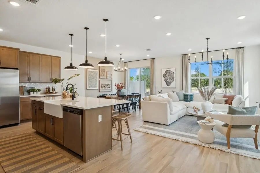 Fullerton II Townhome - Farmhouse Design with Smart Upgrades Experience modern farmhouse living in this beautifully appointed Fullerton II townhome, featuring stylish matte black fixtures throughout. The gourmet kitchen is designed to impress, showcasing Brellin White cabinetry, Arctic White quartz countertops, a spacious center island, a classic apron-front sink, built-in wall ovens, and premium finishes—perfect for cooking and entertaining alike. Ceramic tile flooring runs throughout the main living areas, offering both durability and a clean, contemporary look. The open-concept main level seamlessly connects the kitchen, great room, and dining area, creating a bright and airy space ideal for everyday living. The dining area opens directly to the patio, making indoor-outdoor entertaining effortless. Upstairs, enjoy the convenience of a dedicated laundry room complete with washer and dryer. The primary suite serves as a relaxing retreat, featuring a spacious walk-in closet and an elegant ceiling treatment that adds character and charm. The en-suite bath includes dual sinks for added functionality. A versatile second-floor loft provides flexible space—perfect for a home office, media room, or play area. Blending thoughtful design, modern finishes, and functional living spaces, this Fullerton II townhome offers comfort and style in every detail.