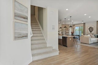 Fullerton II Townhome - Farmhouse Design with Lake Views Step into this beautifully crafted Fullerton II townhome, where modern farmhouse style shines throughout and tranquil lake views create a serene and inviting atmosphere. The inviting foyer welcomes you with a stunning feature wall, leading into open-concept living spaces that create a seamless flow for hosting and relaxation. The gourmet kitchen is beautifully appointed with Brellin Greyhound cabinetry, Arctic White quartz countertops, built-in wall ovens, and a large corner pantry—perfectly designed for both everyday living and entertaining. Upstairs, a convenient laundry room includes a washer and dryer for added ease. The private primary suite offers a spacious retreat, complete with a generous walk-in closet complete with a generous walk-in closet and a well-appointed en-suite bath. A versatile loft provides additional space for leisure activities, a home office, or media area, with integrated home automation enhancing convenience and modern living. Step outside to the patio—ideal for enjoying time with friends or simply relaxing while overlooking the lake. An attached 2-car garage offers ample space for vehicles and storage. This Fullerton II blends style, comfort, and scenic views into one exceptional home.