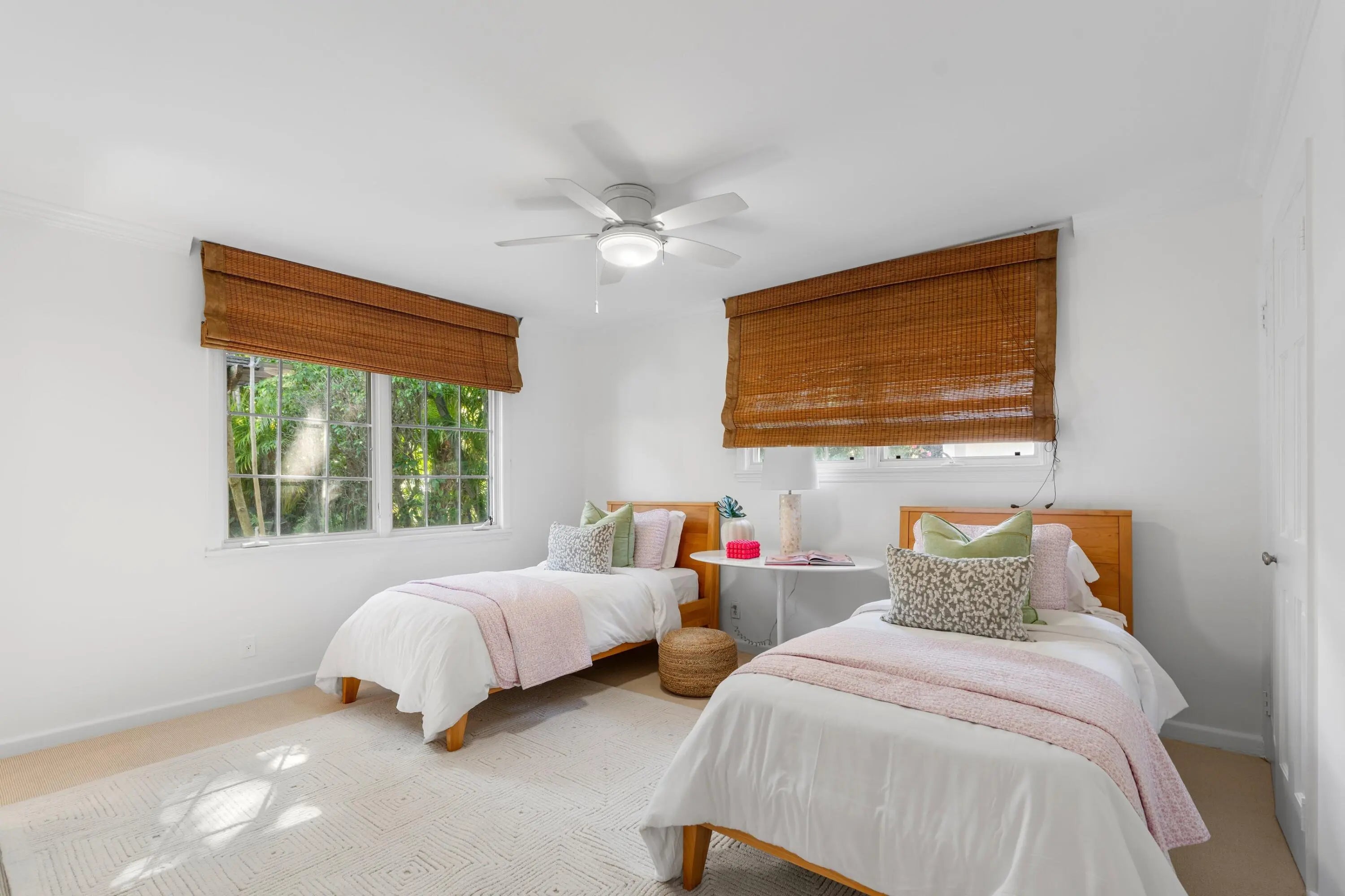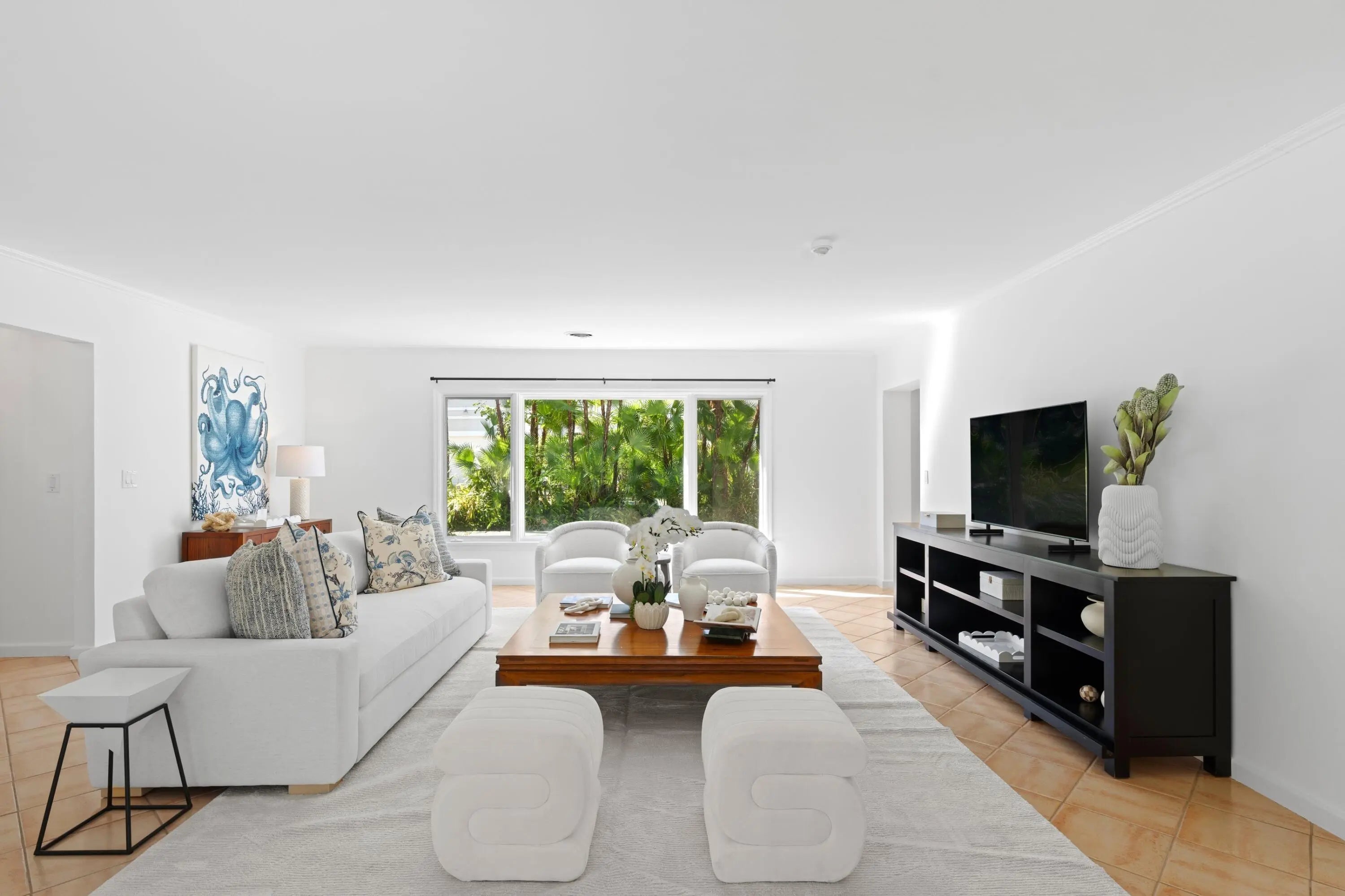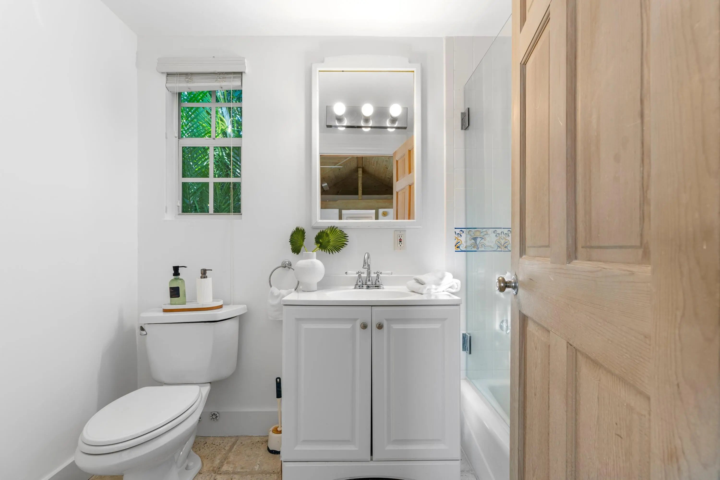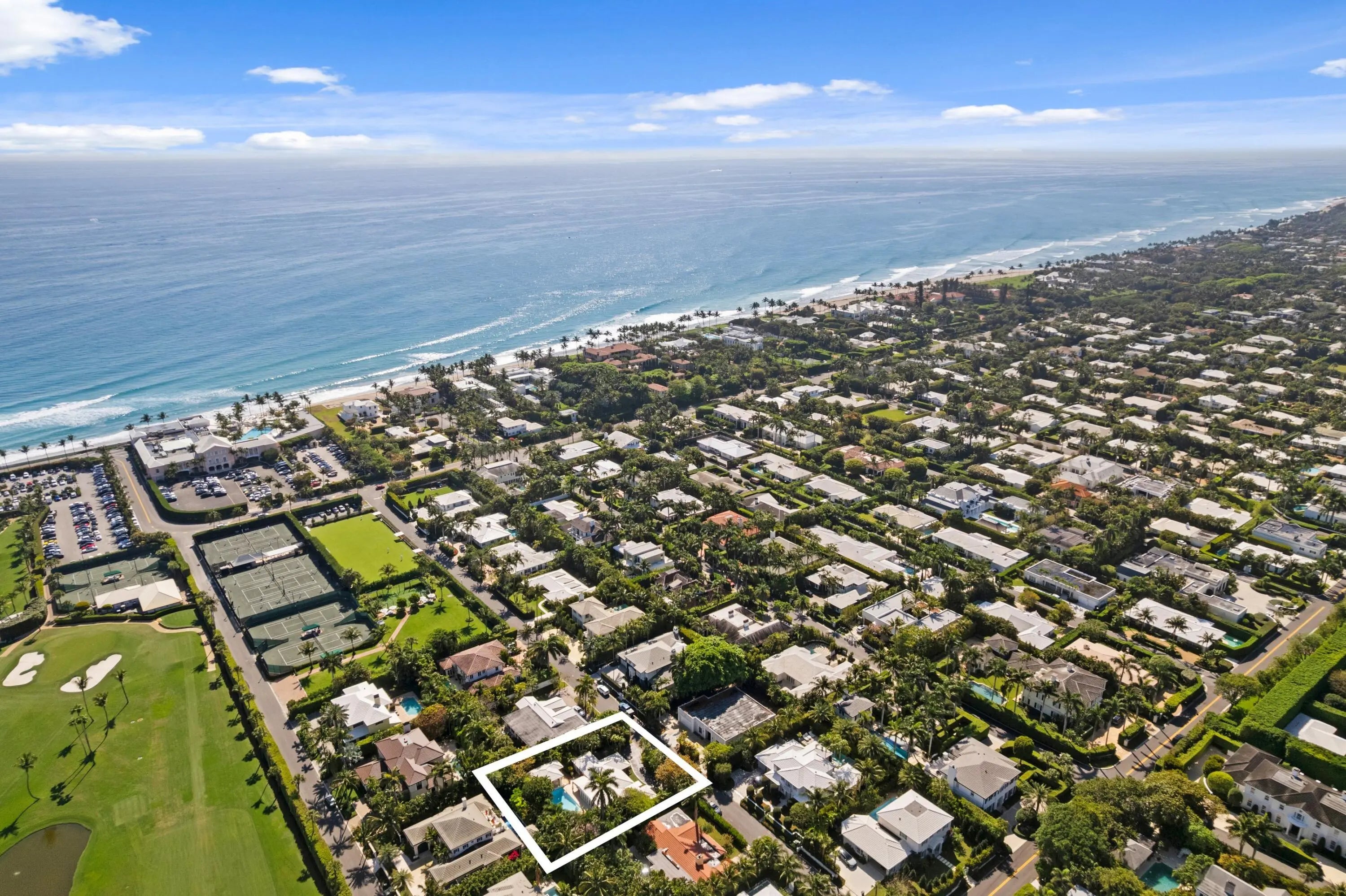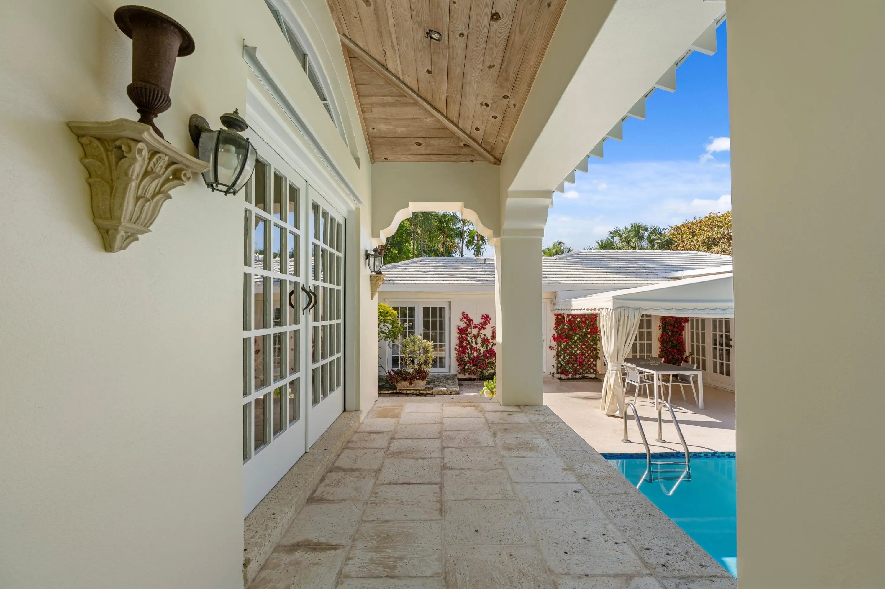 Nestled in one of the North End's most coveted neighborhoods, this charming Bermuda-style residence blends classic coastal style with relaxed living. Set on an expansive 11,500 SF lot, the property features a 3-bedroom main home, each with its own en-suite bath, plus a separate 1-bedroom, 1-bath pool house with kitchenette--ideal for guests or a private retreat. The lush backyard offers a sparkling pool surrounded by tropical landscaping, creating a serene, private oasis. Inside, generous living spaces flow to a welcoming loggia and covered patio for seamless indoor-outdoor living and entertaining. Enjoy easy beach access, scenic Intracoastal bike rides, and close proximity to top restaurants and shops--just minutes away. A rare opportunity to own in an exceptional location!