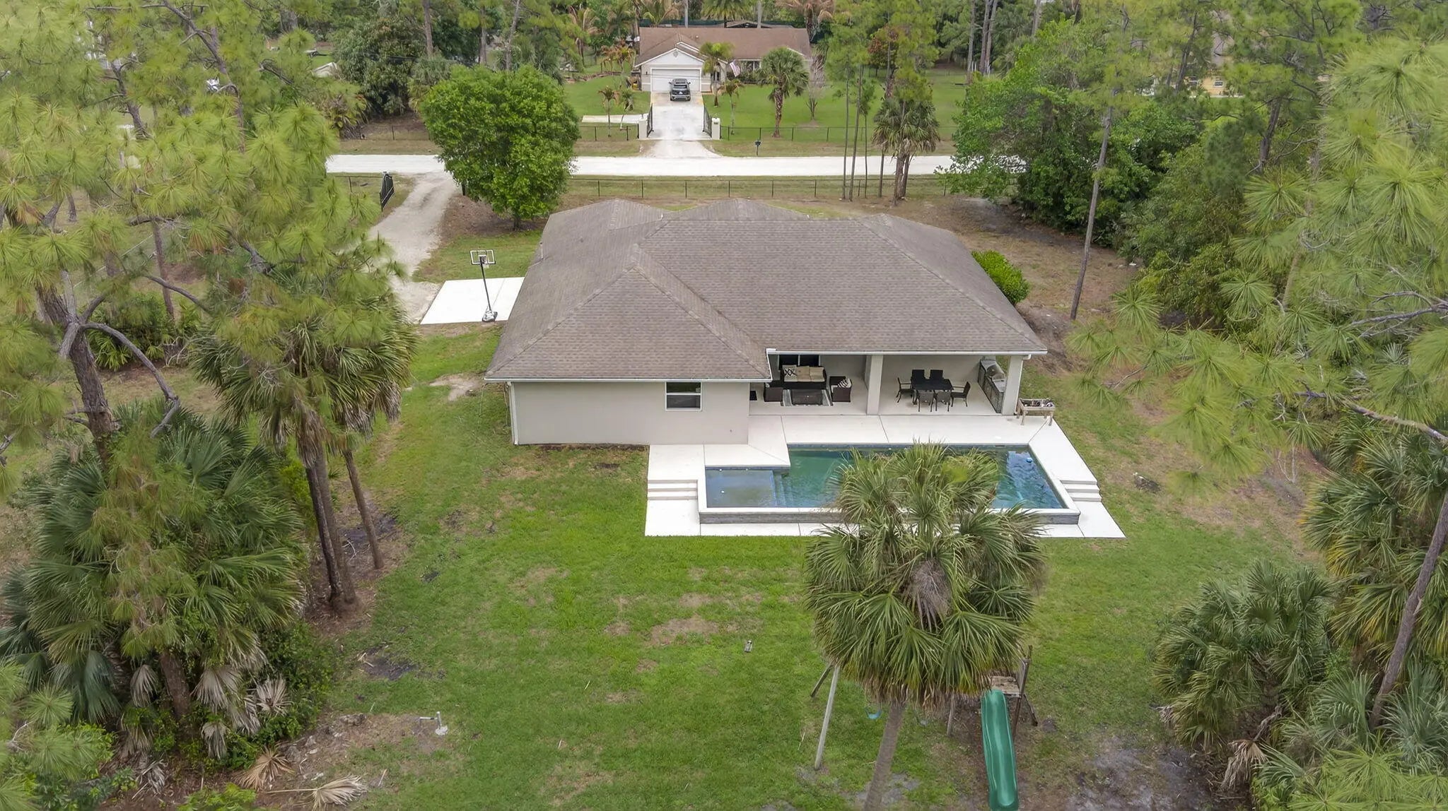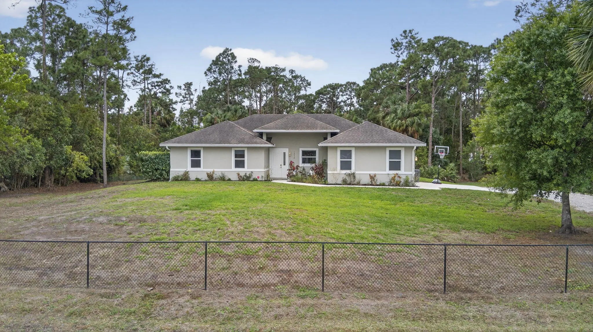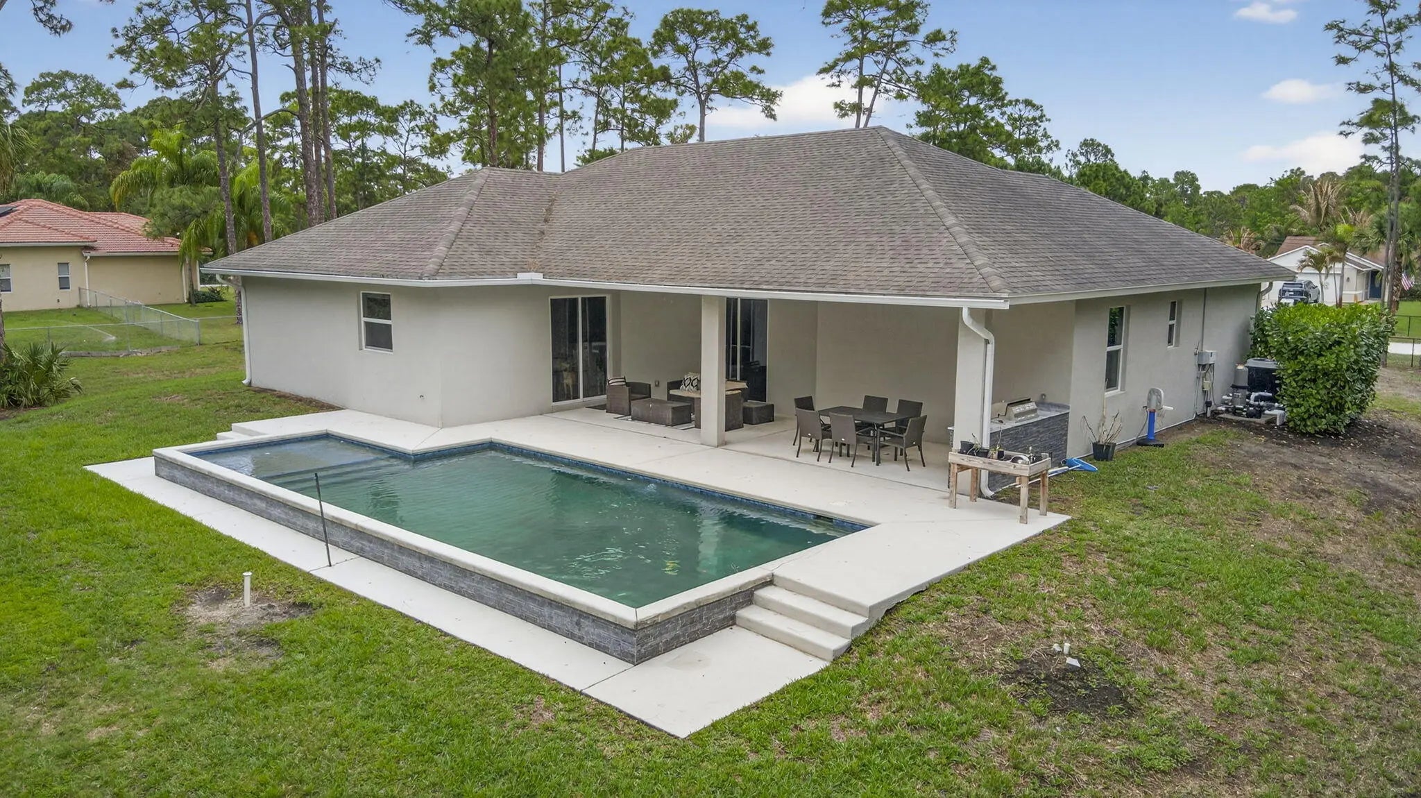 Welcome home to your quiet, peaceful oasis~ This 2019 custom-designed 4 bedroom 2 bath single family home sits on a private 1+ acre lot surrounded by mature oaks and pines. NO HOA, no rules, restrictions or covenants: do what you want on your own land. High & dry setting on a quiet dead-end street in a horse-friendly area. True four-bedroom split plan, side-entry 2-car garage, huge indoor utility room with built-in cabinetry, washer and dryer. Beautiful salt water pool & heater, sunbathing ledge & spacious covered rear porch w/ outdoor kitchen area. Upgrades include complete set of insulated impact windows, designer tile, granite countertops, all-stainless appliances, and a whole-home water softening system. Comcast alarm system. Great location minutes to schools, new shopping and parks.