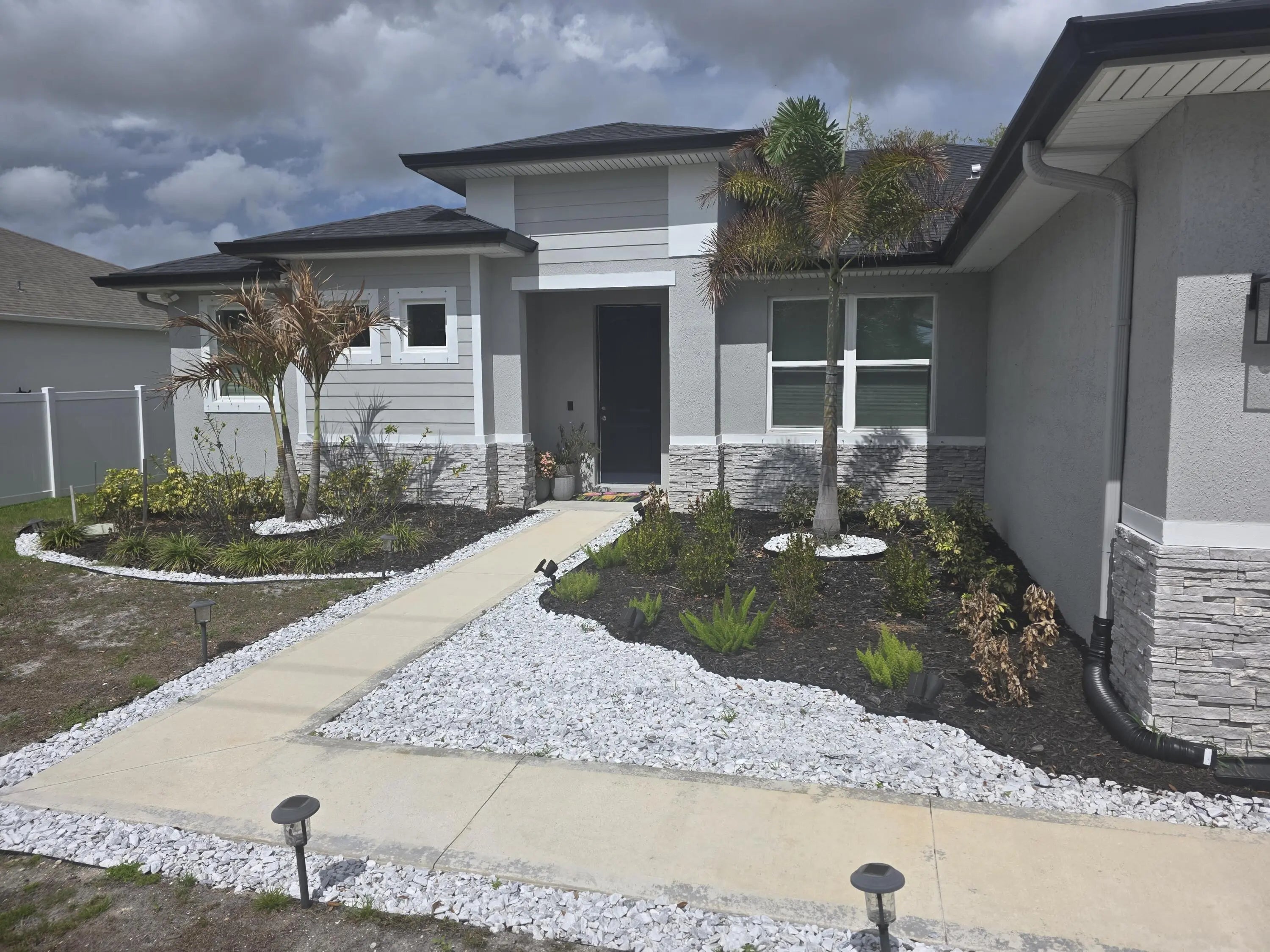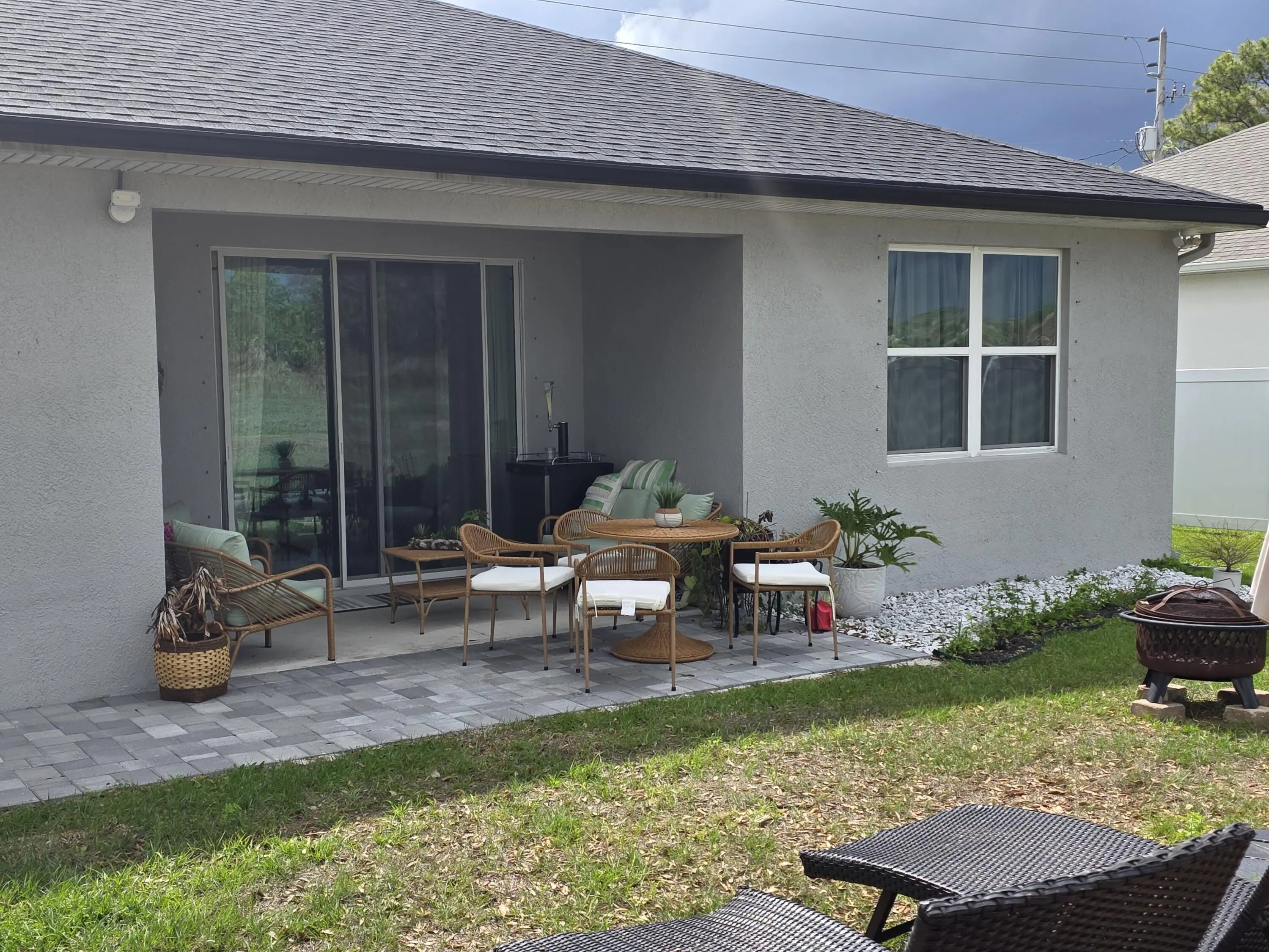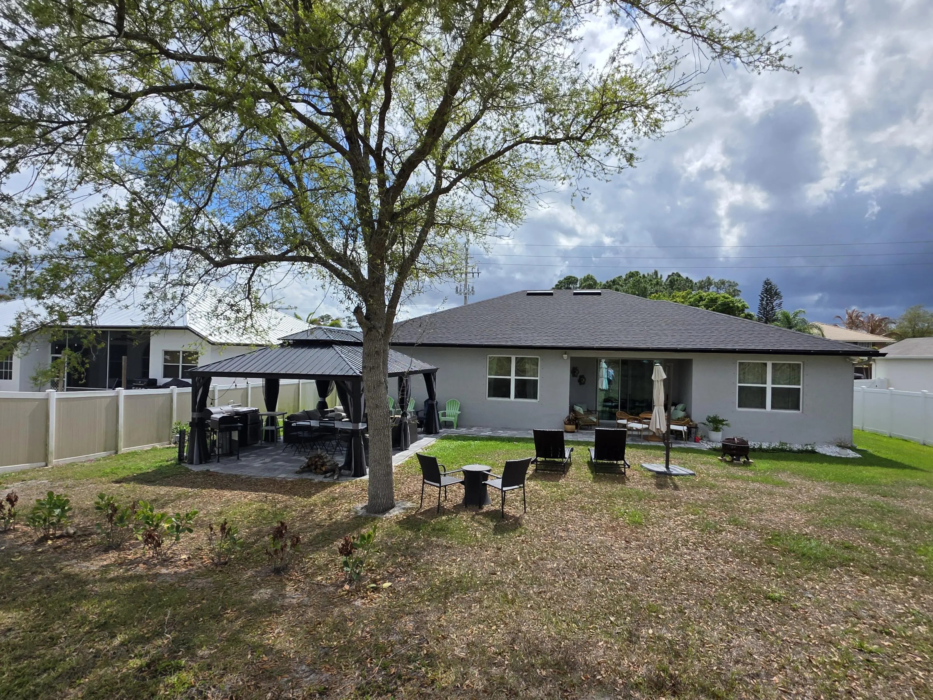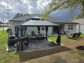 Spacious and beautifully upgraded 3-bedroom + den/flex room Coastal Model, built in 2023, featuring tile flooring throughout and soaring 9-foot ceilings for an open, airy feel. This home is like new and has been meticulously maintained by the current owner, offering modern finishes and move-in ready comfort. The kitchen is designed for both function and style with 42" cabinets offering abundant storage, granite countertops, white subway tile backsplash, a large island for entertaining, pantry, and Samsung stainless steel appliances including refrigerator, dishwasher, range, and microwave. The owner's suite is a true retreat with a large, light-filled bathroom, window over the shower, private water closet, dual sinks, and his-and-hers spacious closets. Both bathrooms feature granite vanities, with tile extending on the walls in the secondary bath. The home also offers ample closet space throughout and a convenient linen closet. Step outside to enjoy a covered patio with extended paver porch area, complete with a lighted gazebo—perfect for relaxing, entertaining, or weekend BBQs. The property sits along the C24 canal, providing a peaceful and scenic backdrop. Additional features include 8' interior and exterior doors, recessed lighting, tray ceilings, a 2-car oversized garage with a driveway that accommodates up to 4 vehicles, and rain gutters to protect the home and landscaping. This like-new 2023 Coastal Model combines comfort, modern style, and careful maintenance—perfect for enjoying Florida living at its best! If you like this home that much, it is also offered for sale. Disclaimer: All measurements, features, and information should be independently verified by the buyer or their agent.