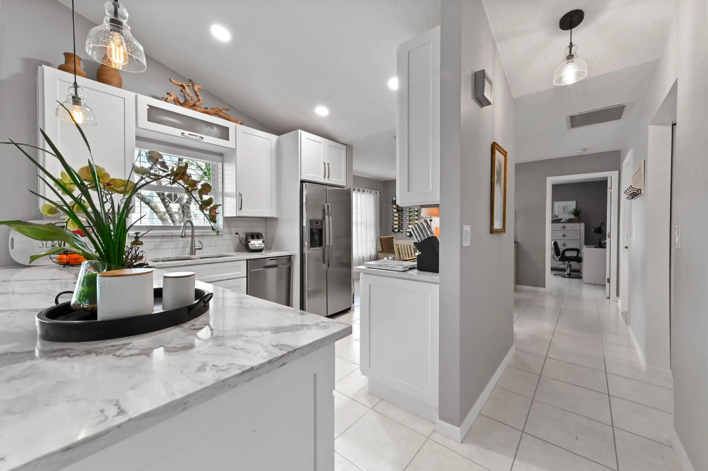 Welcome to this charming lakefront home located in the desirable Lacuna Atlantic Grand National, Cedarbrook at Fairfields Lacuna community—a non-mandatory membership golf community. Offering 1,167 sq ft of living space, this well-maintained residence features 2 bedrooms and 2 bathrooms, perfect for comfortable and relaxed living. Step inside to a bright dining and living area highlighted by vaulted ceilings and tiled flooring throughout. The updated kitchen, renovated in 2020, features granite countertops, appliances, ample cabinetry for storage, and a cozy eat-in space ideal for casual dining. The master bathroom was updated in 2017, adding to the home's modern appeal. Enjoy peace of mind with major upgrades, including a new roof (2026), A/C (2021), impact windows and doors (2017-2018), and a garage door (2015). Relax and take in serene lake views from the closed/screened patio, perfect for morning coffee or unwinding in the evening. This home combines comfort, style, and a beautiful waterfront setting in a sought-after community.