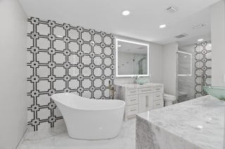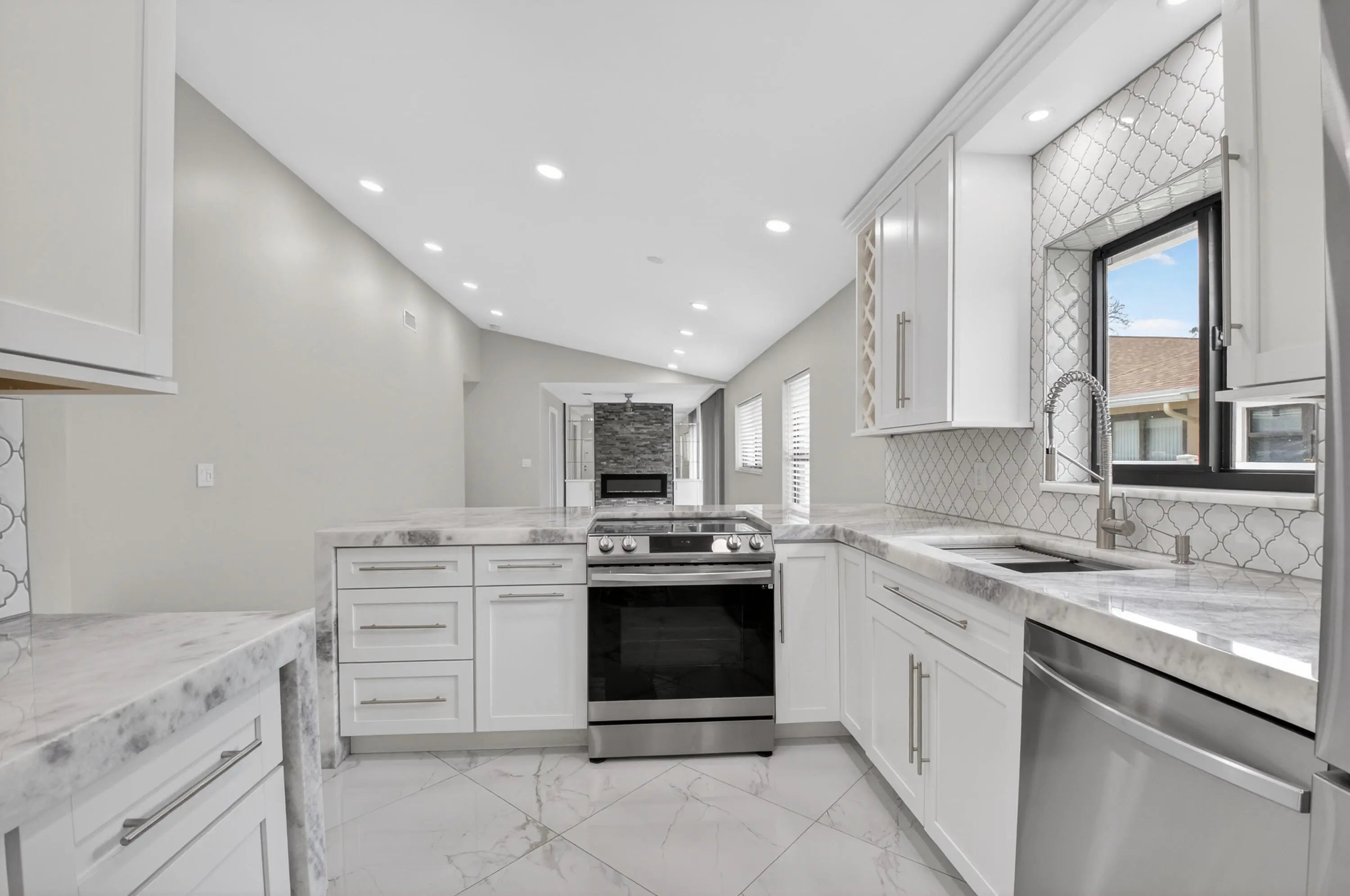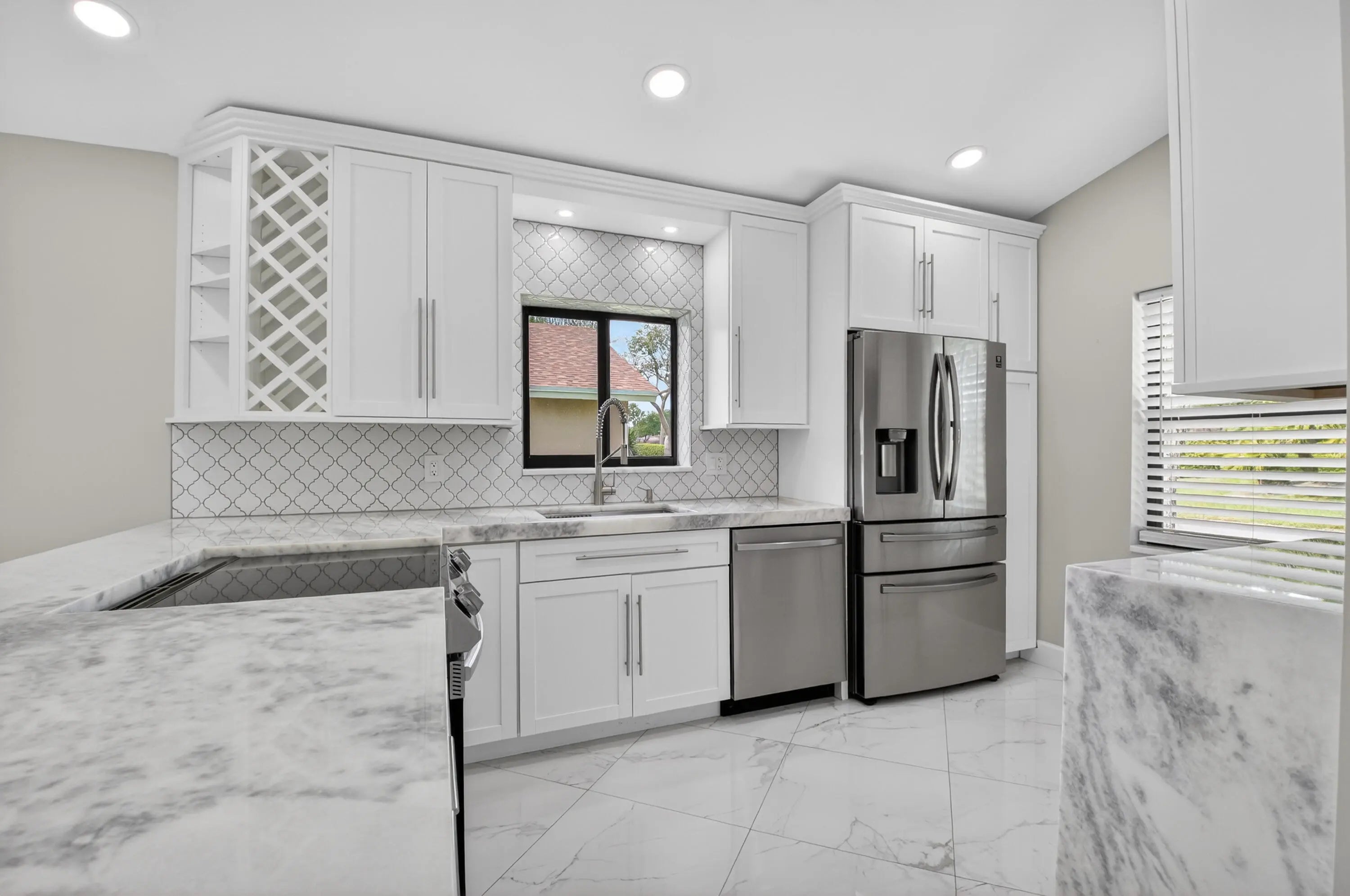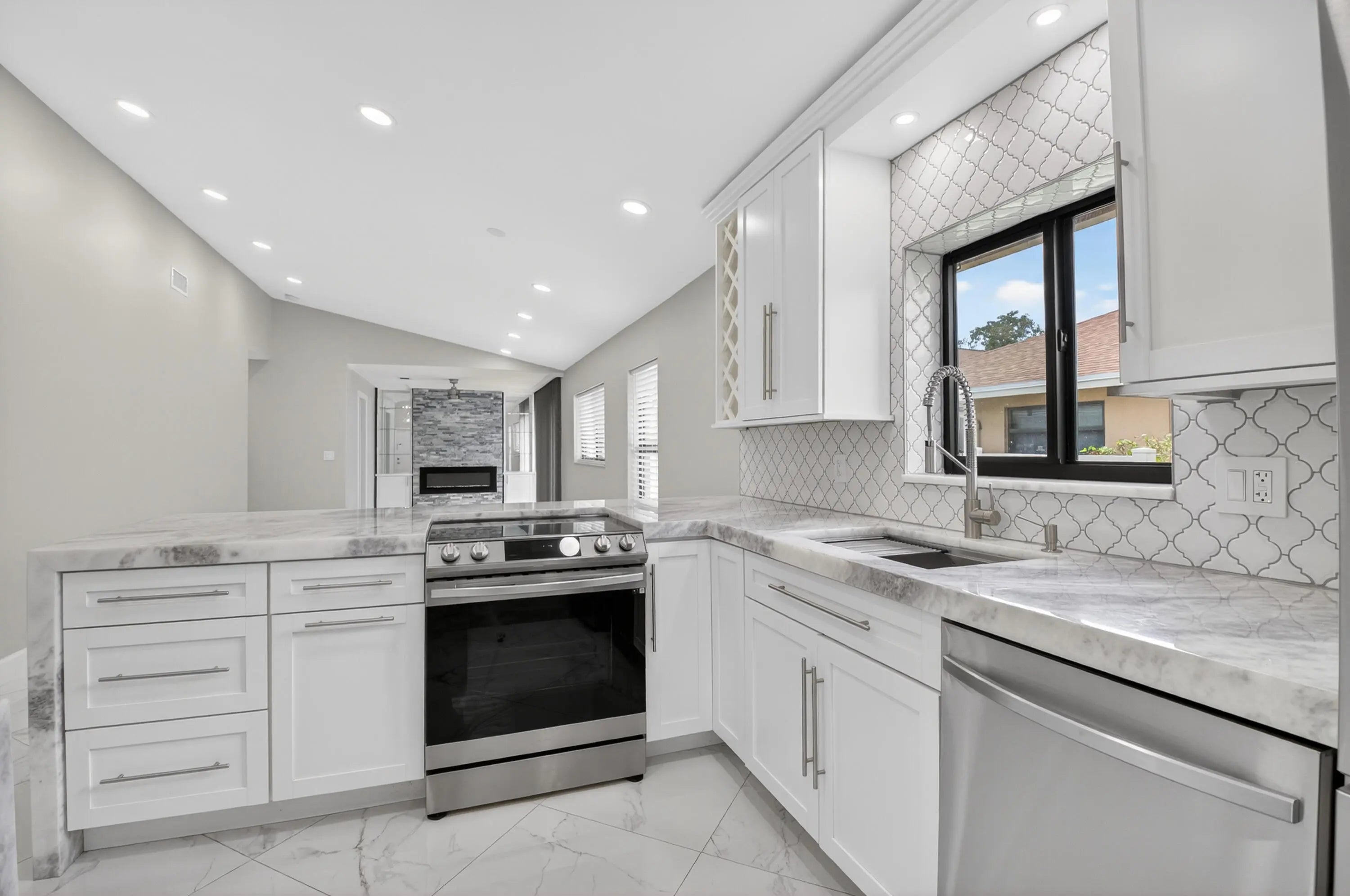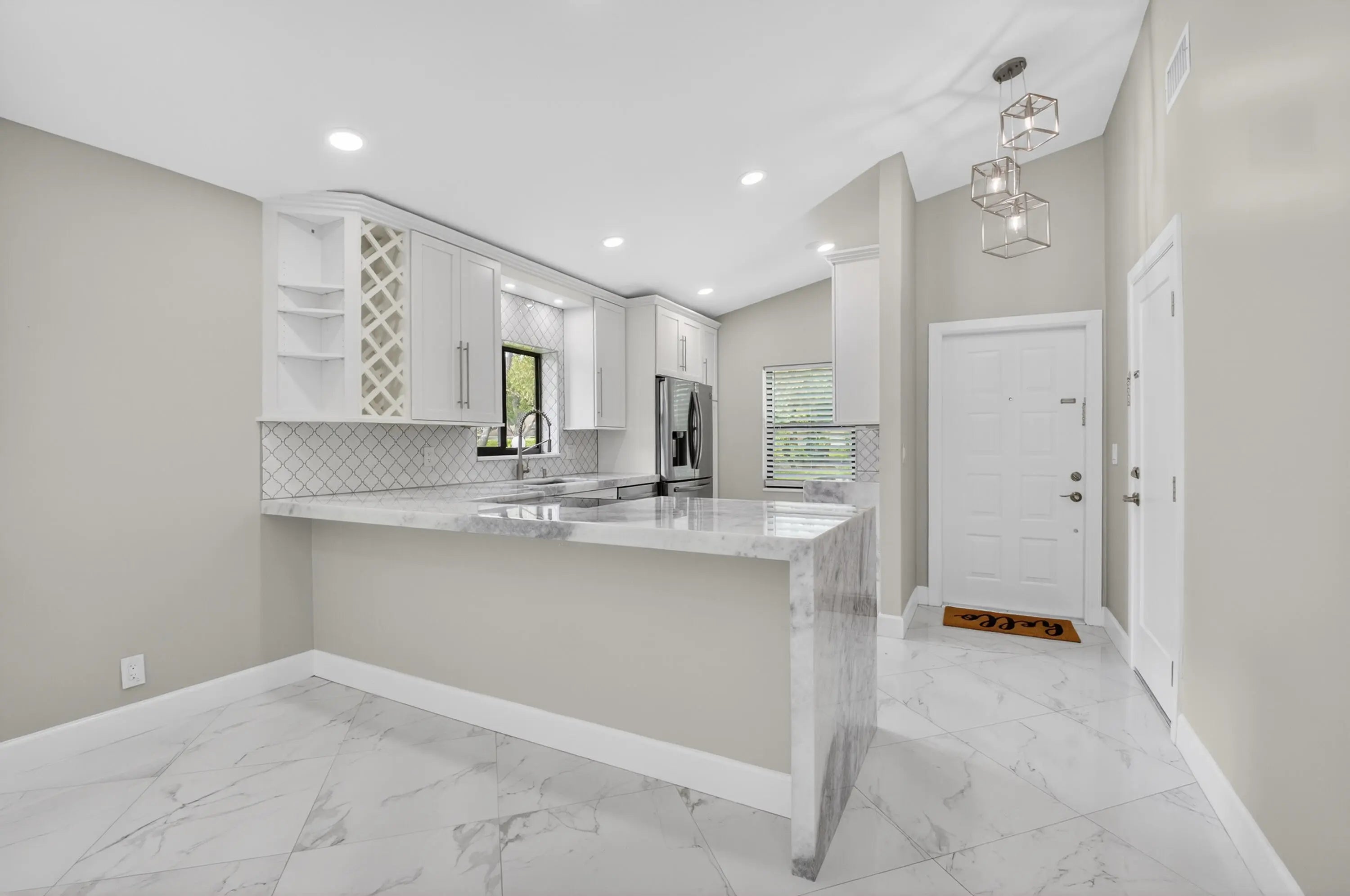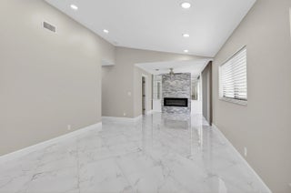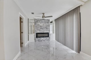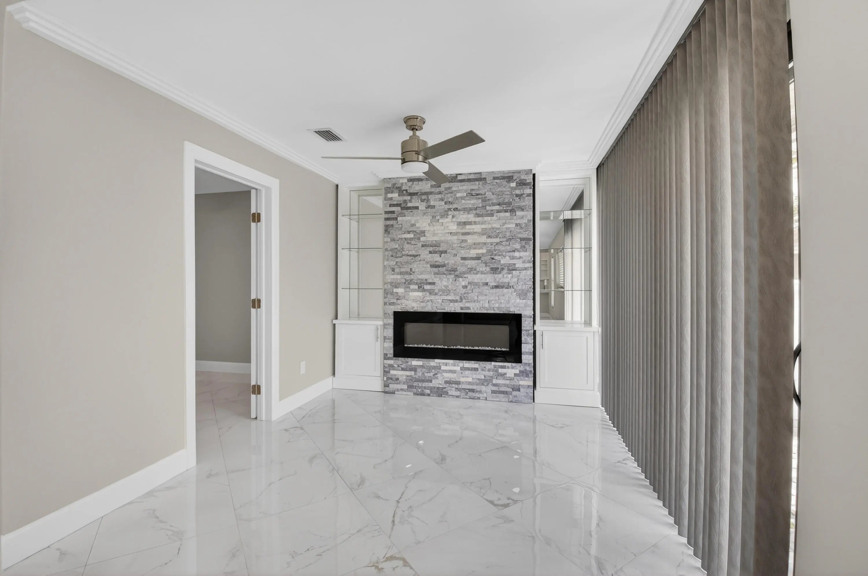 Spectacular fully renovated villa showcasing high-end designer finishes throughout. Custom quartz countertops and cabinetry, solid core doors, and impact windows provide style, quality, and peace of mind. Spacious primary suite offers a luxurious soaking tub, dual sinks, walk-in shower, and two closets including a large walk-in. This 2-bedroom, 2-bath home plus den features a decorator fireplace and a large paver patio perfect for entertaining. Enjoy all new high-efficiency appliances, NEW ROOF, AC, and HOT WATER HEATER. Located in the gated community of Whisper Walk with lush landscaping and resort-style amenities including clubhouse, Olympic-size heated pool, tennis, pickleball, and more. Close to shopping and major roads.
