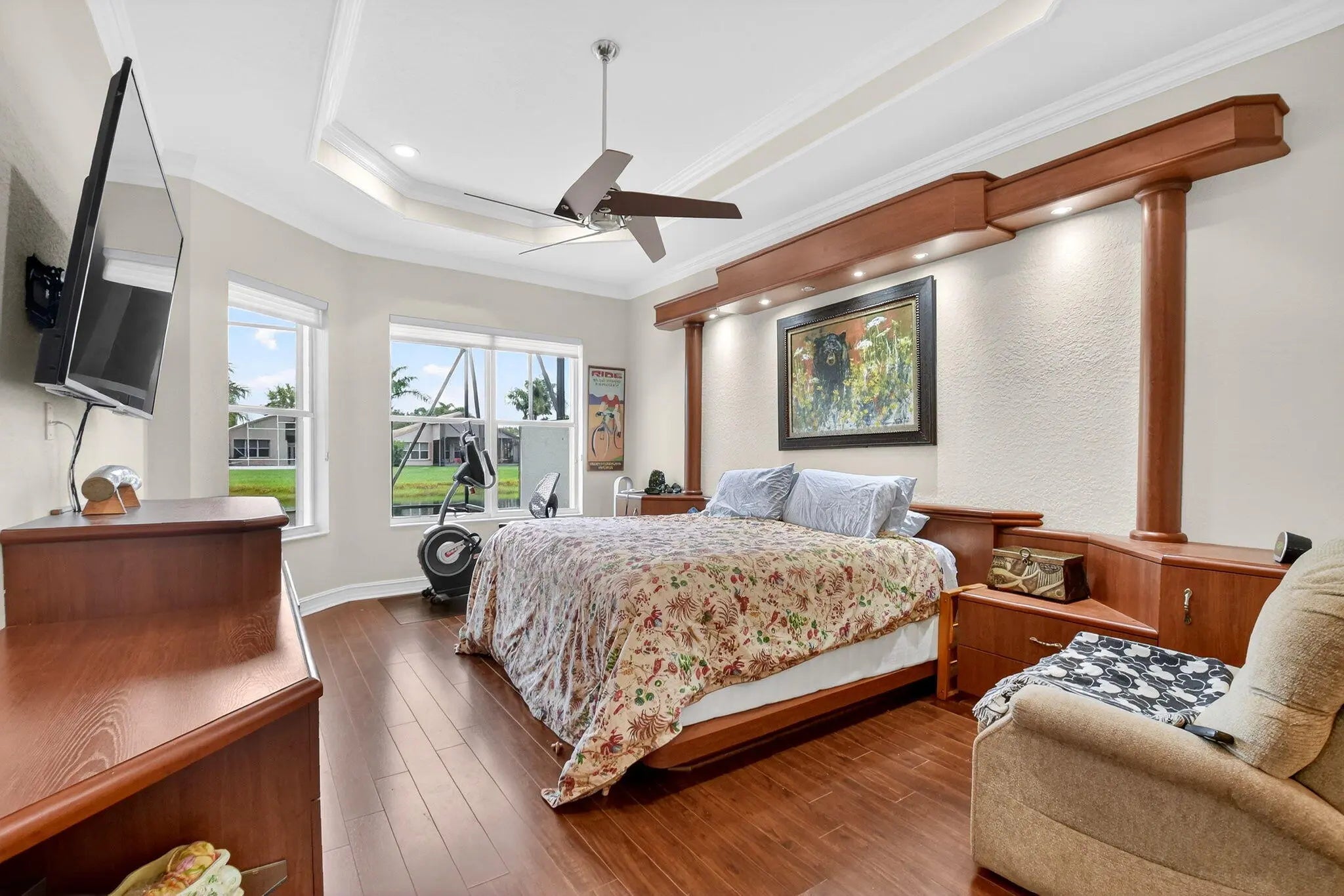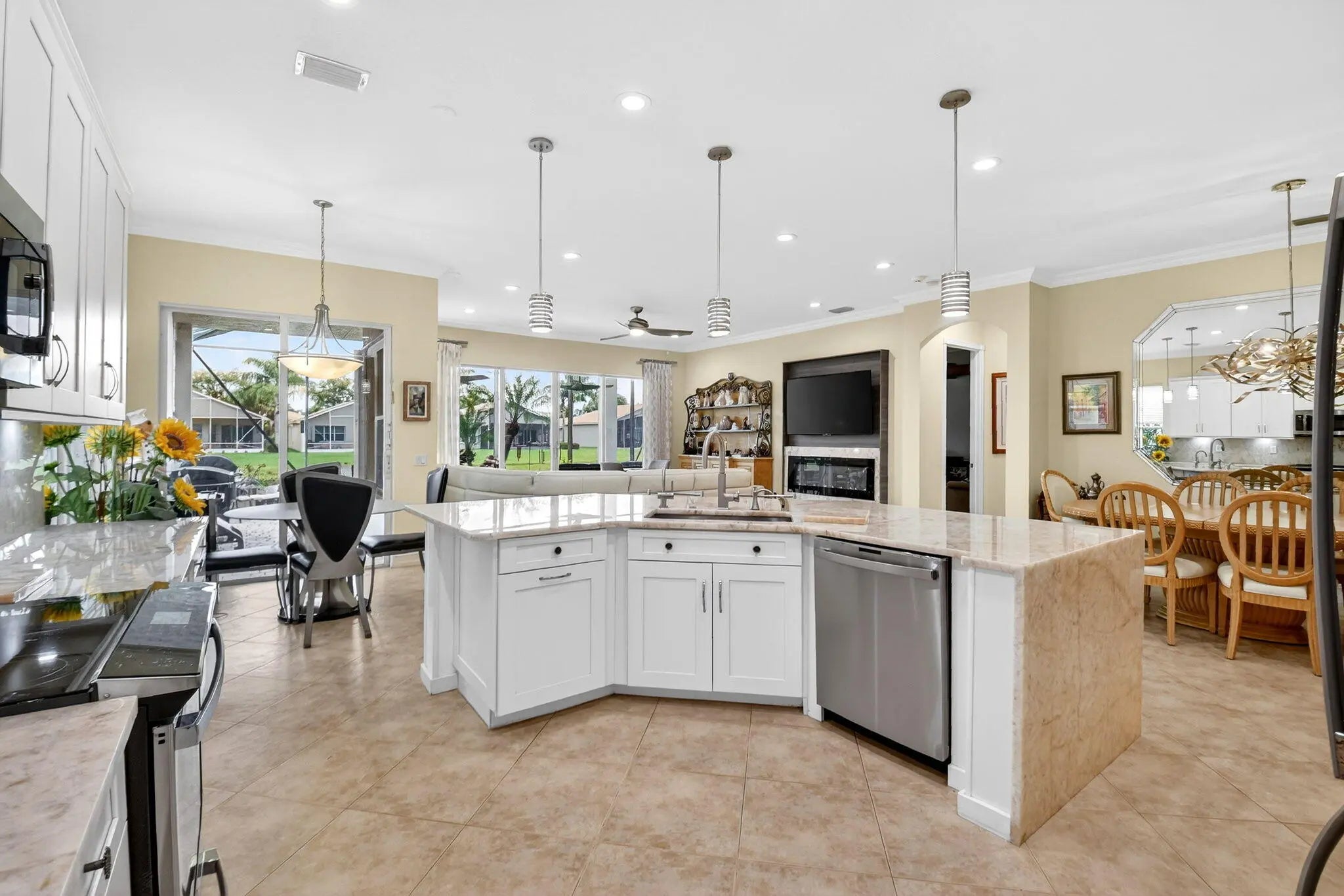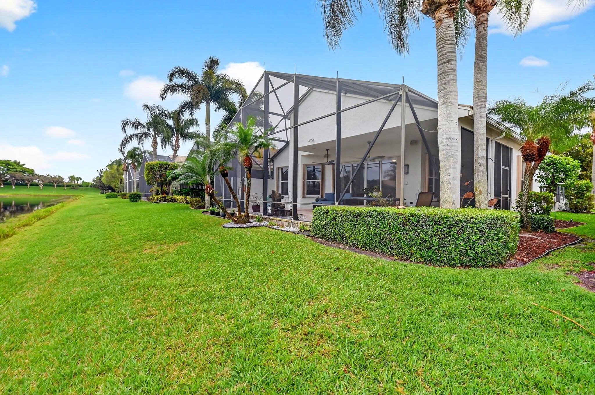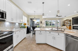 EQUISTITELY MAINTAINED 3 BEDROOM ATLANTIC MODEL GREAT ROOM HOME WITH WALL DOWN ON THE WATER. ACCORDIAN SHUTTERS THRUOUT. IMPACT GLASS ETCHED FRONT DOOR. CERAMIC TILE IN COMMON AREAS AND BATHROOMS WITH UPGRADED WOODEN DESIGN LAMINATES IN 3 BEDROOMS. ENHANCED FANS IN BEDROOMS, LIVINGROOMS AND PATIO. LARGE SHOWER WITH DUAL SINKS AND VANITY IN MASTER BATHROOM. OVERSIZED EXTENDED SCREEN PATIO WITH UPGRADED PAVERS AND LAVISH WATERFALL. LARGE OPEN GOURMET KITCHEN COMPLETELY RENOVATED CABINETS WITH QUARTIZE COUNTERS. HIGH QUALITY WOODEN BUILTINS IN MASTER BEDROOM AND DEN. VALENCIA SHORES IS A VERY ACTIVE 55+ COMMUNITY. LARGE CAFE, PICKLEBALL, TENNIS, BOCCEBALL, BILLIARDS, RACKETBALL, 2 LARGE POOLS, 2 HOT TUBS, SAUNA, STEAM ROOM, TENNIS PRO, SOCIAL DIRECTOR AND MORE.