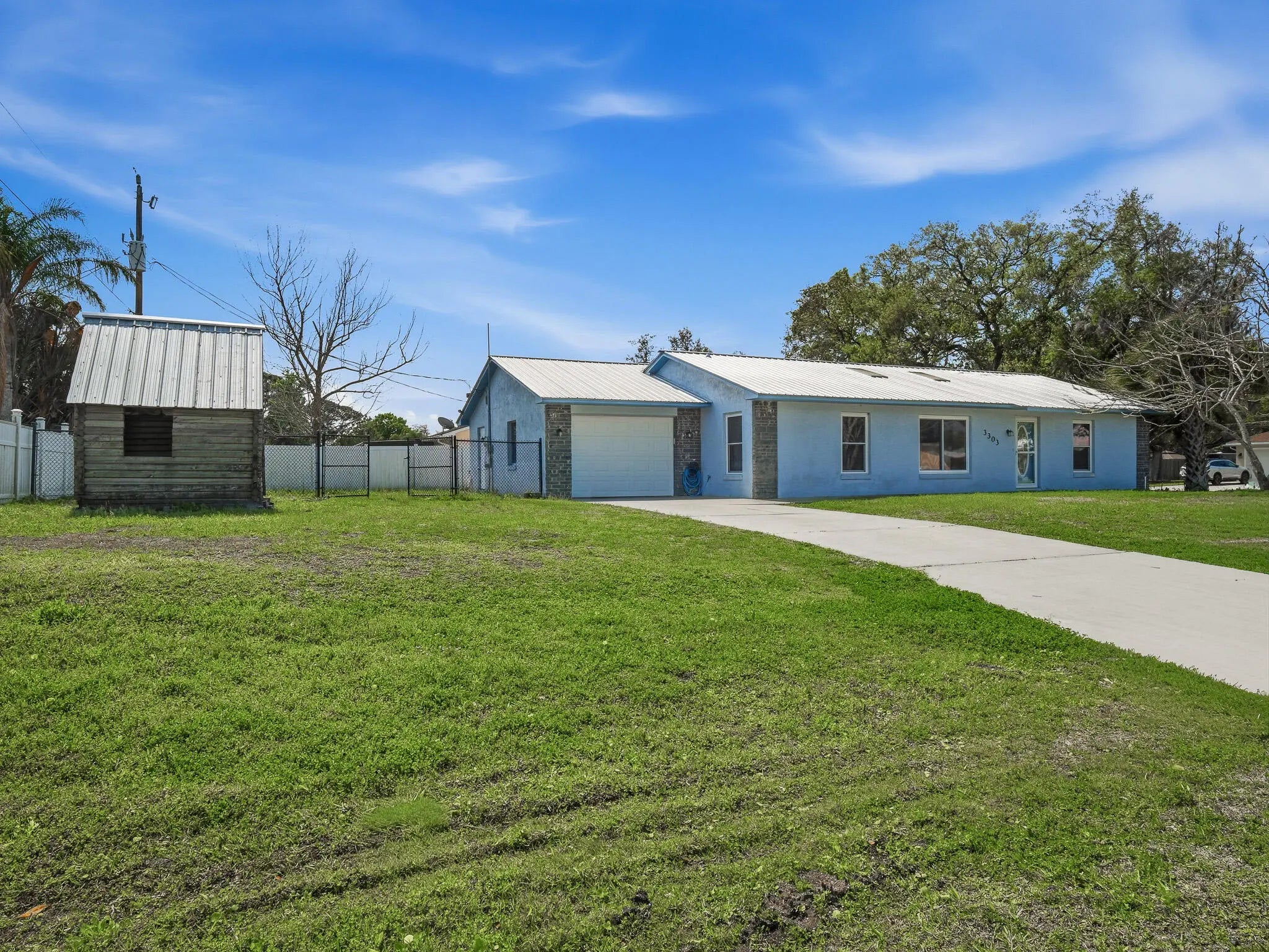 3-bedroom, 2-bath home featuring a desirable open floor plan and split-bedroom layout for added privacy. The updated kitchen boasts modern finishes, stainless steel appliances, and ample cabinet space, perfect for both everyday living and entertaining. Enjoy additional living space in the bright Florida room, ideal for relaxing or hosting guests. This home also includes an inside laundry room for convenience, a 1-car garage with a separate storage room, and a durable metal roof for long-term peace of mind. The full fenced yard offers privacy and plenty of space for outdoor activities, pets, or gardening.
