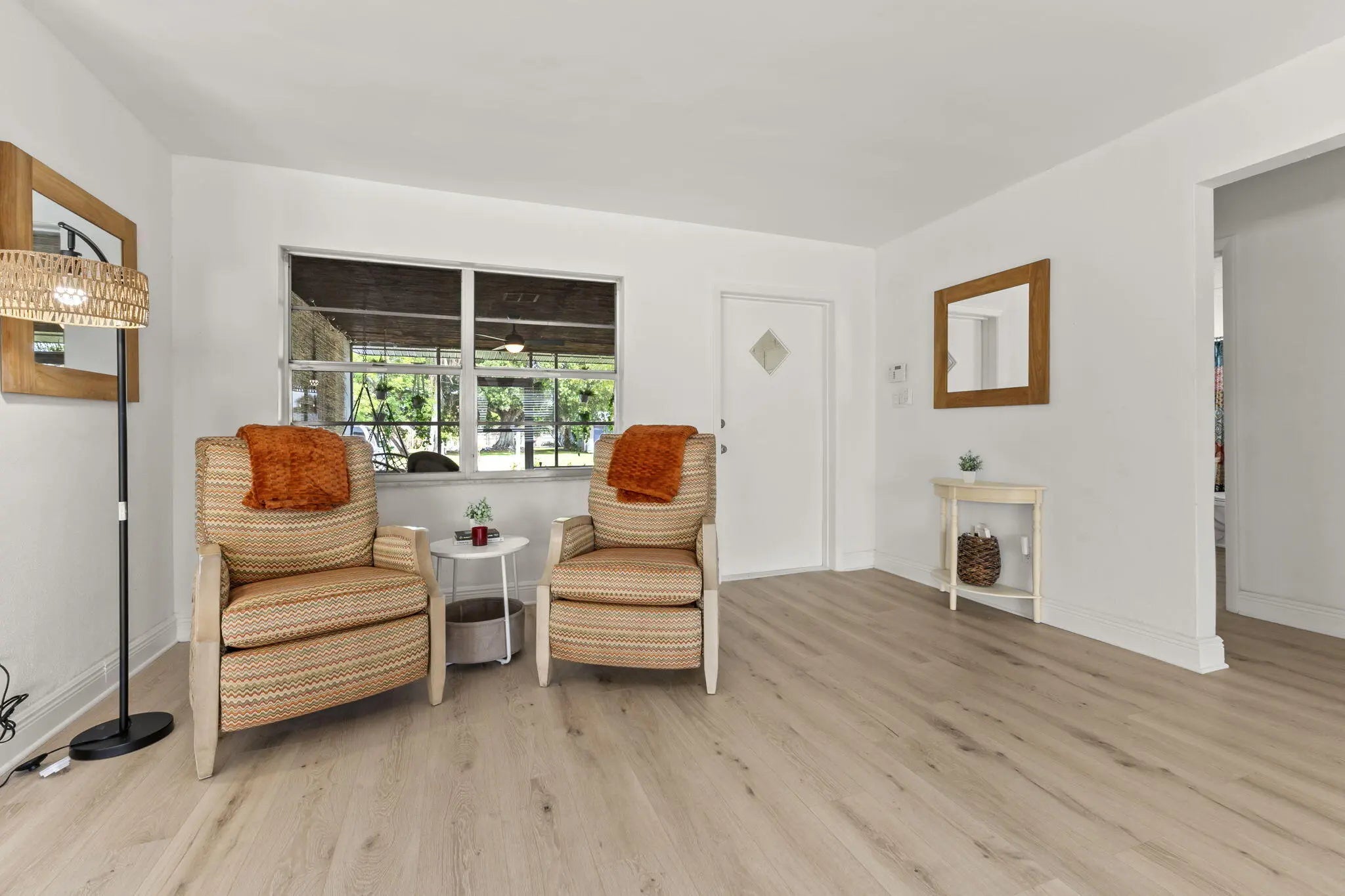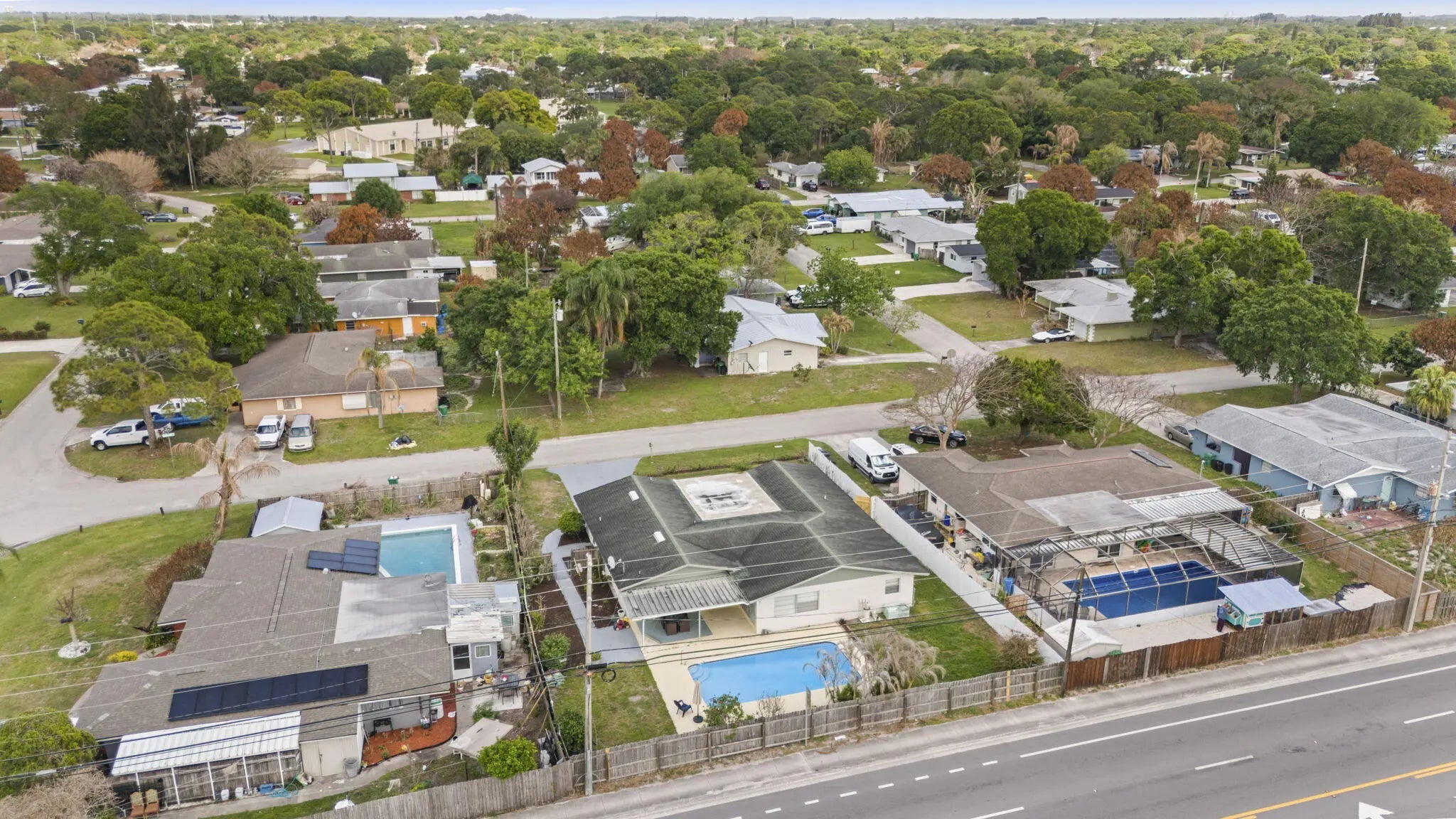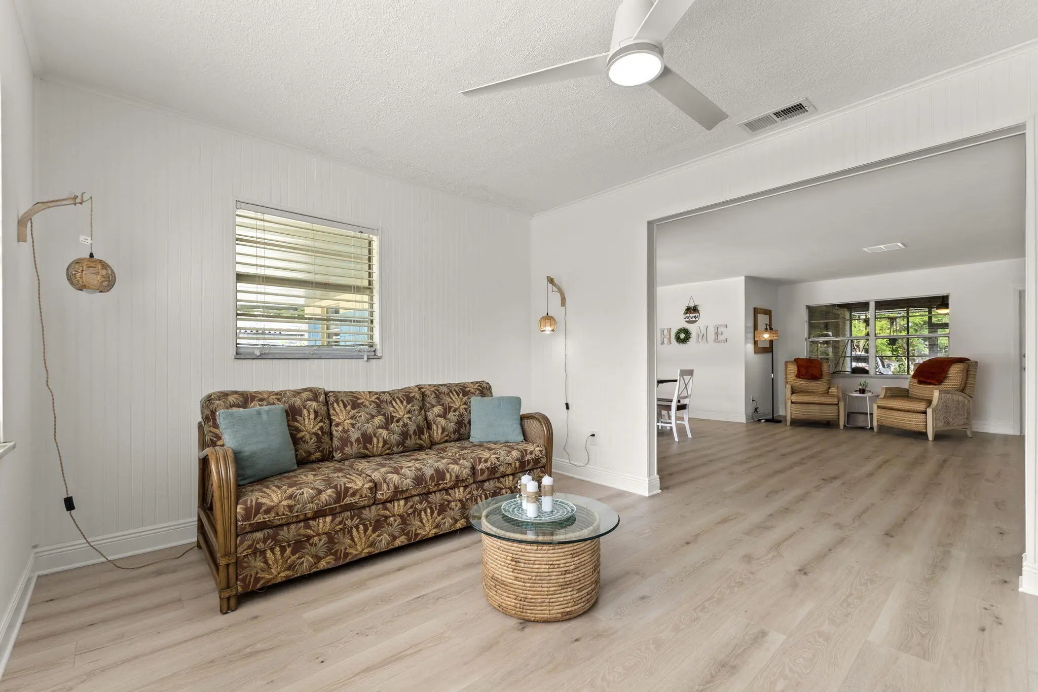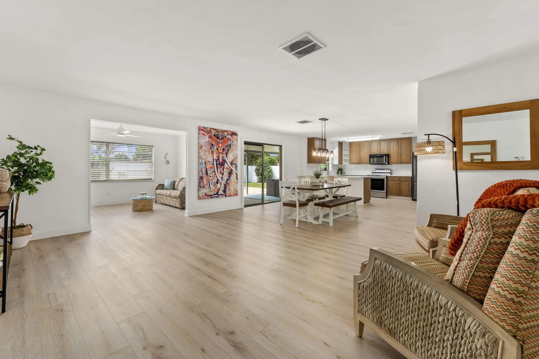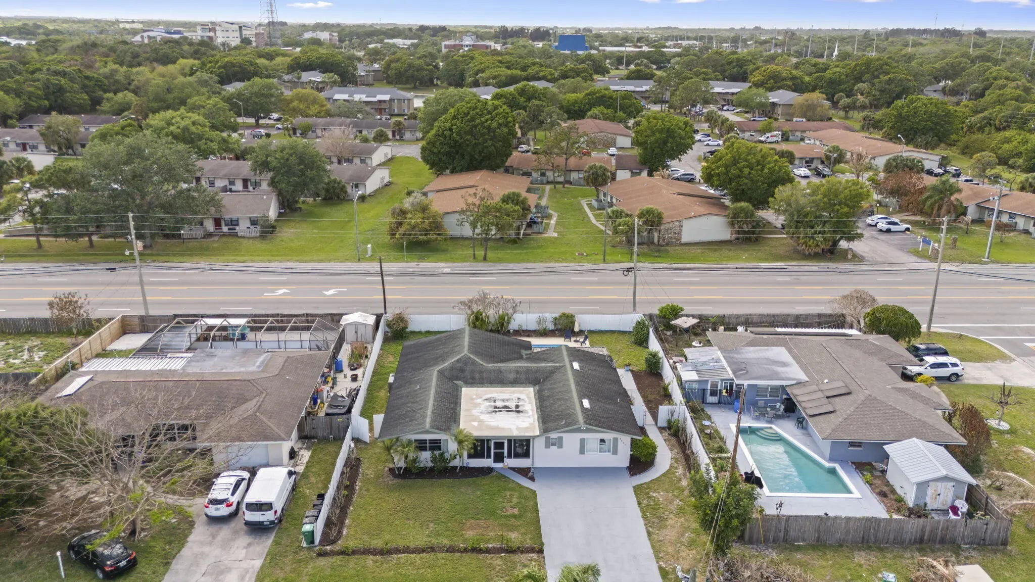 This beautifully remodeled pool home offers a unique layout with a 3-bedroom, 2-bath main residence plus a 1-bedroom, 1-bath apartment—perfect for guests, extended family, or rental income. The home features a large open kitchen that flows into the dining and living areas, creating the ideal space for entertaining. Laminate flooring runs throughout the living areas, giving the home a clean, modern feel. A separate 10x11 flex room can easily be converted into another bedroom or a private office. Enjoy Florida living outdoors with a refinished pool, fenced backyard, and a large front screened porch complete with hanging swings and bamboo ceilings—a perfect spot to relax and unwind. With its versatile floor plan, upgraded finishes, and inviting outdoor spaces, this home is move-in ready.