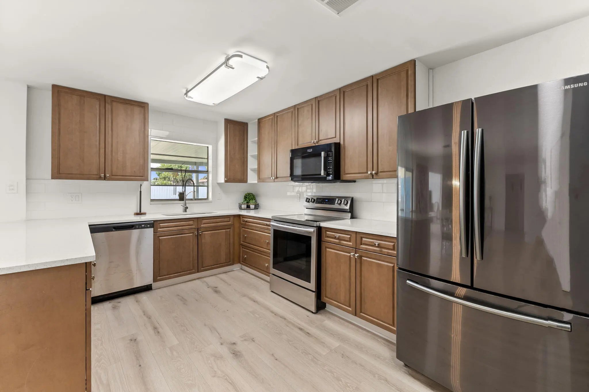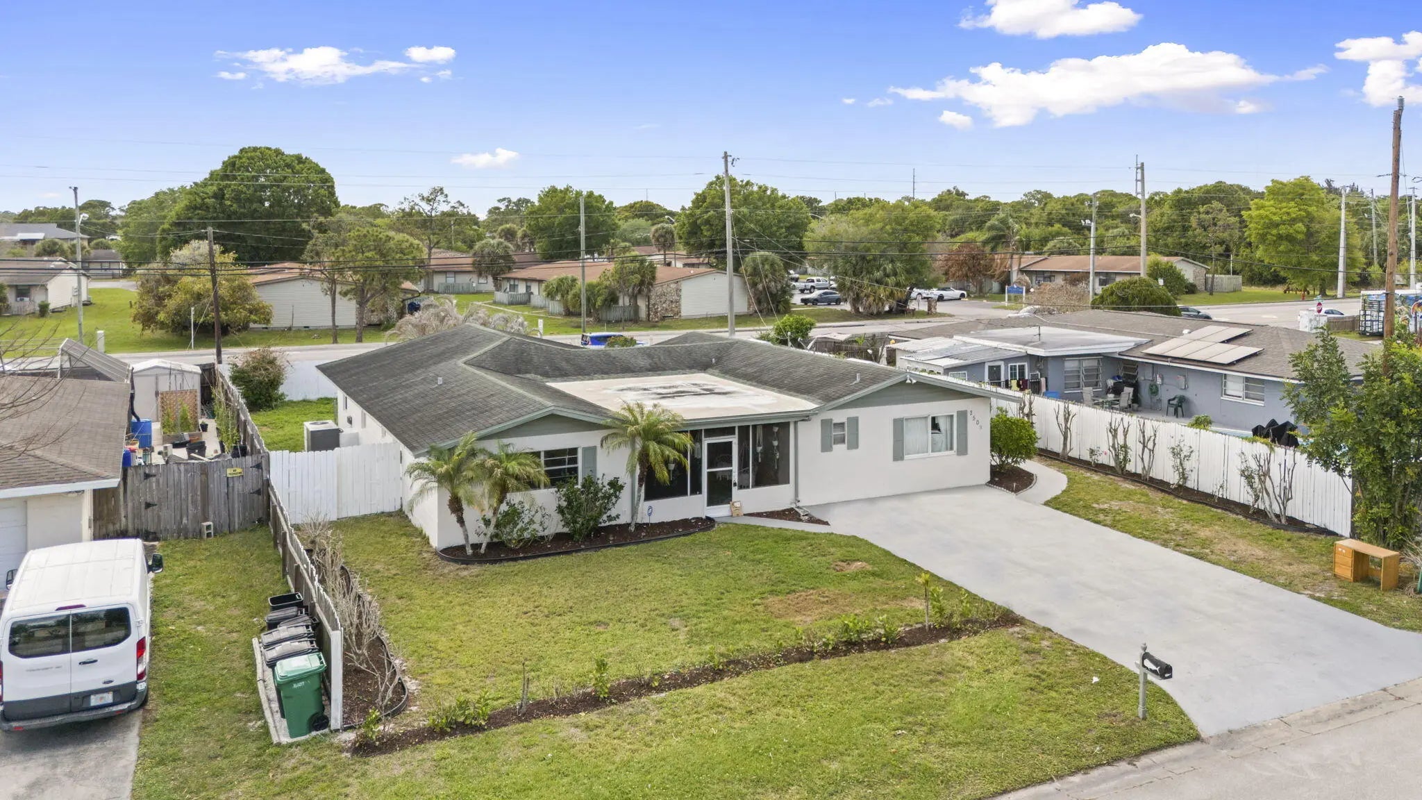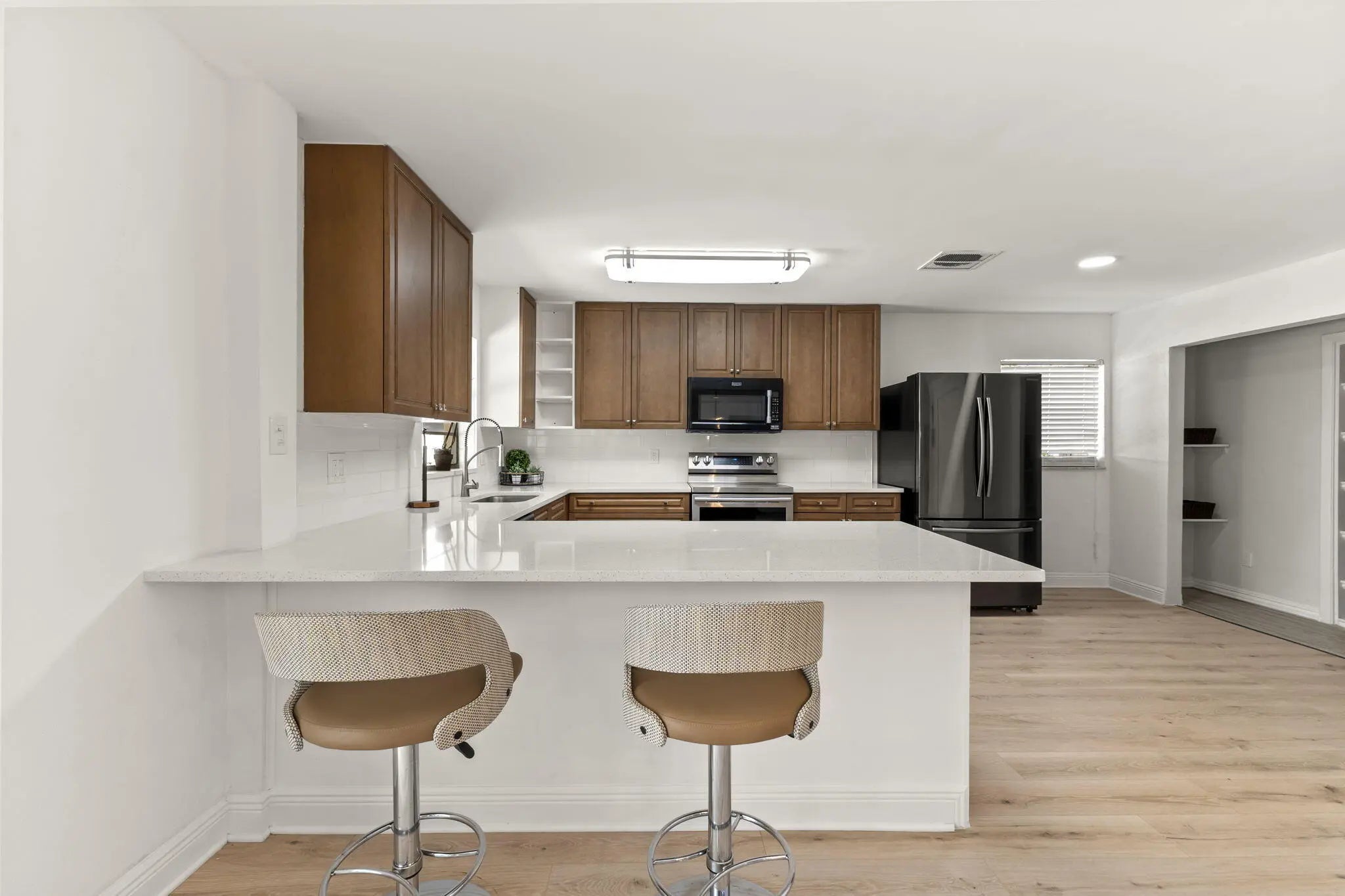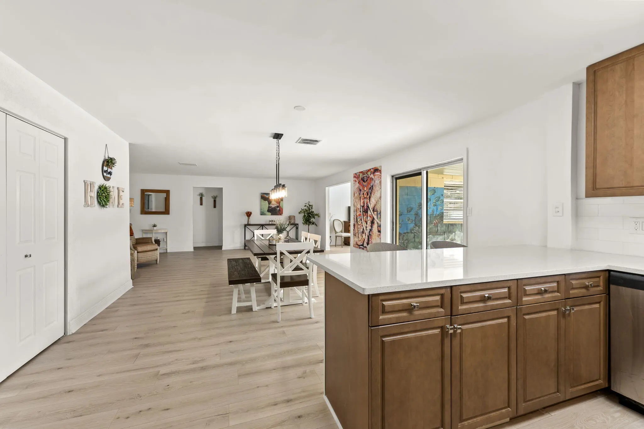 This beautifully remodeled pool home offers a unique layout with a 3-bedroom, 2-bath main residence plus a 1-bedroom, 1-bath apartment—perfect for guests, extended family, or rental income. The home features a large open kitchen that flows into the dining and living areas, creating the ideal space for entertaining. Laminate flooring runs throughout the living areas, giving the home a clean, modern feel. A separate 10x11 flex room can easily be converted into another bedroom or a private office. Enjoy Florida living outdoors with a refinished pool, fenced backyard, and a large front screened porch complete with hanging swings and bamboo ceilings—a perfect spot to relax and unwind. With its versatile floor plan, upgraded finishes, and inviting outdoor spaces, this home is move-in ready.