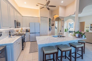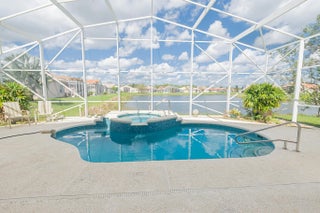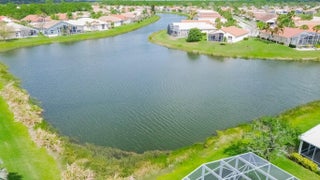 Absolutely pristine and upgraded "Chardonnay" floorplan in Cascades This custom 3/2/2 home with flex room has 2,211 sq. ft. under air features tile floors and LVT in most areaa. Enjoy true Florida living in the gas heated screened pool and spillway spa overlooking a magnificent, tranquil lake. Kitchen has 42'' cabinets, marble counters, stainless appliances, Samsung Custom Color 4-door French door refrigerator, gas cooking. Accordion hurricane shutters, stained glass double door entry. Premier 55+ resort-style community offering a 26,000 sq. ft. clubhouse, 10 Har-Tru tennis courts, a 9-hole golf course, fitness center, and a poolside tiki bar. HOA fees include lawn care, cable, high-speed internet, and 24/7 manned security. Move-in ready and perfectly situated for sunset views!