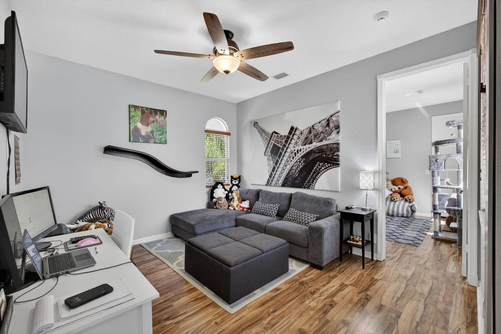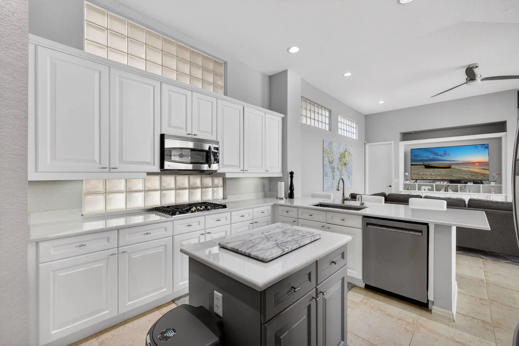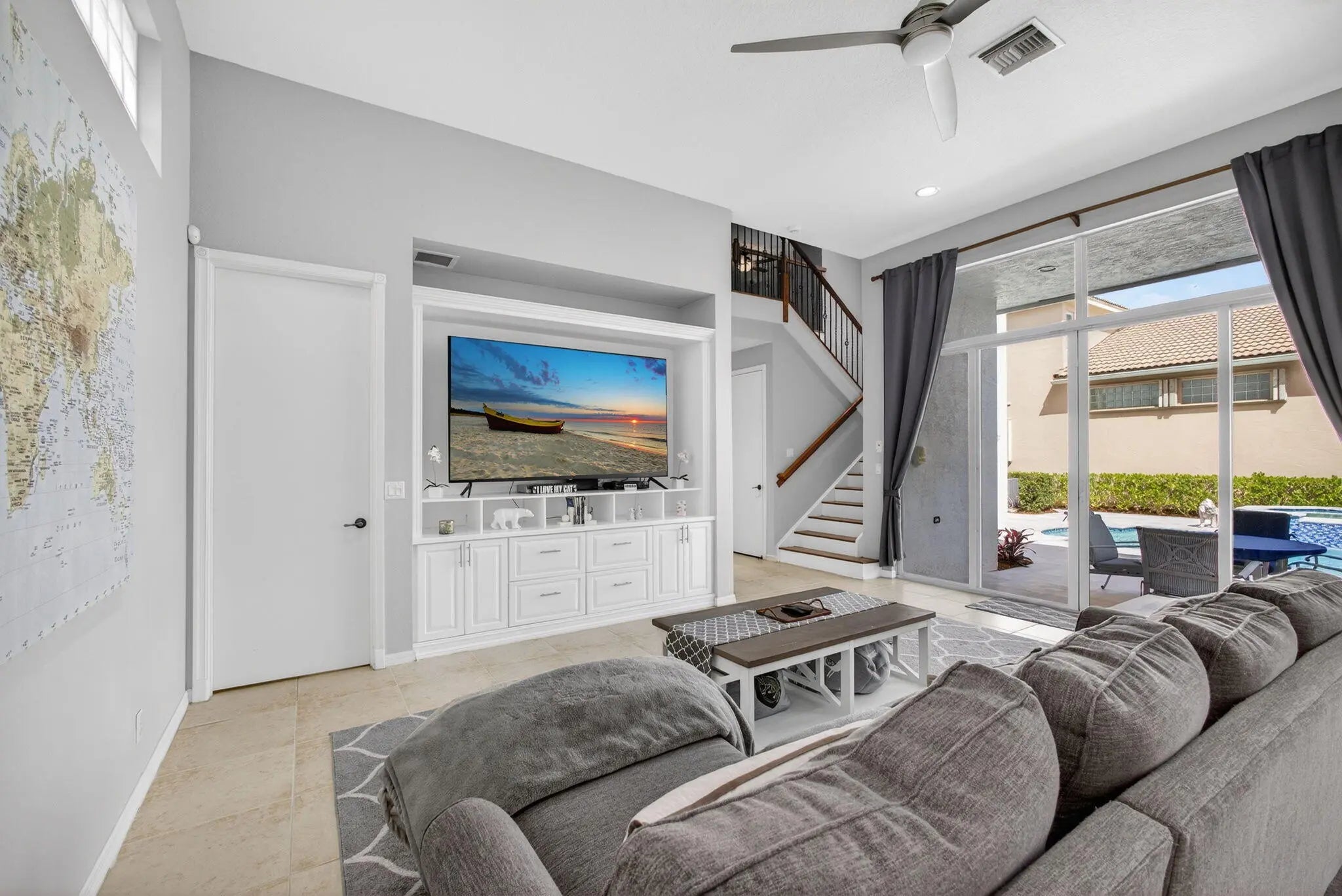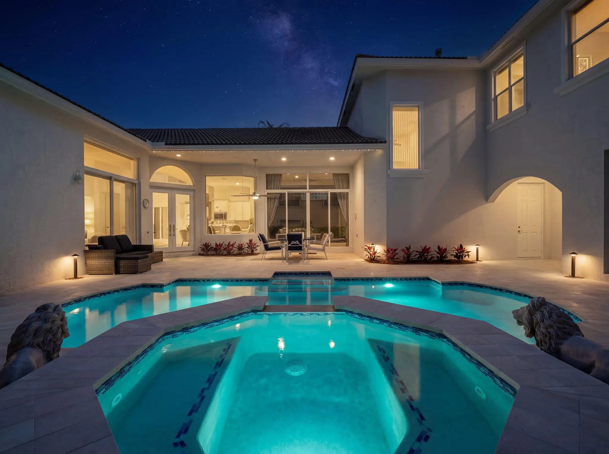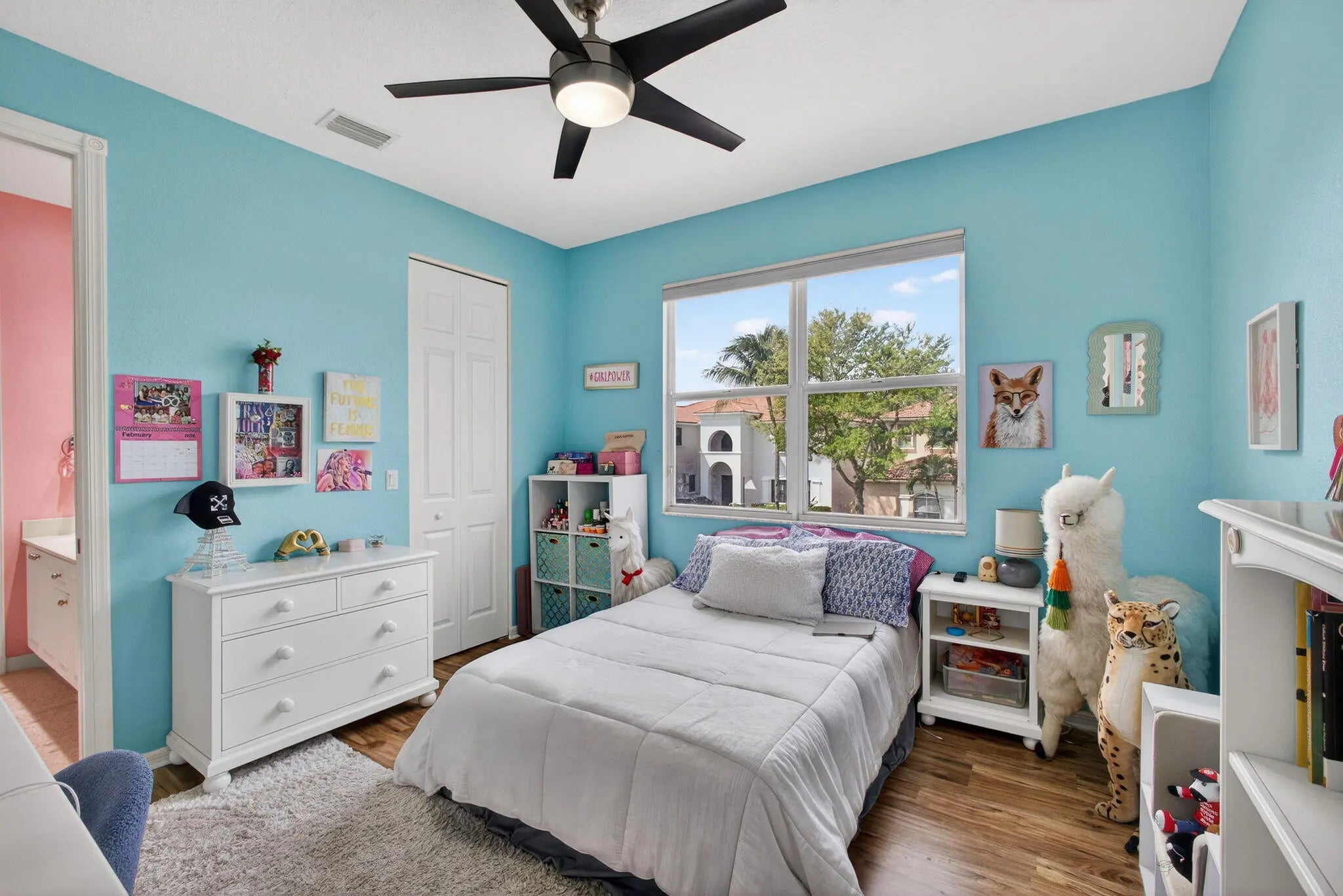 A must-see Courtyard Home in Mirabella on one of the Nicest Lake-Front Lots in the Community has both a fenced-in backyard & a spectacular redone Heated Pool/Spa w/Travertine Marble Courtyard & Patio. Nice Separate "Guest House by Pool. The 1st Floor features a Huge Master Suite with double Walk-in Closets w/ views of the lake & pool, High-Ceiling & Lots of Windows & Light around open Kitchen & Family Rm & open Living & Dining rm. Updated kitchen features quartz C-tops, wood cabinetry, updated Appliances, island & breakfast bar. Upstairs has newer composite flooring & features a Junior Suite, a nice Loft & two additional guest suites with Jack & Jill baths. Only Model with 5 BR's Plus a Loft, 4.5 Baths, Lots of Storage, 3 Car Garage & wow indoor & outdoor versatile & open living areas! Mirabella is one of the best-managed guard-gated resort-style communities in all of the Northern Palm Beaches with 24/7 Manned Guard Gate, resort-style amenities: a Renovated Clubhouse with Social Events and on-site property managers, one of the best Tennis Facilities, and a workout room for a non-country club community in the entire area, a separate kids' Clubhouse with a gated playground, and Heated Pool.