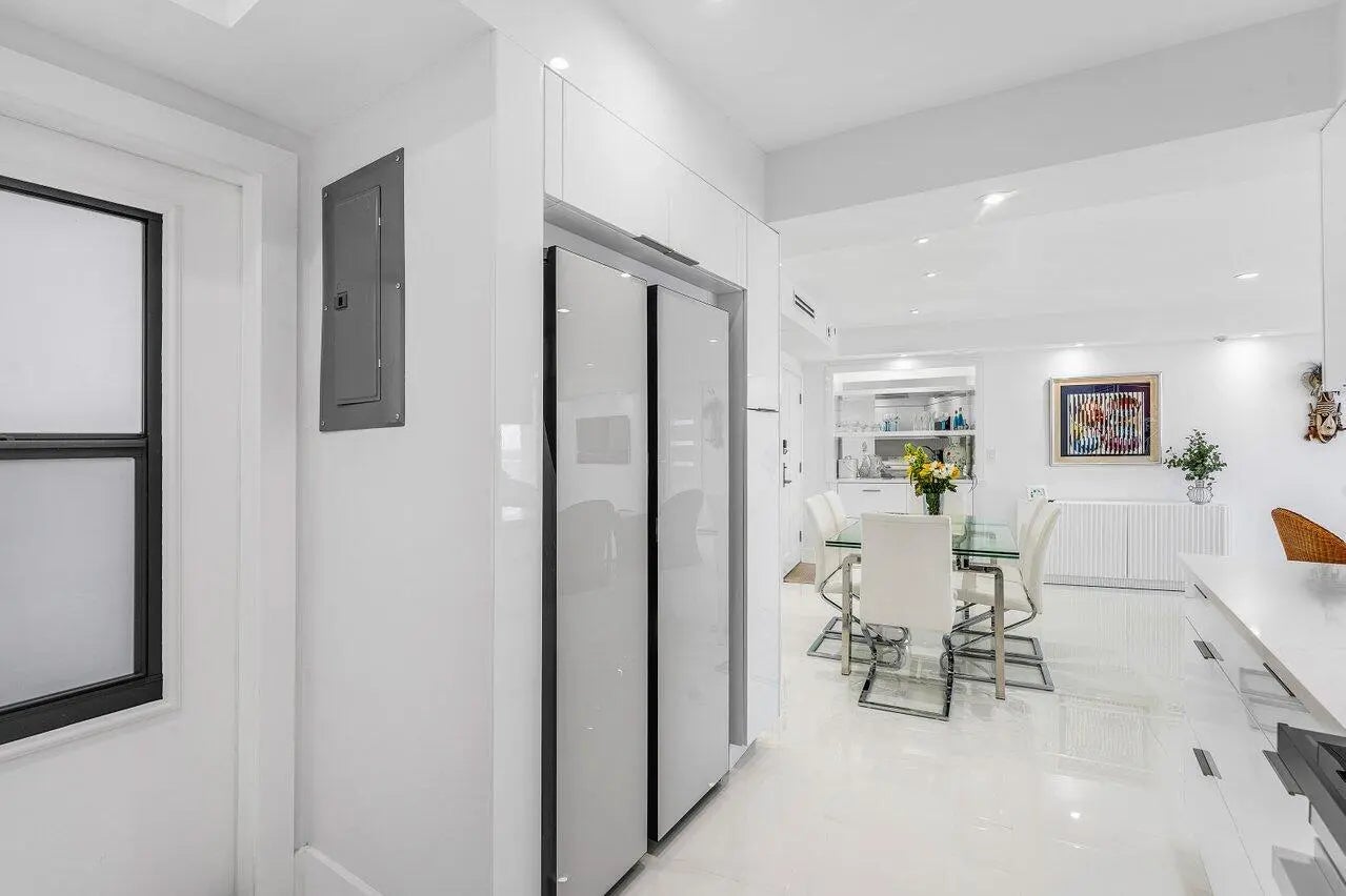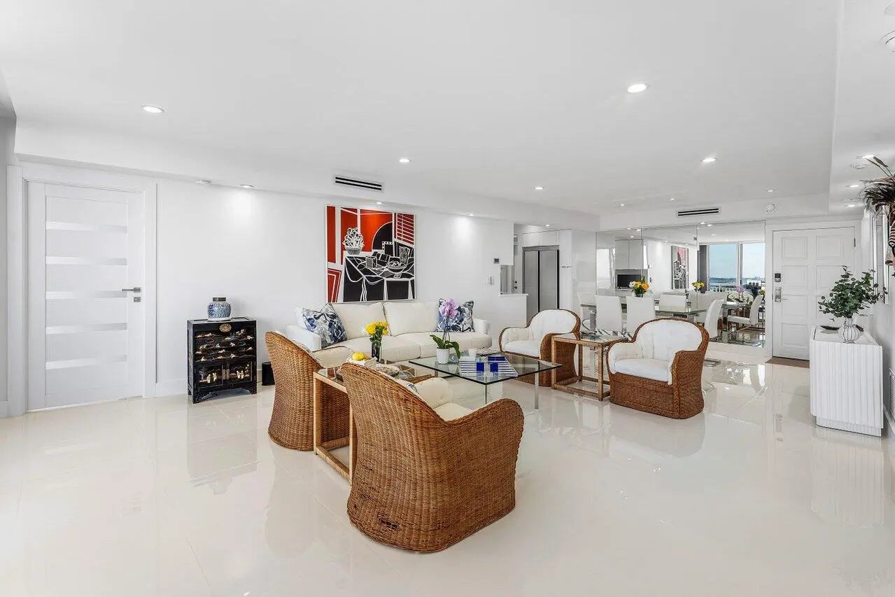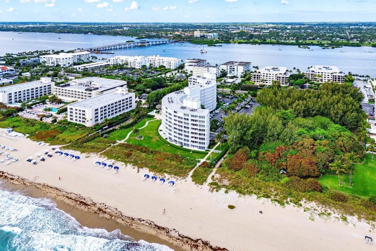 Palm Beach oceanfront. Gut renovated 2025. Move-in ready with ocean sunrise and Intracoastal sunset views. 2BR/2BA split plan featuring dual primary suites and designer finishes throughout. Bright, modern interior with large-format porcelain tile, recessed lighting and electric blinds. Open kitchen with Calacatta-style quartz, full-height backsplash and Samsung Bespoke appliance suite. Spacious suites with walk-in showers and generous closets. Spa-inspired baths with floating vanities, dual sinks and LED lighted mirrors. Freshly painted throughout. New hurricane impact floor to ceiling sliders. A+ building with wide sandy beach and dunes, heated pool with windscreen, fitness center, BBQ, storage and beach cabanas. Co-op rules: 3-6 month rental with 1 year hold. Must see.