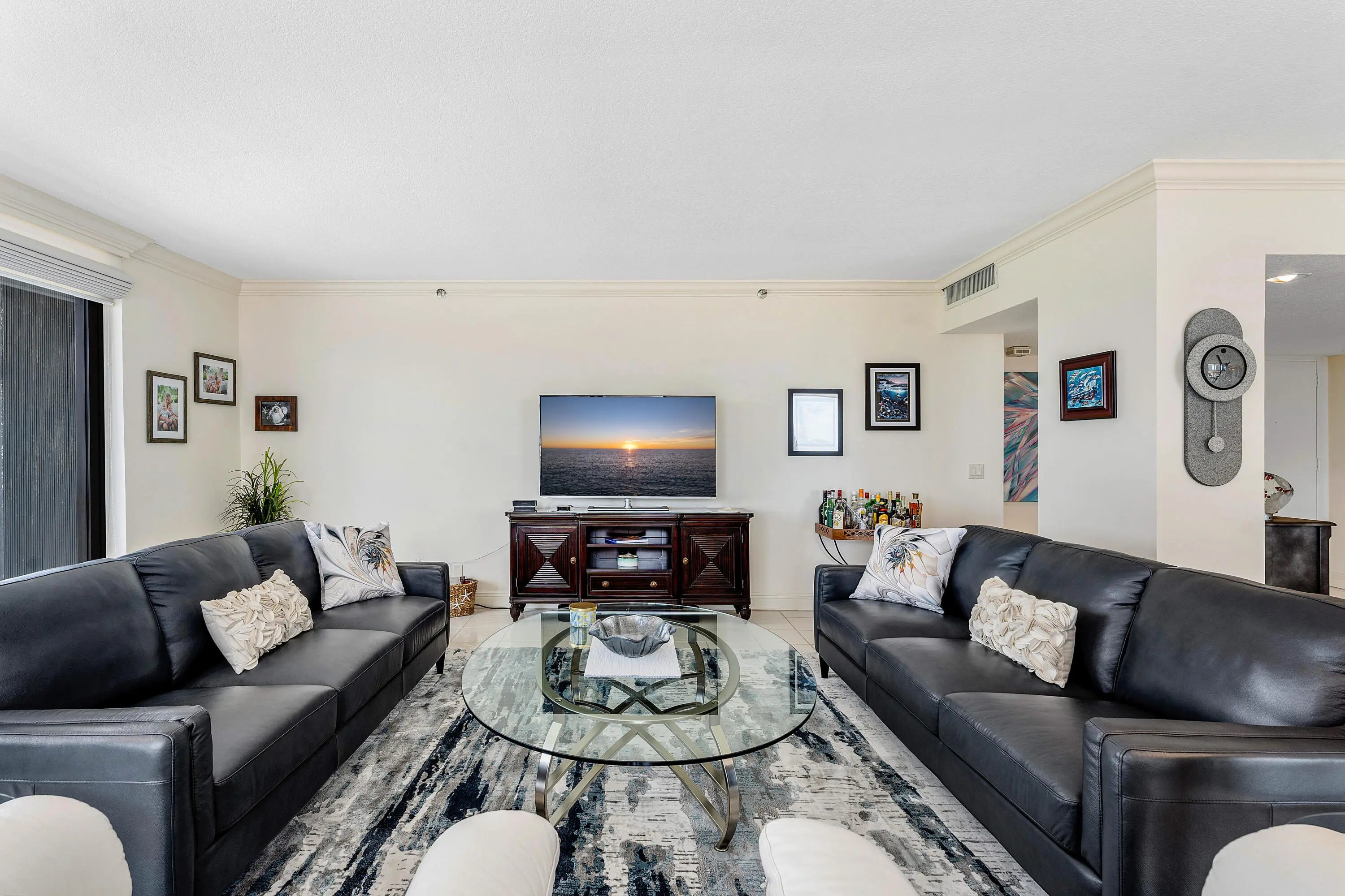Experience refined coastal living in this beautifully appointed residence at 4100 North Ocean Drive, ideally positioned on the coveted shores of Singer Island. This expansive condominium offers a seamless blend of comfort, elegance, and breathtaking scenery, with sweeping views of the Intracoastal Waterway and glimpses of the Atlantic Ocean from multiple vantage points. Step inside to discover a light-filled, open-concept layout designed for both relaxation and entertaining. The spacious living and dining areas are framed by floor-to-ceiling glass sliders that lead to an oversized, curved private terrace, perfect for morning coffee, sunset cocktails, or simply enjoying the ocean breeze. The interior showcases timeless finishes, including a well-appointed kitchen with granite countertops, custom cabinetry, and premium stainless steel appliances. The primary suite serves as a tranquil retreat, complete with private balcony access, generous closet space, and a spa-inspired bath. An additional bedroom is thoughtfully designed for comfort and privacy, making this home ideal for hosting guests or creating a serene work-from-home environment. Residents enjoy access to an array of premier amenities, including a resort-style pool and spa, state-of-the-art fitness center, tennis and pickleball courts, and direct access to pristine beaches. A full-service lobby, clubhouse, and on-site management enhance both convenience and peace of mind, elevating everyday living to a resort-like experience. Perfectly located on Singer Island, this exceptional property offers the ultimate South Florida lifestyle, where luxury, tranquility, and coastal beauty converge.