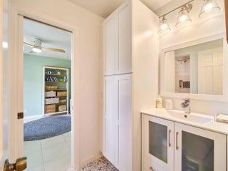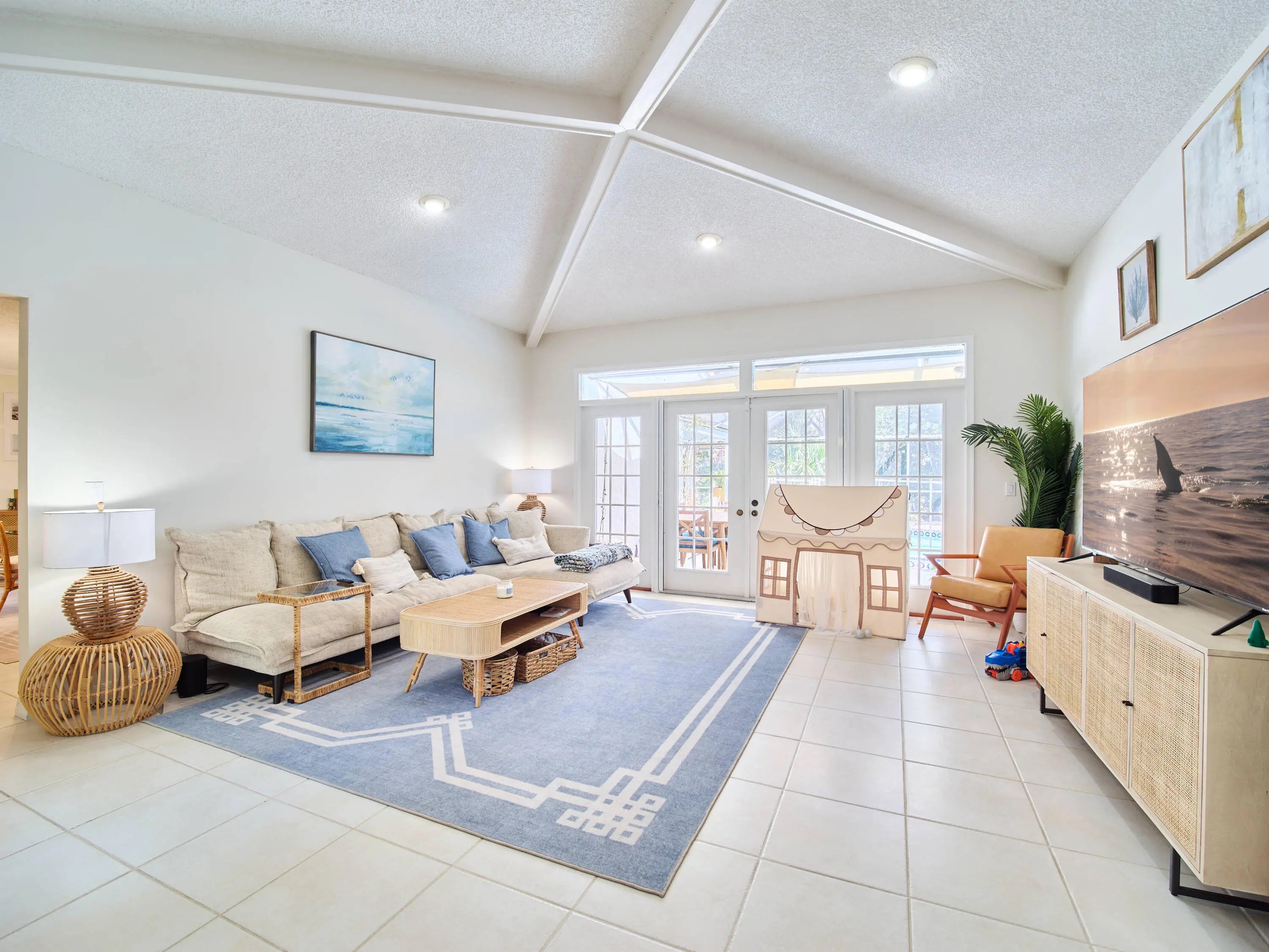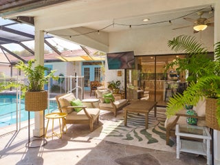 Beautifully reimagined residence showcasing a stunning 2024 designer kitchen with quartz countertops, illuminated white cabinetry, matte gold hardware, Bedrosian tile backsplash, porcelain farmhouse sink, artistic tile island detail, wine fridge, soft-close doors and drawers, and new appliances (2024-2025). Interior highlights include new lighting in the kitchen and dining areas, plantation shutters throughout, updated guest bath cabinetry, custom built-ins in the utility room, and a luxurious primary bath with quartz counters, soaking tub, and custom closet systems offering abundant storage. Outdoor living shines with a stamped concrete pool deck, driveway and walkway, refreshed outdoor wet bar complete with a quartz counter and copper sink (2023), electric heated pool (2021) and spa. Additional updates include new AC (2024), washer/dryer (2025), fresh exterior paint (2024), new gutters (2025), tankless hot water heater, and re-screened enclosure (2025). There is also a generator hook up.