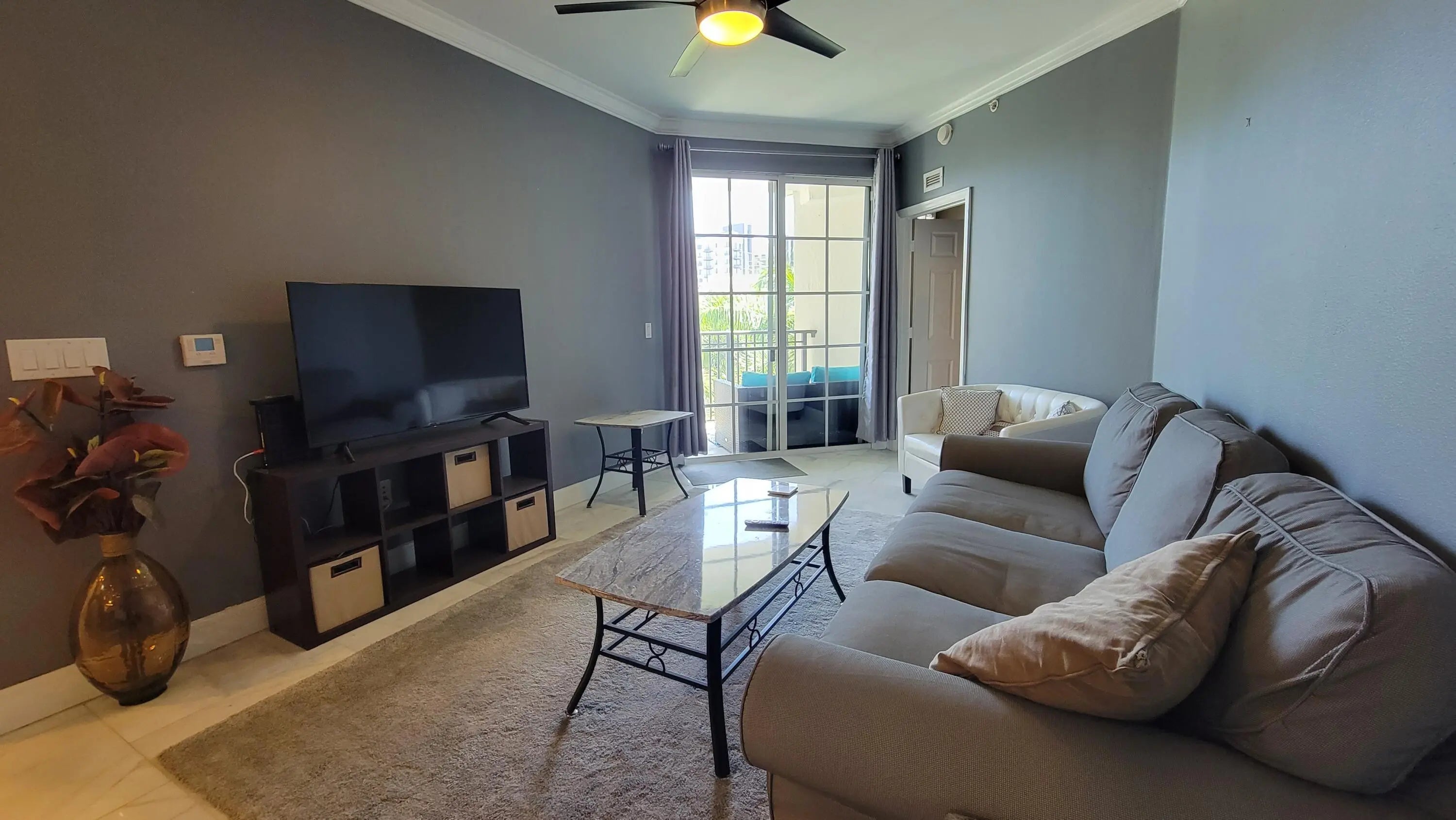Walk out on your top floor balcony with your favorite beverage and enjoy the gorgeous view of the pool. This recently renovated, modern Condo comes fully furnished (changes to furnishings are negotiable), including 3 TVs, sofa, queen bed in master bedroom, and two single beds in guest bedroom. There are marble floors throughout the living room and kitchen area, and the master bathroom has just been renovated. Solé offers first rate amenities including a swimming pool, whirlpool, fitness center, gated garage parking, and grilling/community areas. High-speed internet is provided for free.