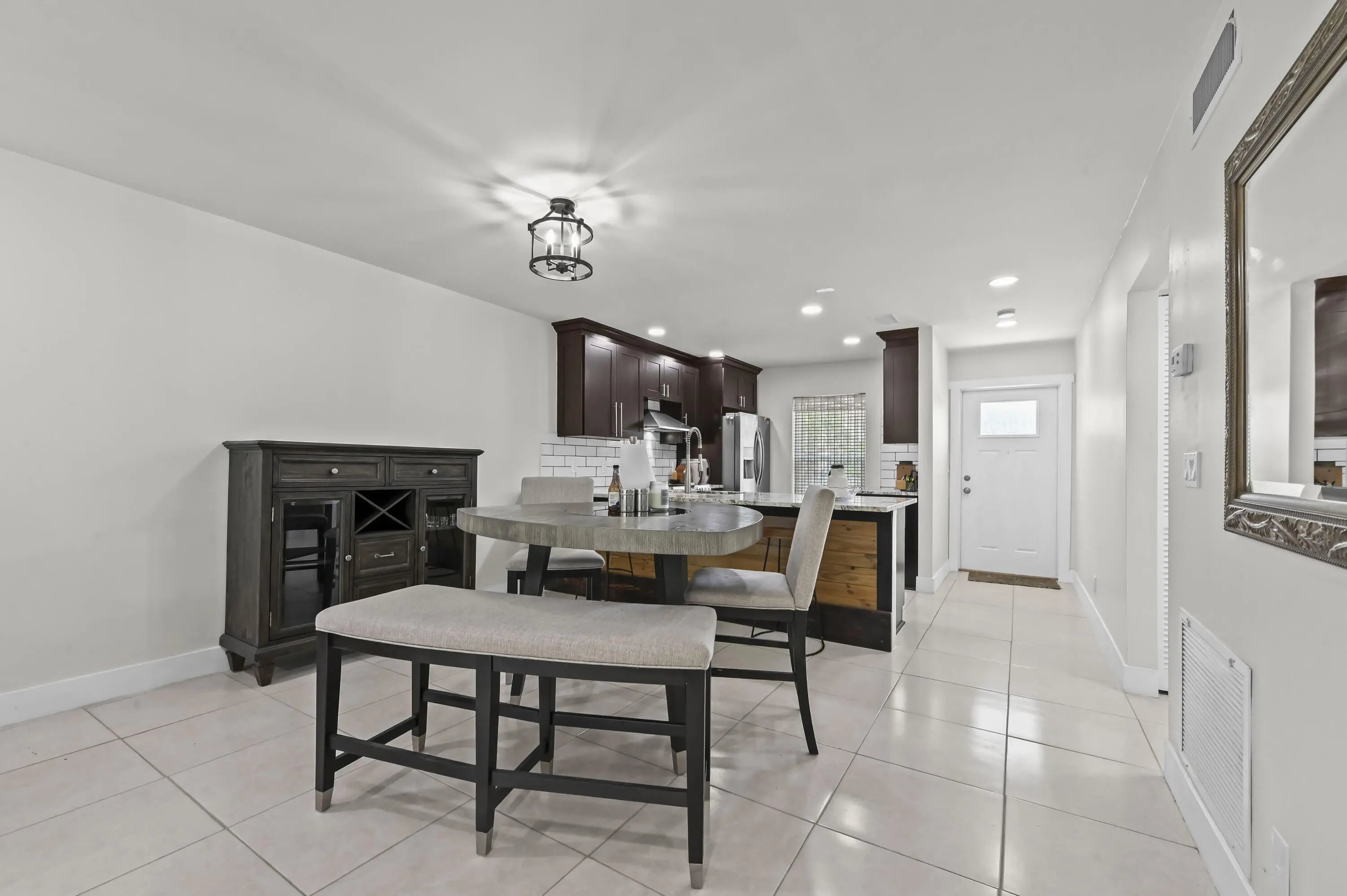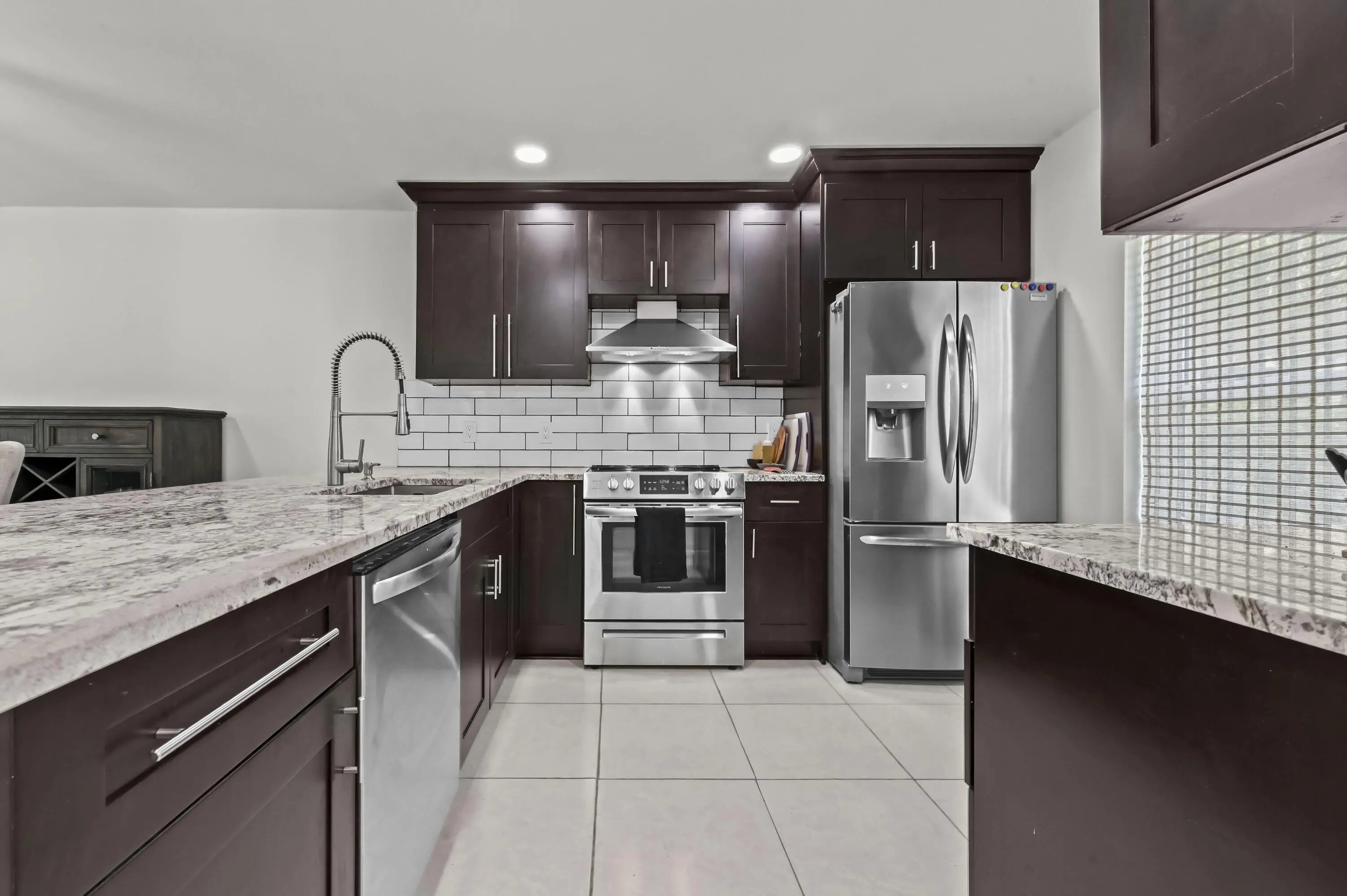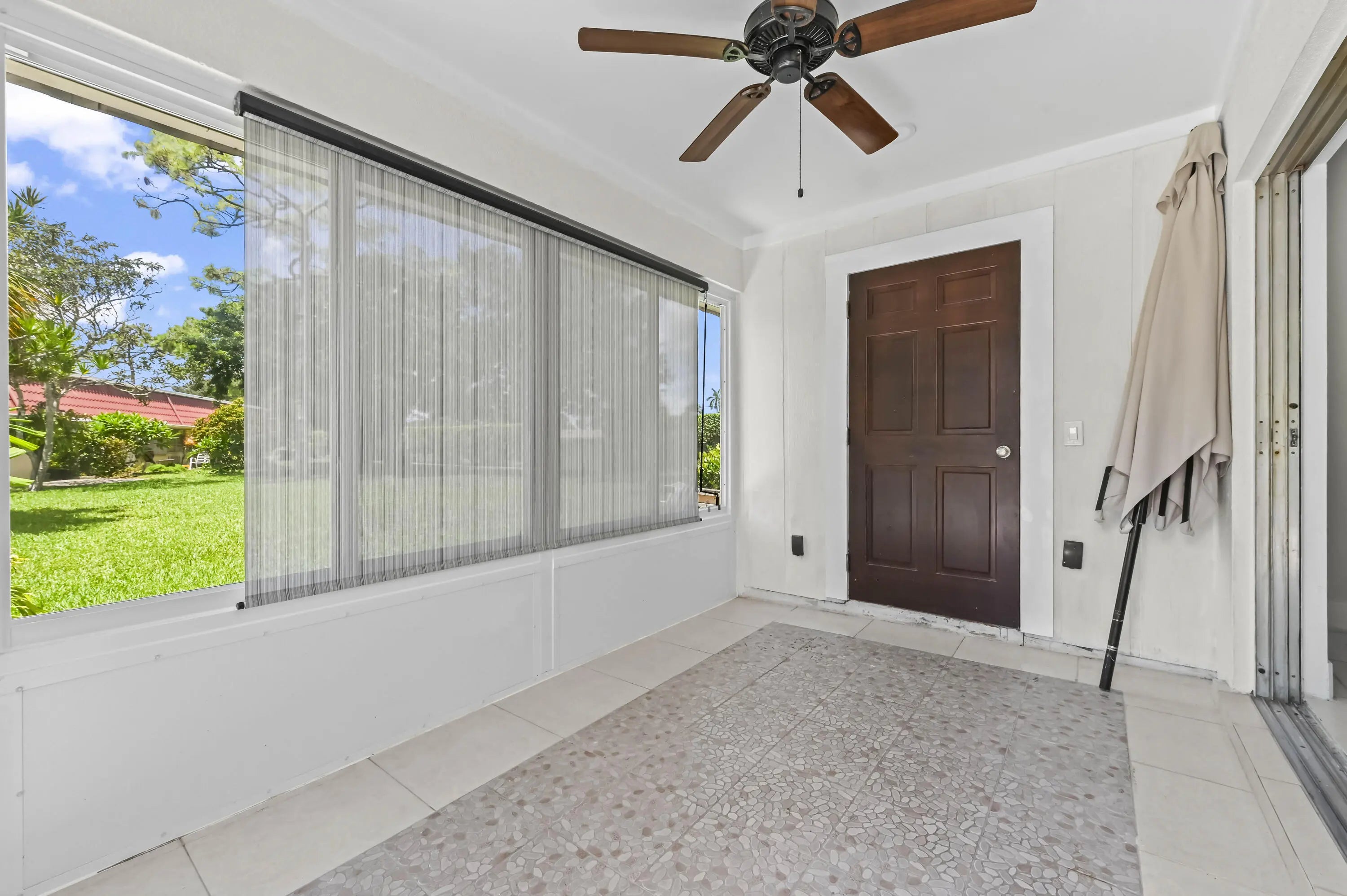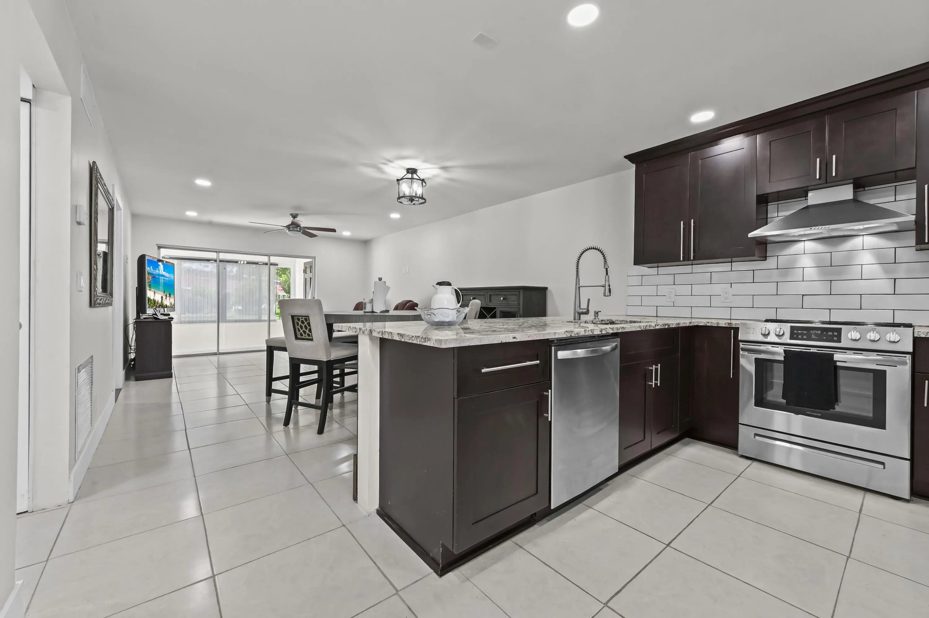 Step into this beautifully appointed villa, a stunning 2-bedroom, 2-bathroom residence that perfectly blends comfort with modern style. The open living areas are designed for seamless flow, creating a bright and inviting atmosphere. The kitchen is a true highlight, featuring sleek granite countertops, a stylish tiled backsplash, and recessed lighting that enhances both form and function. The main bedroom offers a private sanctuary, complete with a luxurious ensuite bathroom and a walk-in closet with an elegant barn door, adding a touch of rustic charm to this contemporary space. Enjoy year-round relaxation in the enclosed patio, featuring sliding impact windows that offer a perfect vantage point to take in the beautiful window treatments and a large, private backyard a rare find for condo living. The home also includes a storage closet with built-in shelves for optimal organization. Located within a well-maintained 55+ community, residents enjoy a wealth of resort-style amenities. Plus, with a prime location just minutes from fine shopping, diverse dining options, and much more, this home offers the ideal combination of peaceful living and urban convenience.
