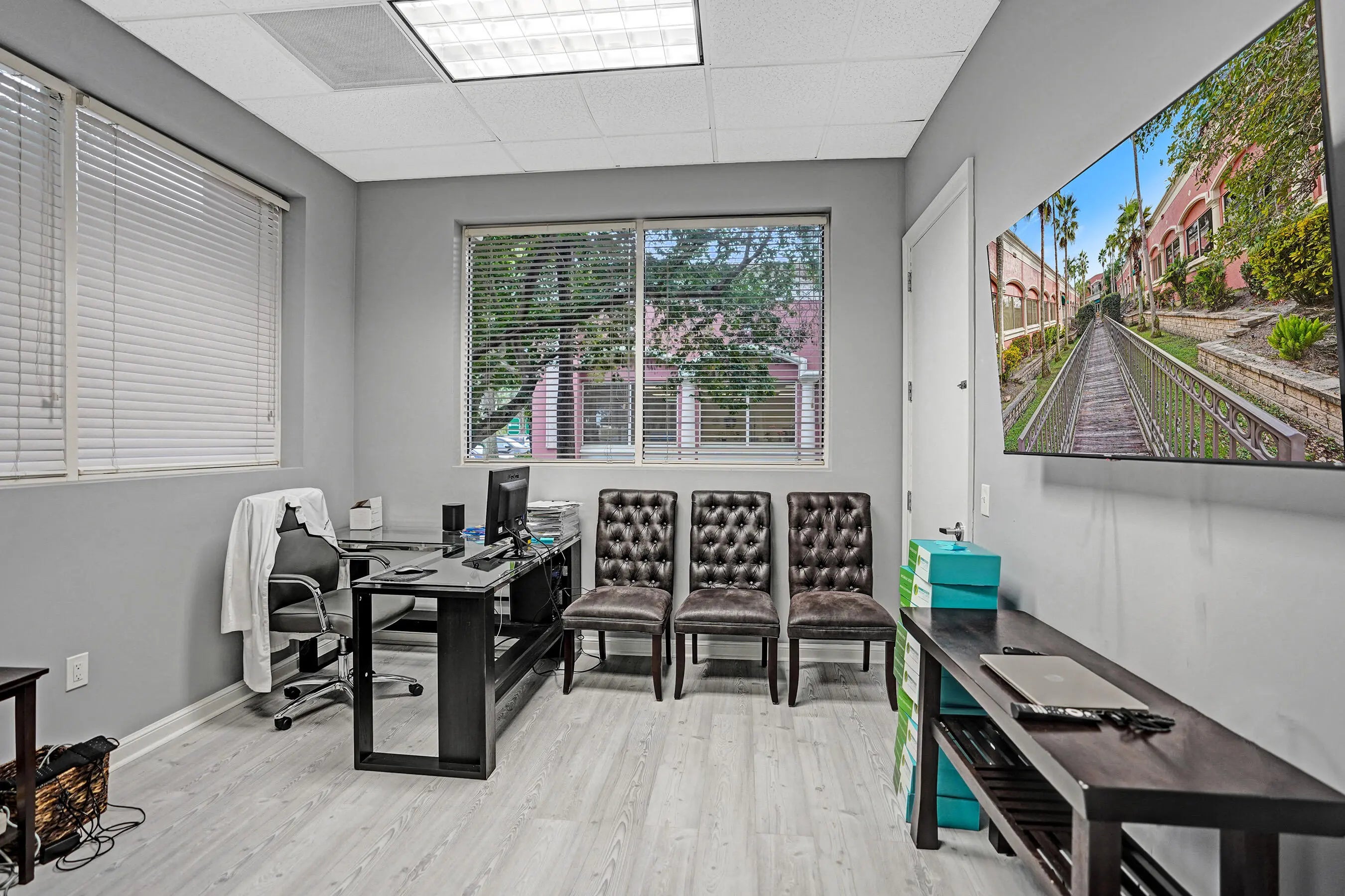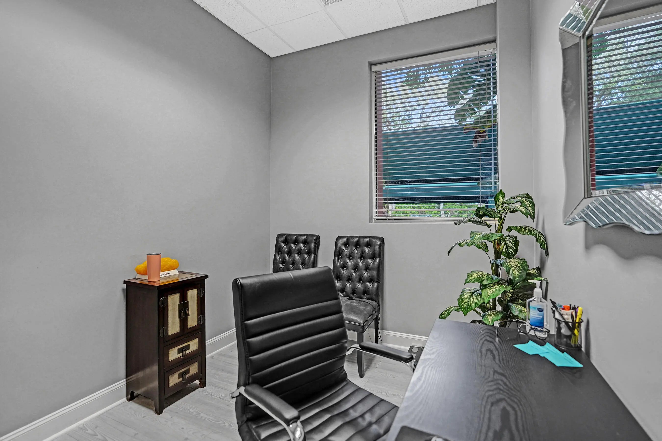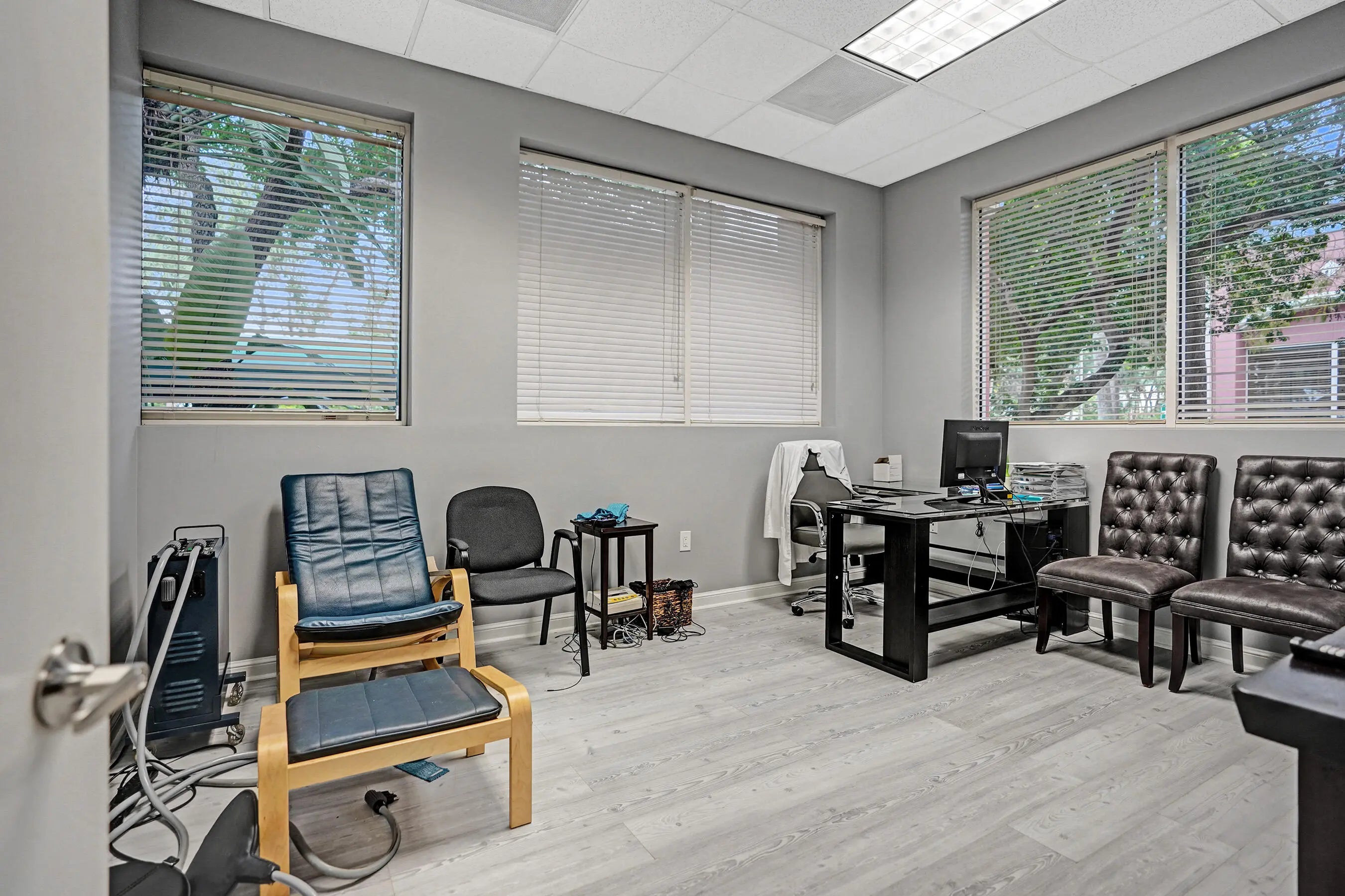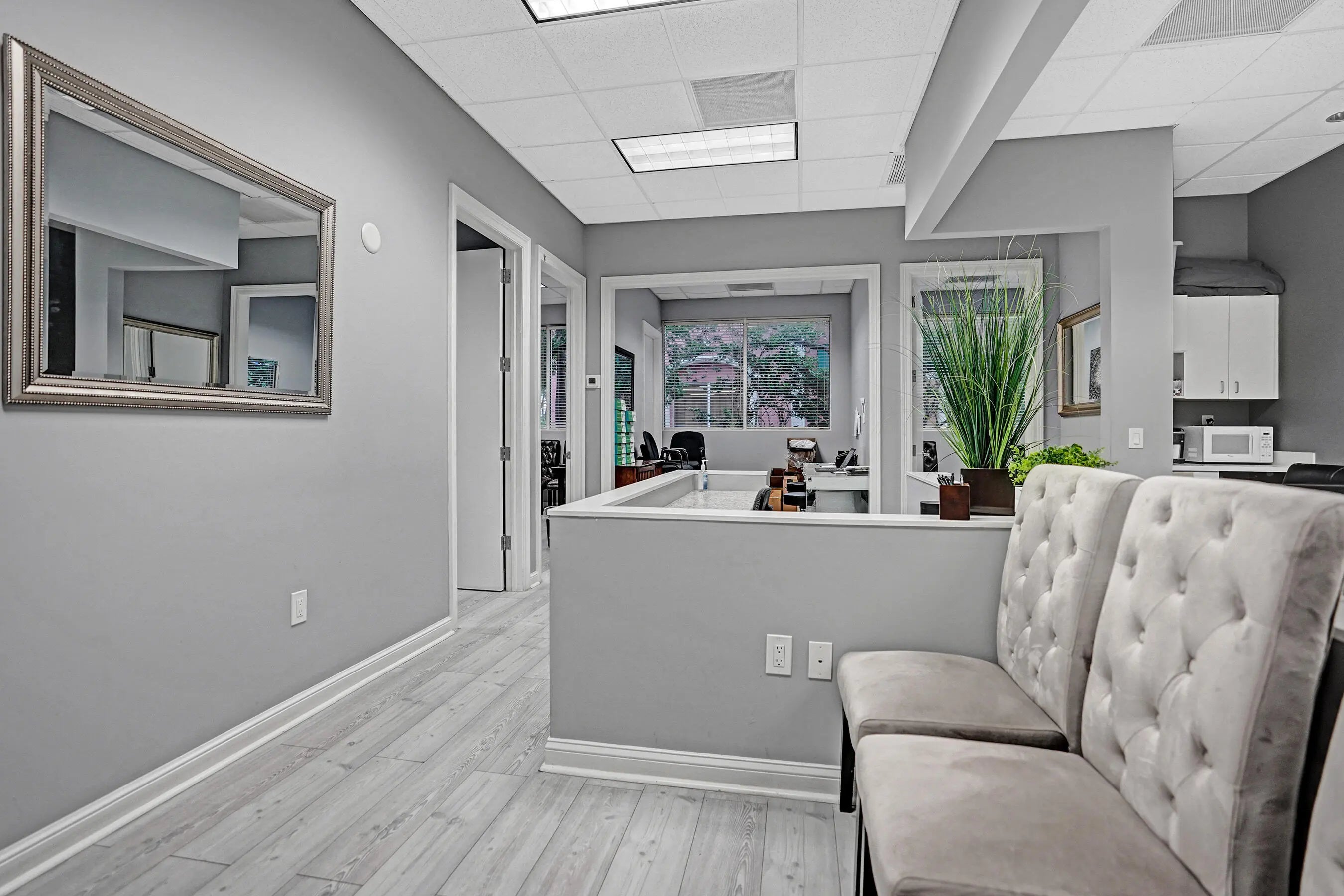 Suite #102 at The Addison features 4 private offices with additional open space that could be a conference room, plus dedicated reception desk, waiting area, & sink station. Great for professional or light medical uses. The recent improvements include updated flooring, lighting, Solid doors, paint, & trim. The suite also includes one (1) assigned and covered parking space, along with 100s of additional employee & visitor parking spaces. Restrooms and mailboxes are just steps down the hall and the campus grounds are kept in excellent condition (by onsite mgmt.) with scenic waiting areas great for any small business in Delray Beach. Very Easy to show with 1 hour notice, schedule a tour Today! Some of the office furnishings can be left; if that helps. Term is thru October of 2027