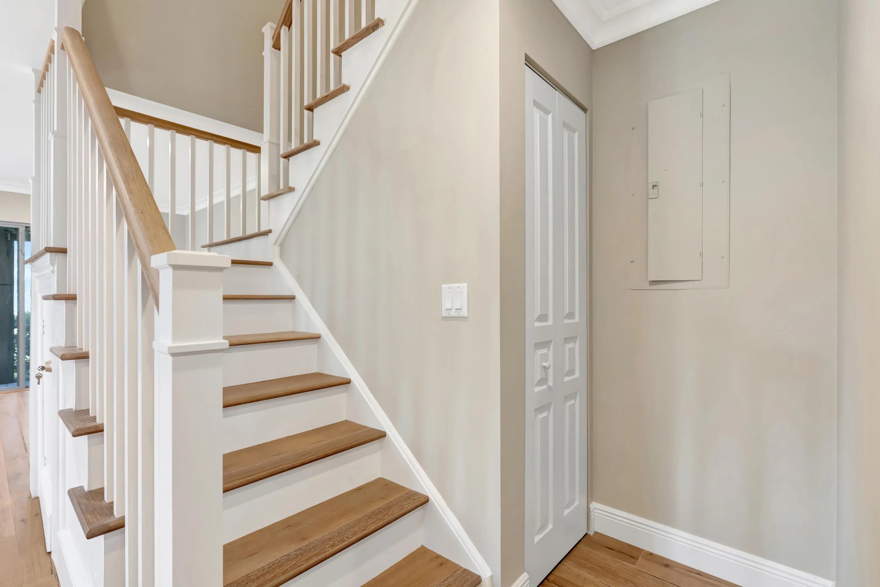 Welcome to Riverbend Country Club. A vibrant, active & social all-age, gated golf community nestled along the Loxahatchee River. Featuring an 18-hole par 64 course designed by Tom Fazio as well as tennis, pickleball, a large heated salt water pool and kiddie pool located at the clubhouse, along with the pro shop, locker rooms, library, card rooms, and a large screened-in patio great for relaxing or entertaining. This 2/2.5 duplex townhome has been completely upgraded. From the high-end luxury appliances and custom cabinetry in the kitchen to the luxuriously modernized bathrooms. A ground-floor entry with upper living space truly is one of the most desirable models in the entire community. Views from the balcony overlooking the 8th tee and most of the front 9 for as far as the eye can see. The owners spared no expense when updating this cozy corner unit. Kitchen features a luxury Italian induction cooktop and oven with stainless steel exhaust hood, Jenn-Air refrigerator with French doors and pull-out bottom freezer, a high-end dishwasher, microwave, and a built-in 33-bottle wine fridge. Quartz counters and pristine large white subway tile backsplash make this a home chef's dream kitchen. The entire home has been updated with hardwood flooring adding to it's rustic charm. The guest bathroom has been meticulously designed with a walk-in steam shower that can be safely controlled from inside or outside the bathroom, or remotely from your phone via built-in Wi-Fi. The shower has both an overhead rainfall head and a handheld. Master bath features marble tile, a rainfall showerhead, and double niches with a beautiful mosaic tile accent. All 3 bathrooms are enhanced by TOTO toilets and Kohler faucets and equipment. The entire home is supported by a premium water filtration system and a reverse osmosis system in the kitchen with a separate faucet for pure, clean drinking water. This is a must-see for the golf enthusiast or anyone looking for peace and tranquility, whether it be year-round or purely as a vacation home; you'll never want to leave. Snowbirds' dream home with the protection of a 24-hour manned guard gate. Safely close up for the season and come back next season without ever having to think about the security of your home and possessions. Truly is a remarkable community, less than 10 minutes to shopping and dining, and close to Cato's Bridge across to Jupiter Island and some of the most beautiful beaches Florida has to offer. 5 Star dining or local favorites can be found nearby in every direction. Enjoy a night out along Love St, a collection of restaurants across from the Jupiter lighthouse and right on the IntraCoastal.