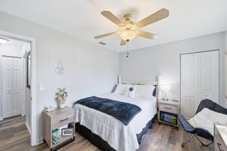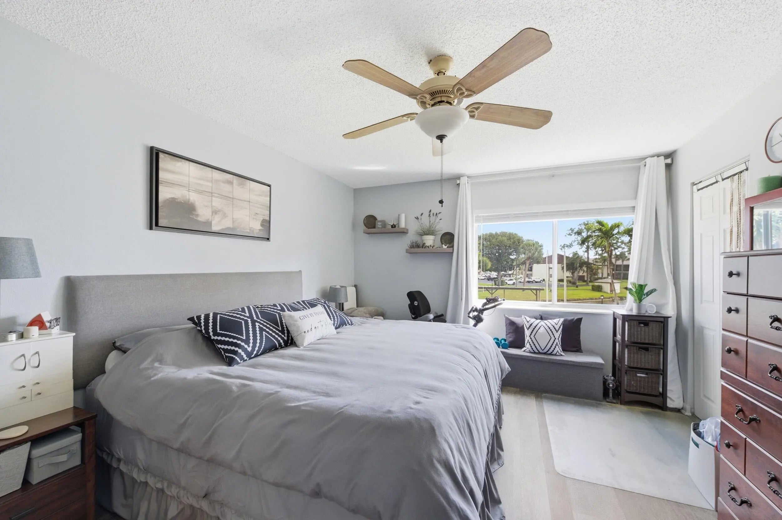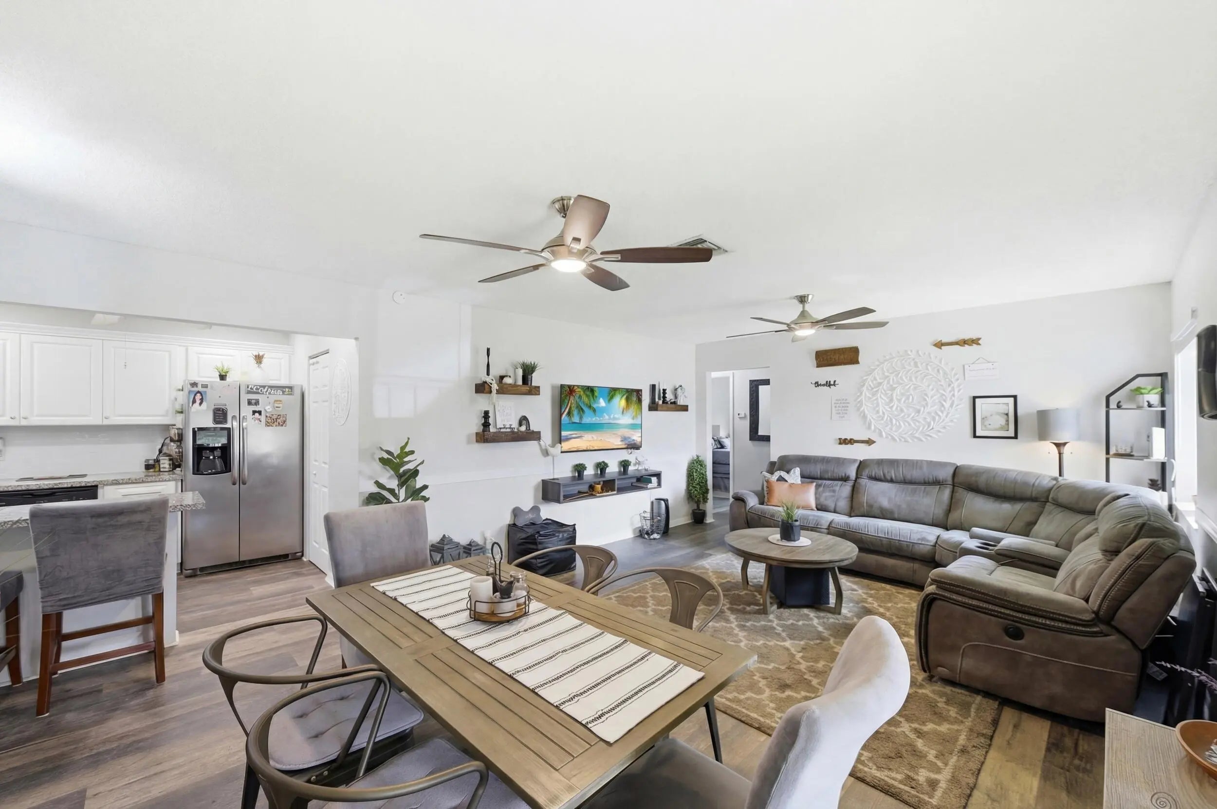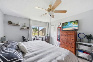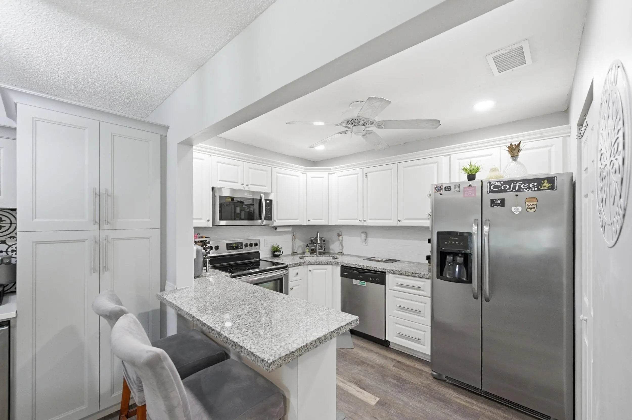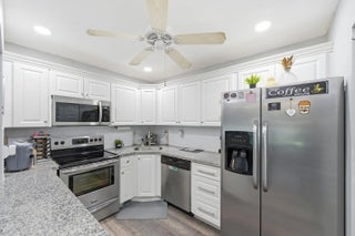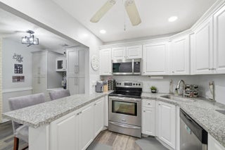 Welcome to La Pinata a 55+ community! This beautifully renovated and maintained 2-bedroom, 1.5-bath condo is ideally situated in a prime location just steps from the clubhouse and pool, offering both convenience and added privacy. Stylish décor has a neutral color palette with laminate flooring throughout and an updated kitchen designed to impress, featuring granite countertops, stainless steel appliances, a tiled backsplash, pull-out cabinetry and a dedicated coffee (or wine) bar. Enjoy year-round comfort and peace of mind with UV window film, which helps reduce heat and glare, protects furnishings from fading, and can improve energy efficiency. Accordion shutters on all windows provide quick and reliable storm protection which can help lower insurance costs. The second-floor location offers additional advantages, including enhanced privacy, improved natural light, and added security, along with reduced exposure to ground-level moisture. Major updates include a new roof (2025) and water heater (2025), with the A/C replaced in 2017 and a newer electrical panel already in place. Recessed lighting adds a modern touch throughout the home. The bedrooms both features walk-in closets, while the bathroom includes a convenient step-in shower. Washer & Dryer are located in the walk in closet off kitchen with additional shelving for pantry items or extra storage space. Relax on your private enclosed patio with a storage closet for extra convenience. Furniture is negotiable, making this a truly move-in-ready opportunity.