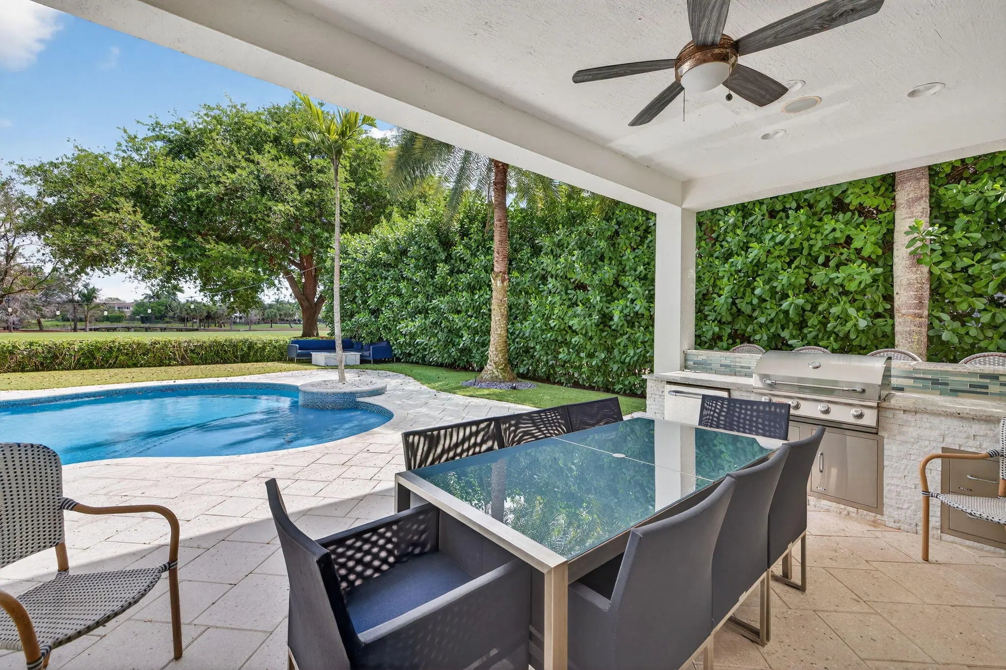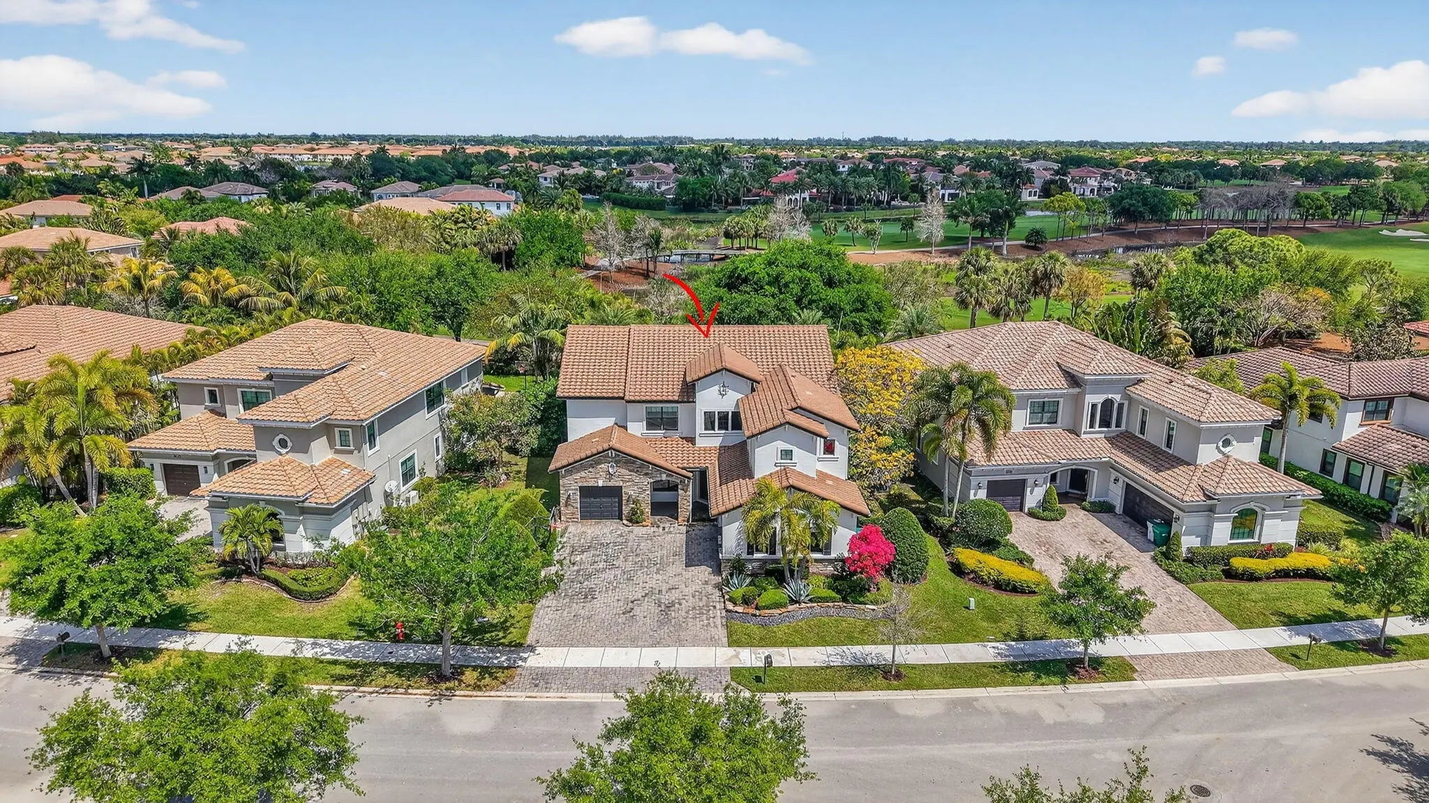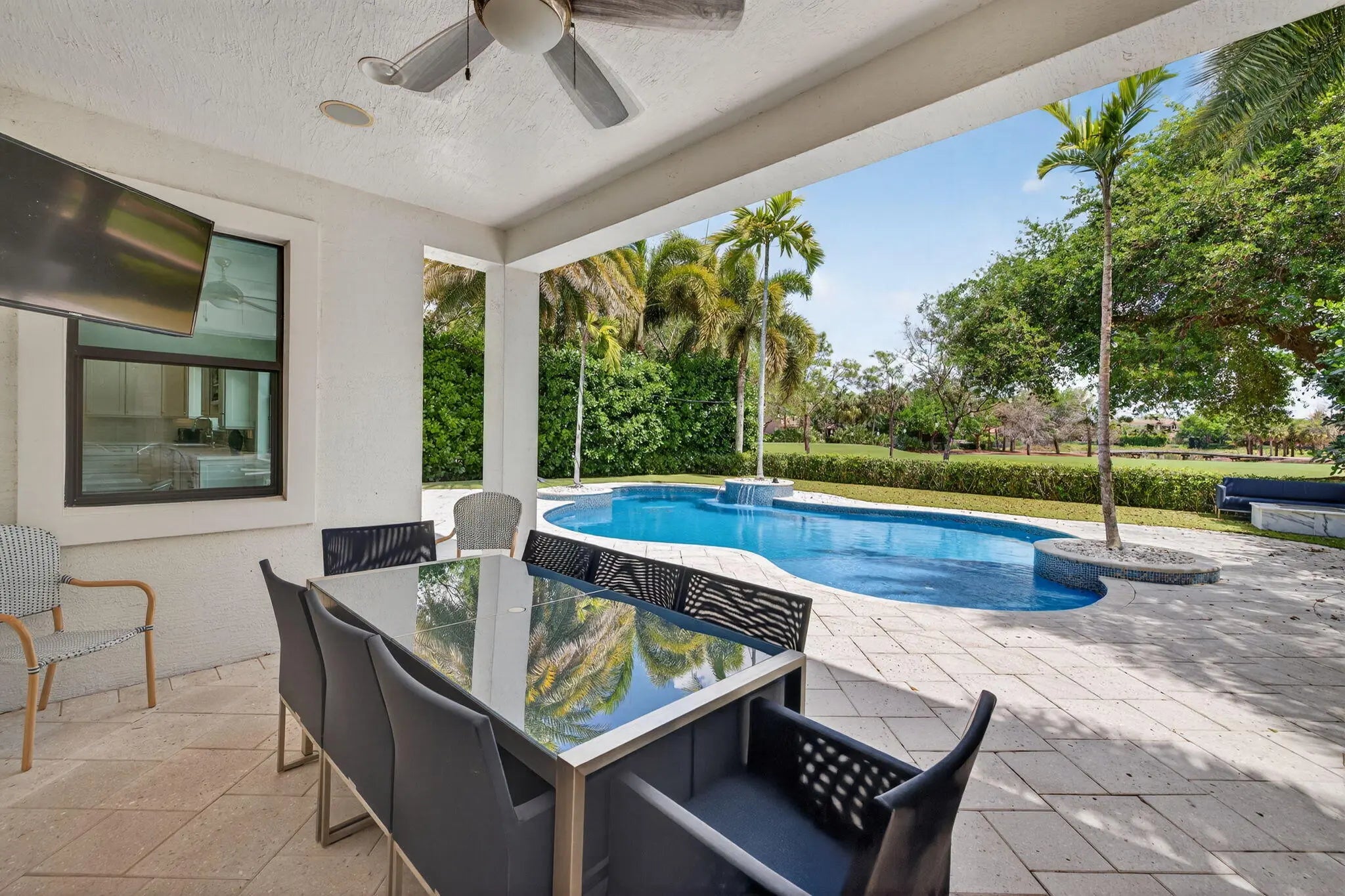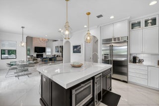 Situated on the 13 hole of the golf course with a view that overlooks multiple fairways, this upgraded Bolano offers 4,262 living square feet of thoughtfully designed living space with 4 bedrooms, plus office and playroom, 5.5 bathrooms, and a 2-car garage plus a separate golf cart garage. The first floor features a two-story foyer and great room with fireplace, creating an open and airy layout filled with natural light. The gourmet kitchen includes updated countertops, backsplash, modern fixtures, a built-in beverage cooler, a walk-in pantry, and flows into the breakfast area and main living space. A formal dining room, private office, movie room, powder room, and separate laundry room complete the first floor. See supplement for more details. Upstairs, the home offers a spacious primary suite with a walk-in closet and a spacious bathroom featuring dual vanities, a soaking tub, and a separate shower. Additional bedrooms are well-sized and all en-suite, and a loft area that can be used as a secondary living space, playroom, or media area. Recent interior improvements include new kitchen countertops, updated lighting fixtures, custom built-ins, upgraded cabinetry hardware, wallpaper and interior finishes, a built-in desk in the office, and fresh interior and exterior paint. Additional upgrades include a new HVAC system, updated electrical with EV charger installation, in-ceiling speakers for surround sound entertainment, renovated powder bathroom, elevated window treatments, and garage storage enhancements. The outdoor space has been improved with pool and backyard upgrades, turf and landscaping enhancements and firepit and summer kitchen, offering a functional, fun and private setting for everyday use and entertaining. This is truly a dream house! Initial mandatory sports club initiation is $10,000 and HOA capital contribution is $1,750.