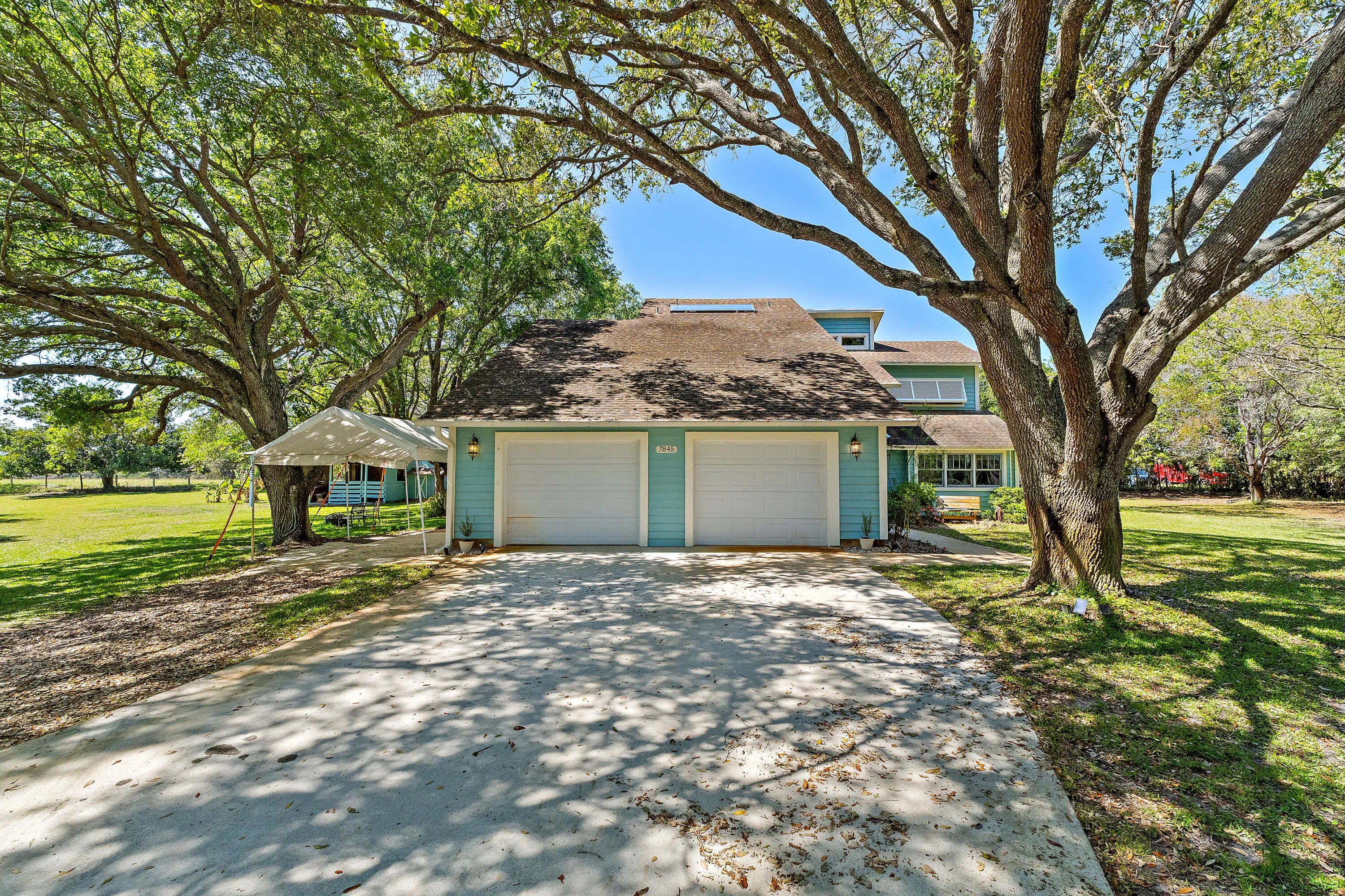 Tucked away on a private 1.2-acre lot in Palm Beach Country Estates, this two-story, 4-bedroom, 3-bath home offers a rare blend of natural beauty, space, and understated farmhouse-inspired charm. Backing to the C-18 canal, the property enjoys a peaceful, secluded setting with serene views and exceptional privacy. Inside, warm architectural elements set the tone, including pecky cypress ceilings and a striking two-sided fireplace connecting the living and dining areas—creating a cozy, inviting focal point. A second fireplace in the primary bedroom adds to the home's character, while a private balcony off the suite captures tranquil views of the canal and surrounding landscape. The cedar-sided exterior enhances the home's natural, farmhouse-inspired aesthetic, while the expansive lot provides endless possibilities—whether you envision a more refined modern farmhouse look or prefer to bring your own unique design vision to life. Additional features include partial impact glass protection, a 2019 HVAC, 2022 water heater, 2012 roof, and a two-stall pole barn stable, offering flexibility for equestrian use, hobbies, or additional storage. A rare opportunity to enjoy privacy, land, and lifestyle in one of Palm Beach Gardens' most desirable acreage communities.