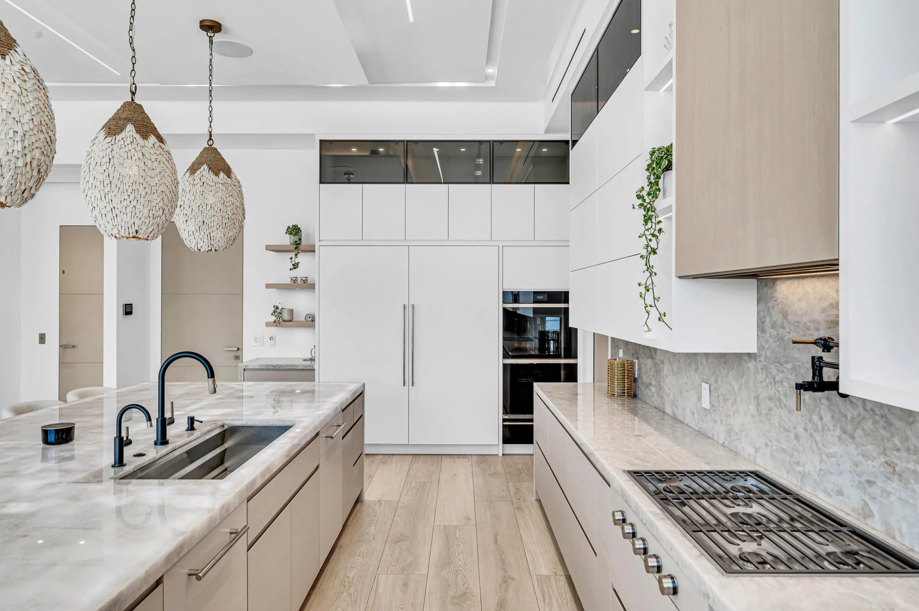 A Statement of Modern Luxury, Tranquil, & Thoughtfully Designed for Family Living. New construction architectural triumph by Marcello Penso, worked with Gianni Versace NYC, exceptional east-facing waterfront estate with over 8000 total sf with 100ft of waterfrontage, extended dock, step down, 100 amp service, 40k boat lift ready, and an impressive garage accommodating up to eight cars. Constructed with uncompromising precision using poured-in-place concrete, the residence showcases a stunning Cristallo Quartzite kitchen island, a floating fireplace, level-five knife-edge drywall ceilings, over 86 slabs of wall coverings, an illuminated wine display, & an elevator servicing all levels, including garage. Designed for the discerning few who demand nothing less than perfection.