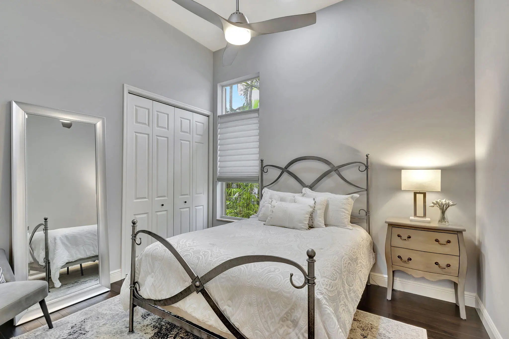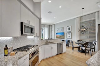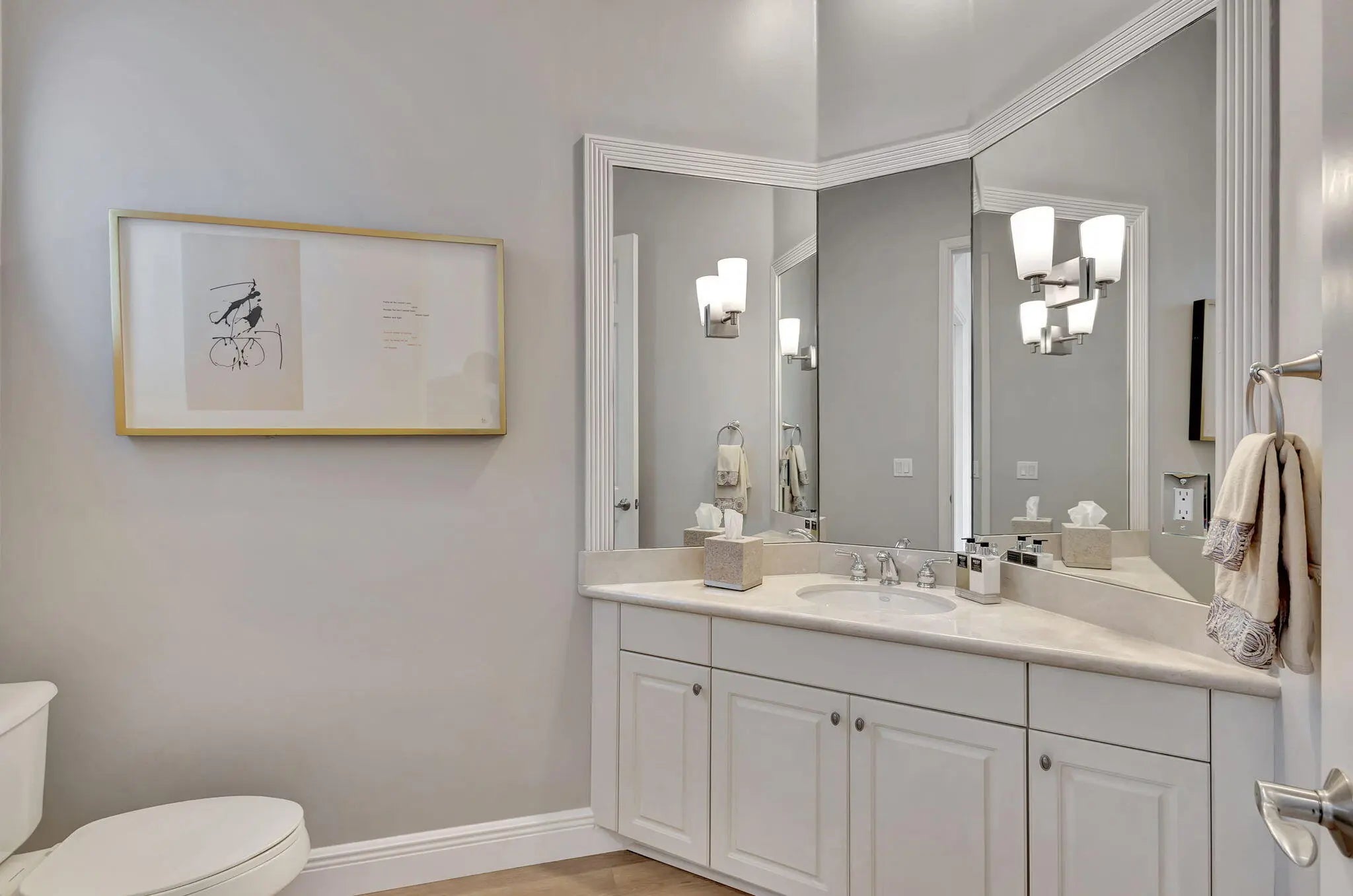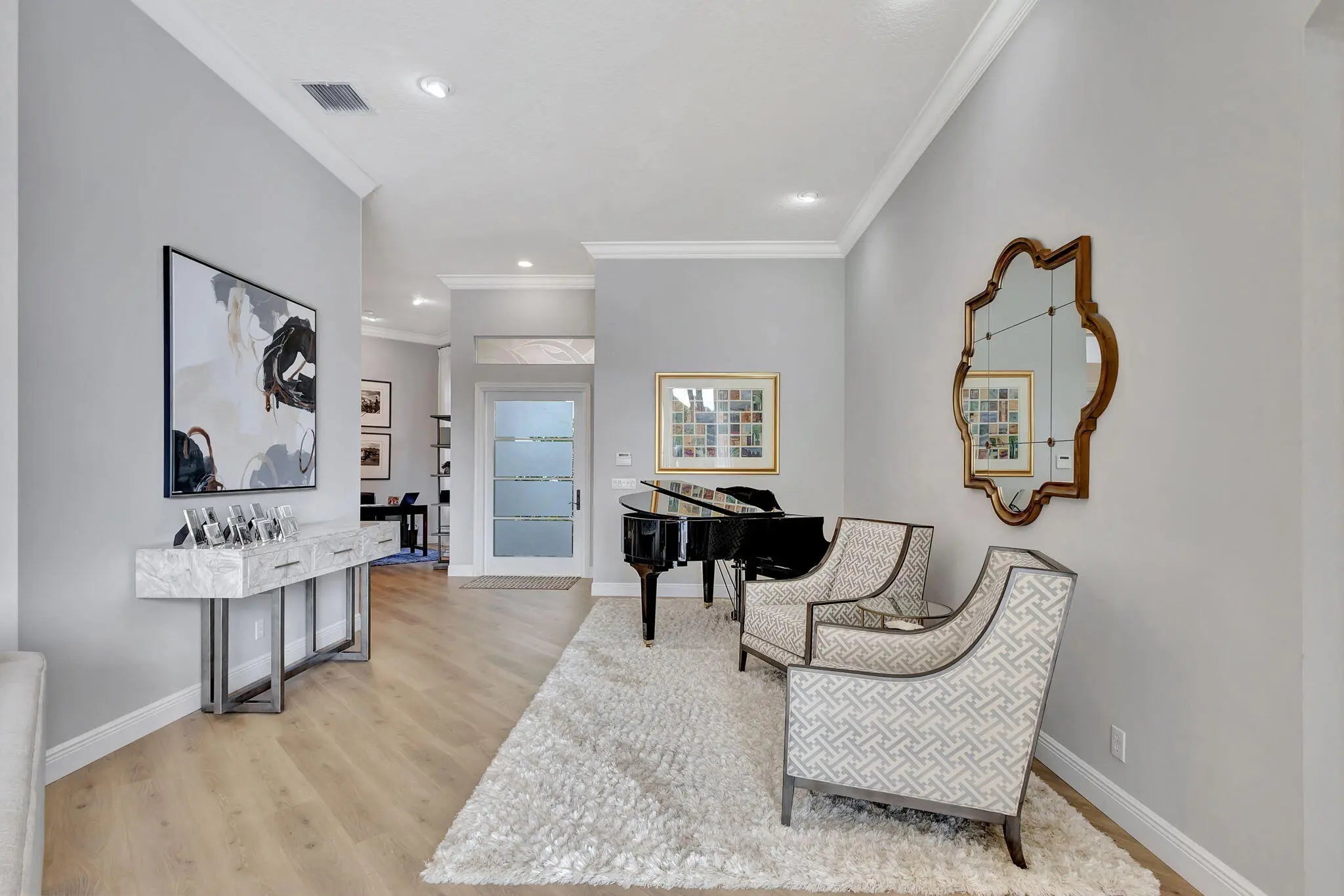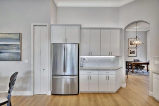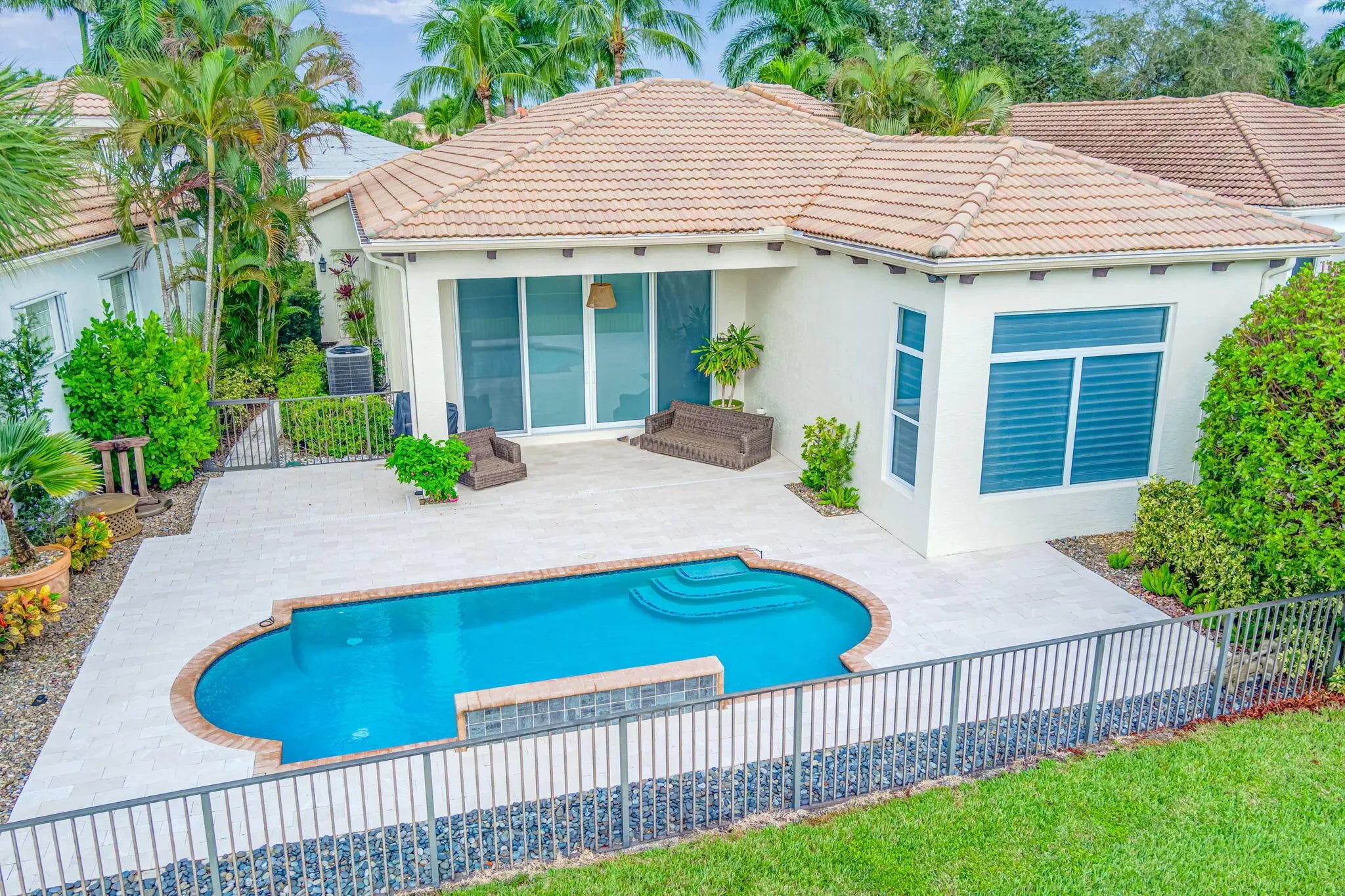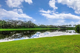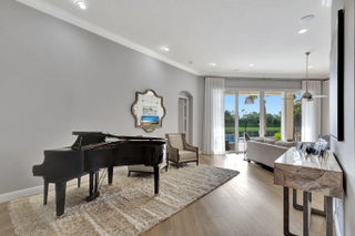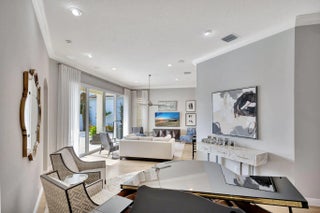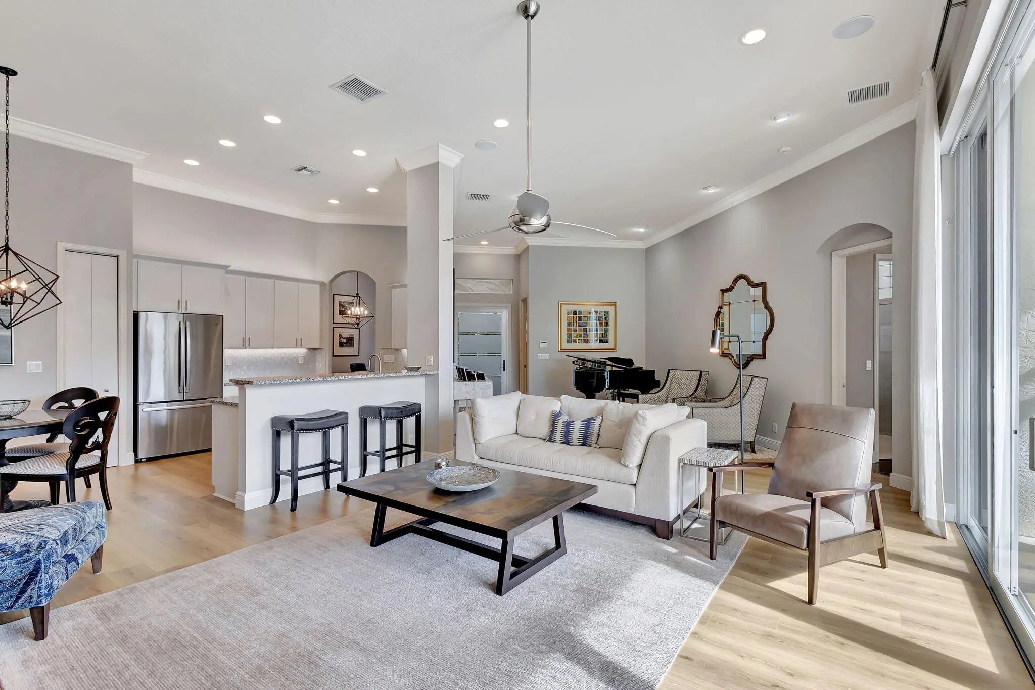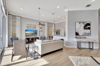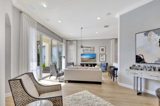Located in the highly desirable community of The Country Club at Mirasol, this beautifully updated Belize floorplan offers three bedrooms, two full baths, and a powder room, perfectly positioned to capture tranquil water views and the relaxed elegance of Florida living. Upon entering the home, you are welcomed by light-filled interiors, soaring ceilings, and a refined palette enhanced by fresh interior and exterior paint, crown molding, and designer lighting throughout. The main living areas feature attractive laminated flooring, while the bedrooms are finished with engineered wood flooring for warmth and continuity. The renovated kitchen is thoughtfully designed with newer cabinetry, updated countertops, a stylish translucent tile backsplash, and newer appliances including the refrigerator, range top, and dishwasher. The space opens effortlessly to the great room and dining area, creating an ideal setting for both everyday living and entertaining. Large windows and sliding doors frame beautiful water views and allow natural light to fill the living spaces. Hunter Douglas shades and motorized sunshades in the family room, along with designer drapery framing each window, add both elegance and functionality. The primary suite offers a peaceful retreat with custom closet built-ins and a well-appointed bath. Two additional bedrooms provide comfortable accommodations for family or guests. Outdoor living is equally appealing with a private patio and pool overlooking the water. The salt-chlorination pool system offers easy maintenance and enhanced swimming comfort. Additional upgrades and improvements include: • Impact windows and doors throughout (except for two large south-facing windows in the great room and dinette which are protected by hurricane shutters) • Hot water heater - 2023 • Newer lighting and ceiling fans • Newer washer and dryer • Custom closet built-ins • Designer window treatments, Sonos system and motorized shades This move-in ready residence combines thoughtful upgrades, bright interiors, and peaceful water views within one of Palm Beach Gardens' most sought-after private club communities. Sports membership