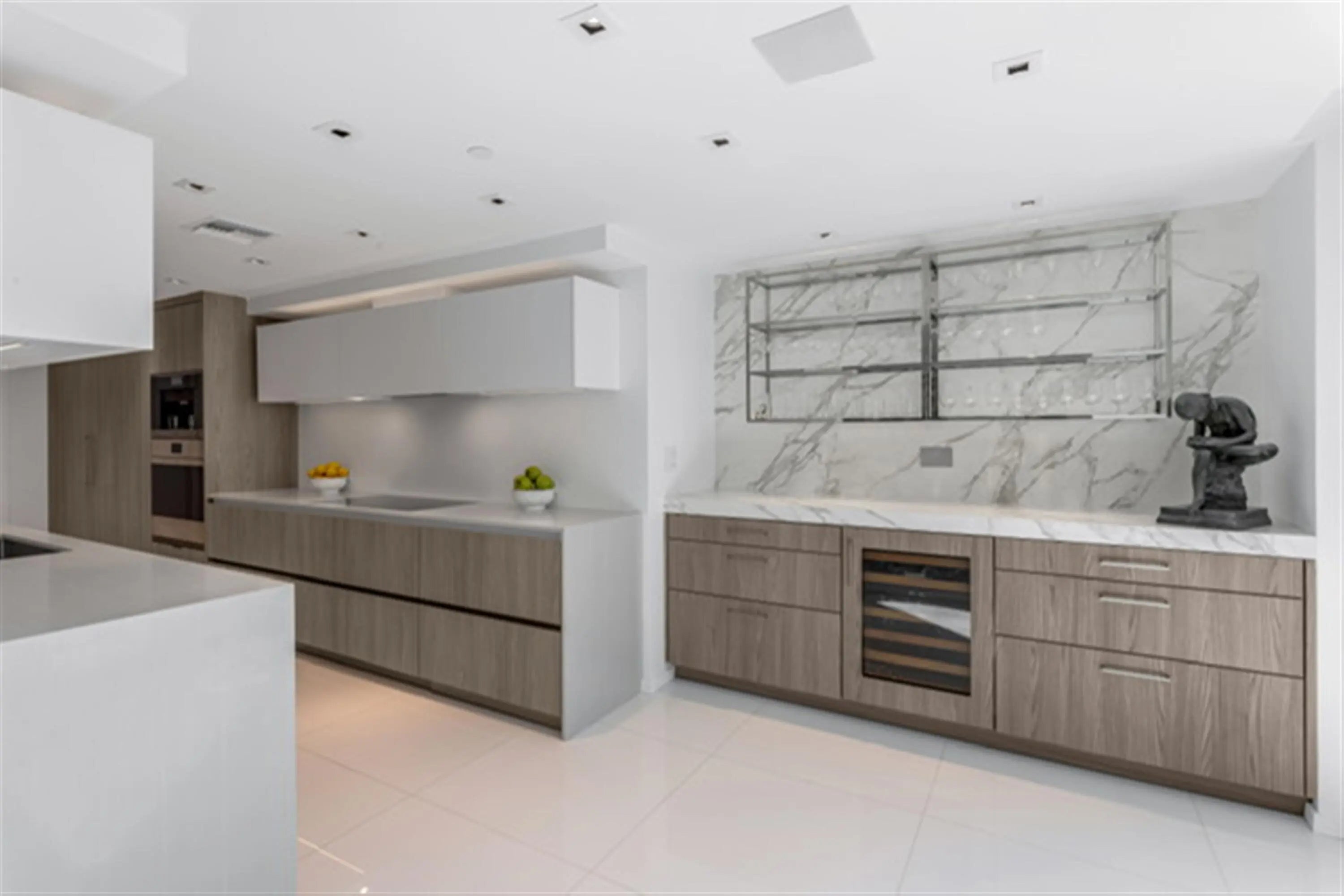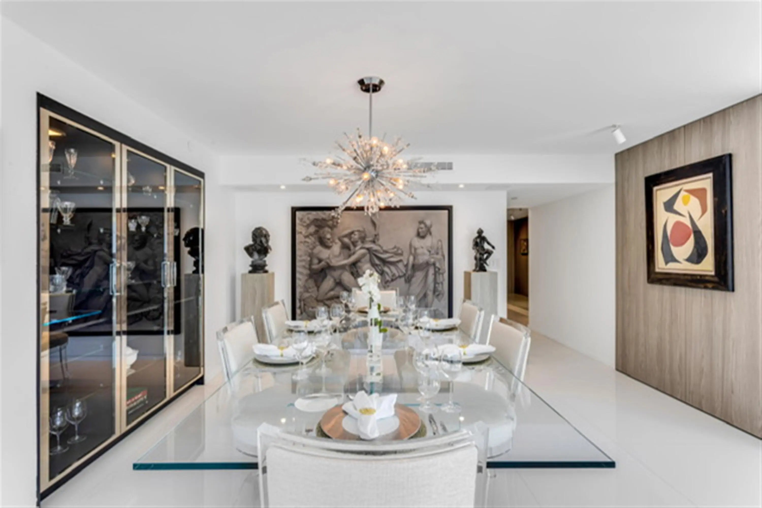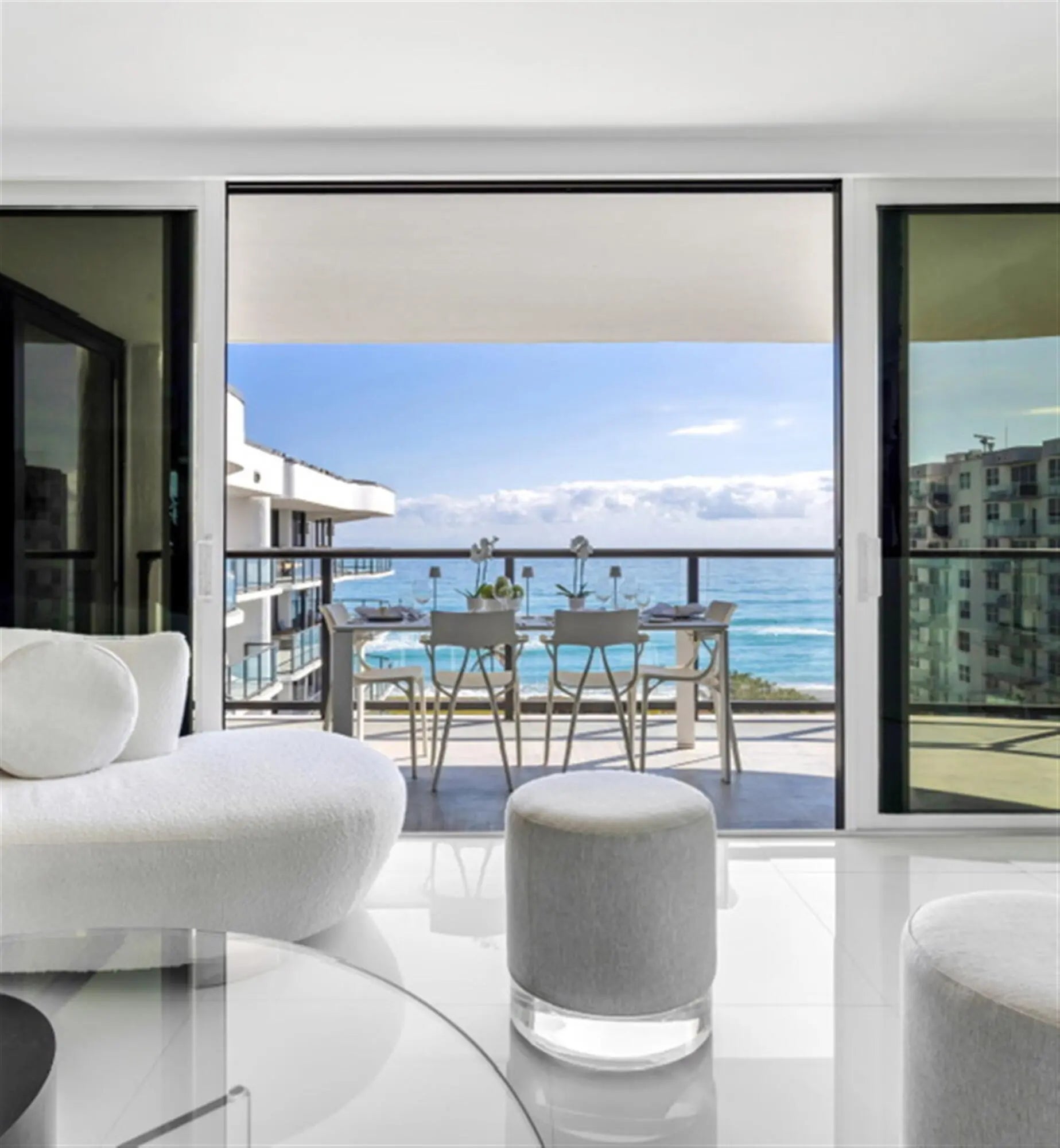 This penthouse oceanfront residence offers rare east-to-west exposure with direct water views from both sides, featuring unobstructed sunrise views over the Atlantic and breathtaking sunset views over the Intracoastal—no buildings across the street, just water and sky from every angle. The 2-bedroom, 2-bathroom home spans 1,886 square feet under air (2,450 total) and features expansive balconies on both sides, each over 50 feet long and up to 8.5 feet deep, creating seamless indoor-outdoor living directly on the beach. • Sub-Zero Refrigeration and Freezer Towers, Wine Refrigerator... • Custom Polished Nickel Dining Room Built-in Cabinet by SieMatic • Custom paneling throughout by SieMatic • White Glass Top Porcelain Floors Throughout • Polished nickel faucets and fixtures throughout by Franz Viegener • Master Bedroom Custom Sconces and Guest Bedroom Chandelier and Sconces all by Lobmeyr, Vienna...collector quality • Sonos soundbars mounted under credenzas in bedrooms • Entire Bespoke Dressing Room is fully glazed (glass front cabinetry) • Floating Beds both by Daniele Lago, Italy...underlit by SieMatic • Primary Bath has Two-Person Walk-in Shower with Starphire Glass Panels And A Soaking Tub • Guest Bath has Sonneman lighting and Starphire Glass Shower Enclosure Fully Furnished and Equipped Includes: • 2 restored curved sofas by Vladimir Kagan in Metaphores Paris White Boucle • Custom KravetCouture Pillows • Custom Starphire Glass Dining Table Seats 10 • Custom Lucite Upholstered Dining Chairs, Set 8 • Custom Starphire Glass Cocktail Table • Custom Lucite Floating Poufs, 2 • Haviland Fine China, Custom Order, Set for 8 • Christofle Acier Flatware, Set for 10 • All-Clad Chefs Selection of Cookware • Top Quality Kitchen Accessories • Full Bar: Stemware by Spiegelau, wine accessories • New Dyson Vacuum Cleaner • Tabletop: placemats, linens • Bed: Linens by Frette, Primary Bed Mattress by Duxiana • Bath: Towels, Bath Mats by Pottery Barn • Master Bedroom Lamps Signed Romeo Rega, Skyscraper, Rare pair in polished nickel, 1970's, collector quality • Guest Bedroom Lamps Signed Romeo Rega, Halston Era, Rare pair in Lucite, Polished Nickel and Stainless All artwork and pedestals are available for sale.