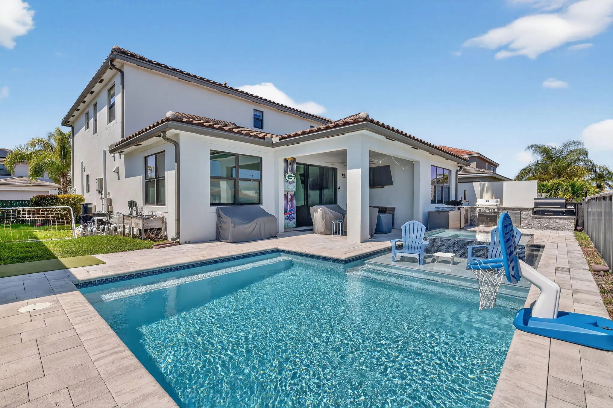 South Florida luxury living at its finest. Welcome to this exceptional 6-bedroom, 4-bath residence in the highly sought-after Villamar at Toscana Isles. Built in 2021, this expansive home offers modern construction, a thoughtfully designed layout, and a refined blend of comfort and style. A 6-bedroom floor plan provides versatility not commonly found in South Florida. The interior features spacious living areas, abundant natural light, and a seamless flow throughout. The outdoor living experience stands out with a private backyard retreat complete with a pool, built-in spa, and outdoor kitchen, creating a resort-style setting. Located in a gated community near shopping, dining, and major roadways.
