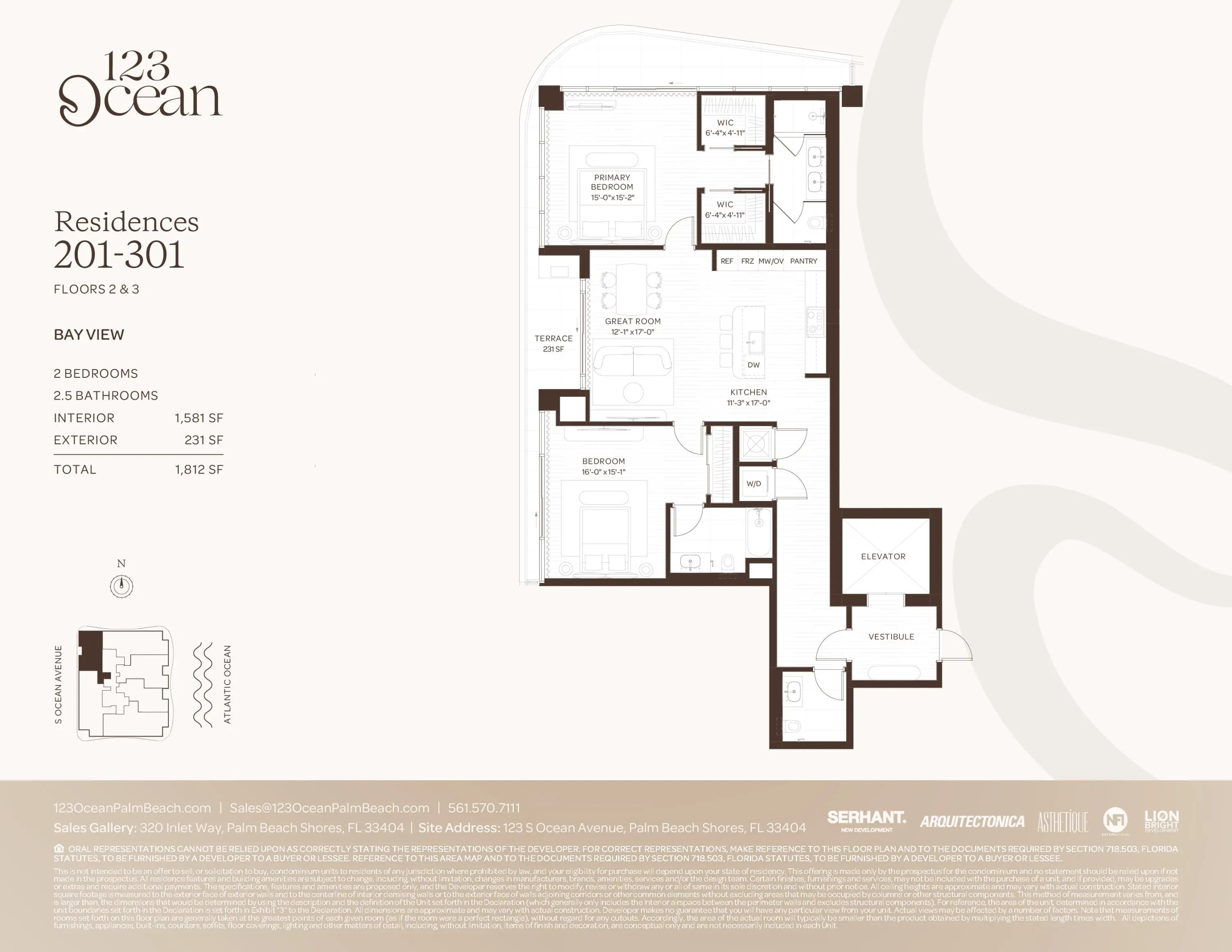 Introducing 123 Ocean. Oceanfront Serenity. Elevated Palm Beach Shores Living. This west-facing 2-bedroom plus den, 2.5-bath residence offers a refined coastal lifestyle with a bright, open layout and expansive terrace designed for seamless indoor-outdoor living. Enjoy private, direct beach access just moments from dining, marinas, and the best of Palm Beach Shores. Interiors feature a sophisticated palette of white oak, woven textures, and soft brass accents, complemented by a private elevator vestibule and a split-bedroom floor plan for optimal privacy. The sunlit living and dining areas open effortlessly to the terrace. The chef's kitchen is both functional and striking, featuring custom cabinetry, a sculptural peninsula, a custom bronze hood, and fully integrated Gaggenau appliances. The primary suite is a serene retreat with a spacious walk-in closet and spa-inspired bath, complete with a double vanity, porcelain feature wall, and rainfall shower. The secondary bedroom includes an en-suite bath, while the den offers flexible space for a home office or additional living area. 123 Ocean is a boutique six-story oceanfront development by Lionbright Development, with architecture by Arquitectonica and interiors by Asthetique. Amenities include a 24-hour attended lobby, secure underground parking, resort-style pool and sun deck, fitness studio with infrared sauna and ice bath, resident lounge, media room, and children's playroom. Minutes to Palm Beach Island, downtown West Palm Beach, and Palm Beach International Airport.