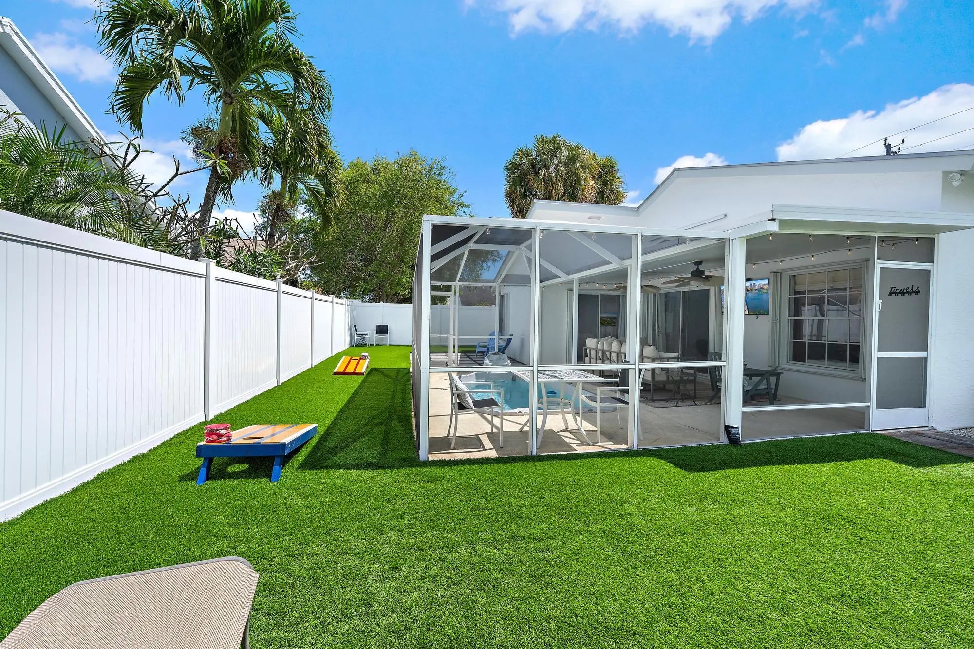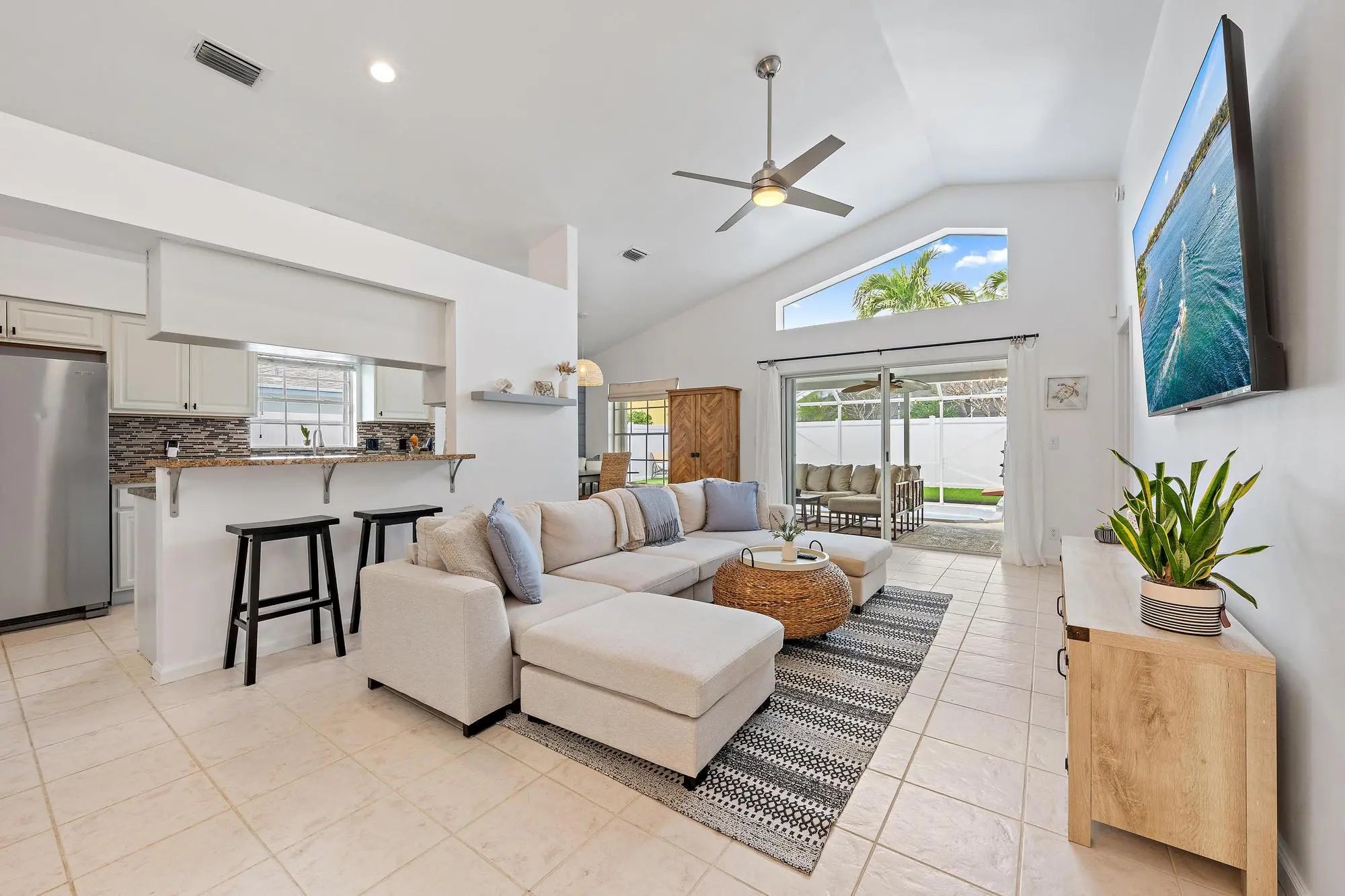 Beautifully maintained CBS home in the Heights of Jupiter with no HOA and A-rated schools! This 3-bedroom, 2-bath, 2-car garage home features an open floor plan, vaulted ceilings, and abundant natural light. The updated kitchen includes white cabinets, granite countertops, updated appliances, and a breakfast bar. Enjoy a split floor plan for privacy and updated bathrooms with modern finishes. Step outside to a screened patio, oversized in-ground spa, and a fully fenced yard with artificial turf. Located near Abacoa, Roger Dean Stadium, golf, dining, and Jupiter beaches. This move-in ready home is perfect for full-time living, seasonal use, or investment.