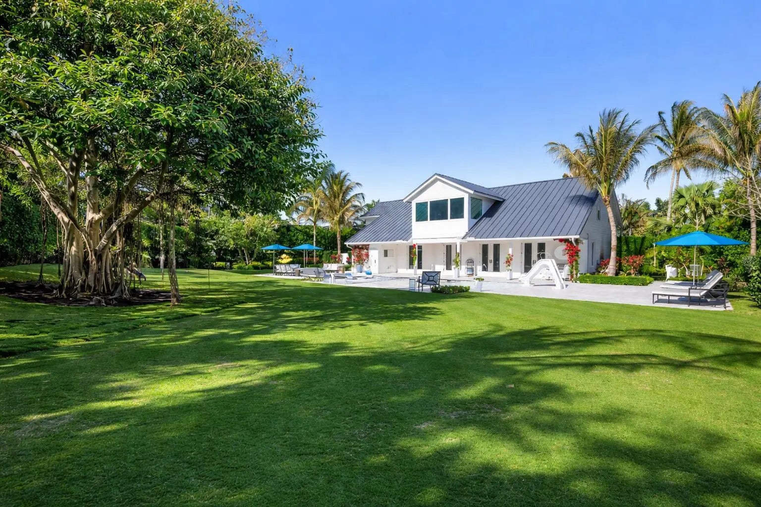 Tucked away on over half an acre in one of Hobe Sound's most desirable settings, this fully reimagined residence offers a rare blend of elevated coastal living and uncompromising design quality. Taken down to the studs and rebuilt in 2020, the 4,000 SqFt home was thoughtfully designed with CBS construction, steel interior walls, and steel trusses, delivering a level of quality and durability seldom found at this price point. Inside, the bright, open 3 bedroom, 2.5 bathroom layout feels both expansive and intentional, and the kitchen and dining spaces connect seamlessly for effortless entertaining. Clean lines, natural light, wide-plank oak floors and a refined material palette create a home that feels both luxurious and genuinely livable. The kitchen is both functional and beautifully appointed, featuring Thermador and Fulgor Milano appliances, including a dual-fuel gas range, and anchors the home's central living spaces. The finishes throughout have been selected for a modern yet timeless aesthetic. All bedrooms are situated upstairs, including a spacious primary suite designed as a true retreat with vaulted ceiling, fireplace and spa-like ensuite with Calcutta marble tile. Outdoors, the property transforms into a private resort-style setting. This tropical compound nestled within a canopy of royal palms and lush mature landscaping is complete with an outdoor kitchen, newly constructed saltwater pool and spa (both heated and cooled), and expansive patio designed for year-round enjoyment. Here hosting or unwinding is available in complete privacy. The lush landscaping is supported by a commercial-grade irrigation system, creating a grounds experience that feels both established and meticulously maintained. Every detail of this residence has been considered, from the standing seam metal roof (installed in 2020 with added strapping for insurance benefits), to hurricane-rated triple-pane Low-E windows, an impact-rated garage, integrated security, and surround sound that extends from the front porch to the backyard. This is a rare opportunity to own a fully rebuilt, design-forward home where quality, comfort, and setting come together seamlessly located just minutes from the best of Hobe Sound and the surrounding coastal lifestyle including pristine beaches, Jonathan Dickinson State Park, and the shops and dining of Bridge Road.