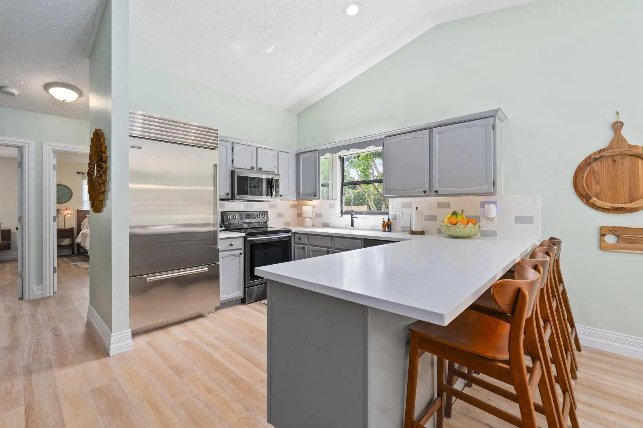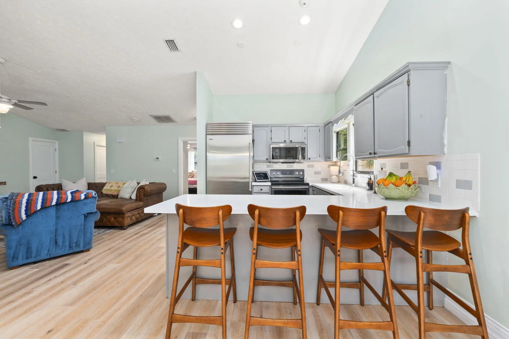 3BR/2BA pool home with office on a corner lot in Jensen Beach with a no restriction HOA. Open, light-filled layout with vaulted ceilings and seamless flow between living, dining, and kitchen areas. Features include new wood flooring throughout, Sub-Zero refrigerator, and updated bathrooms with dual sinks in the primary suite. Dedicated office offers a great work-from-home setup, along with a spacious dining room ideal for entertaining. Private, fenced backyard with pool creates the perfect outdoor living space. Impact windows and doors along the rear of the home, full-house generator, and complete storm protection provide added peace of mind. 2-car garage and room for boat or RV. Conveniently located close to beaches, marinas, shopping, dining, and downtown Jensen Beach.